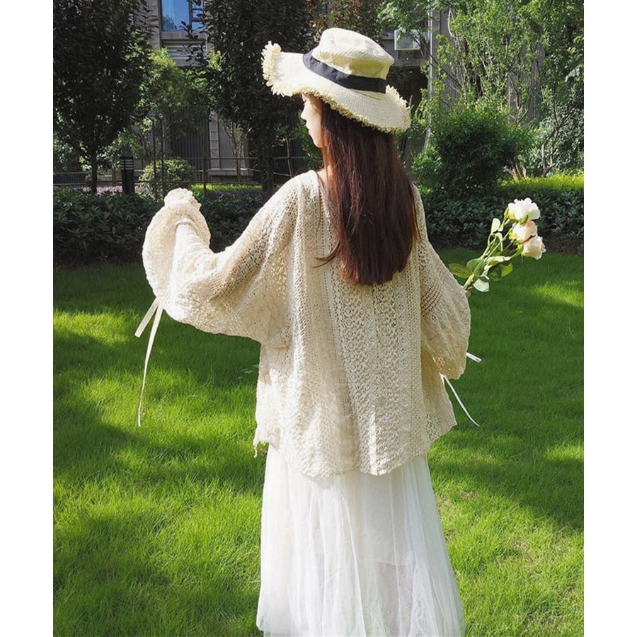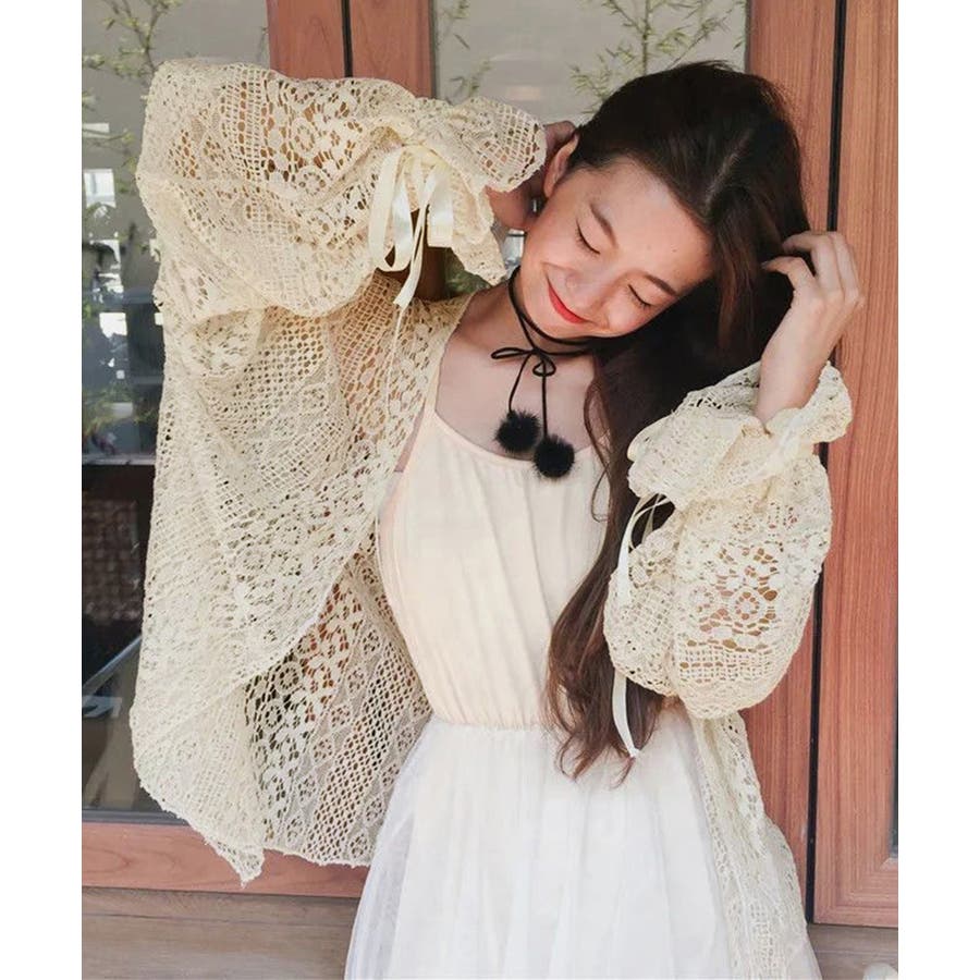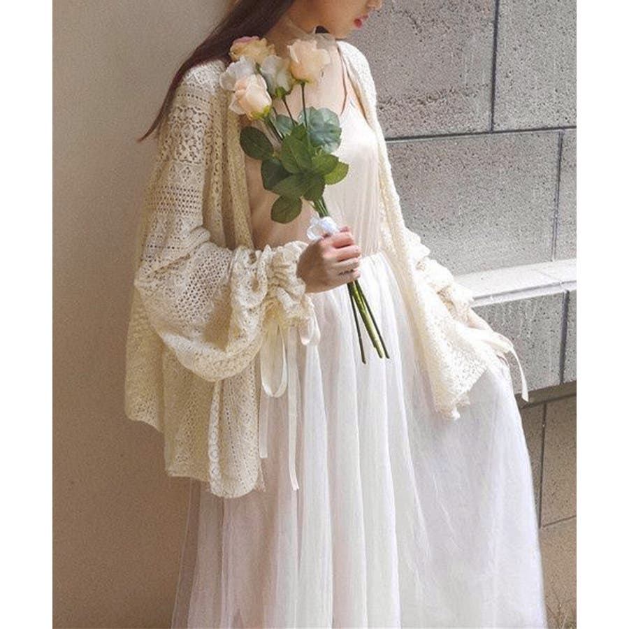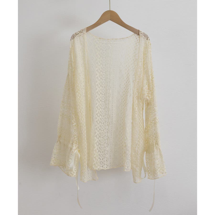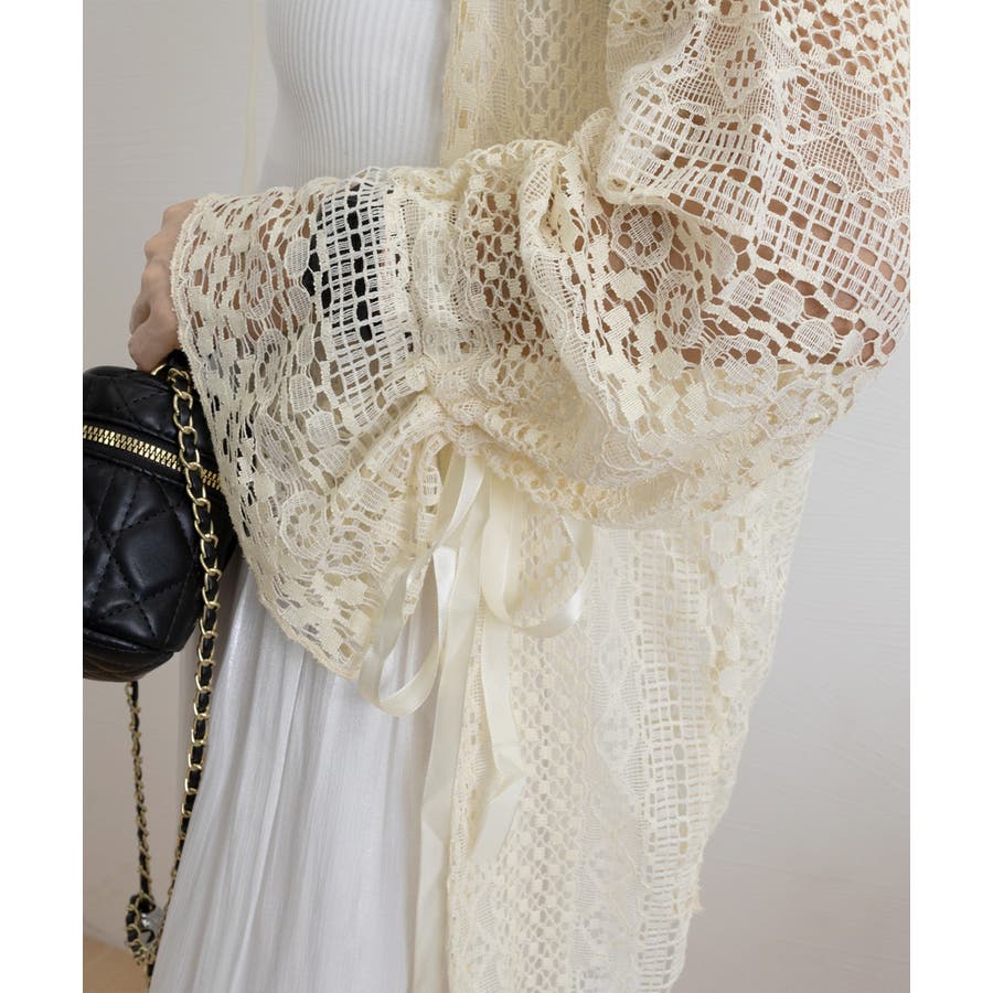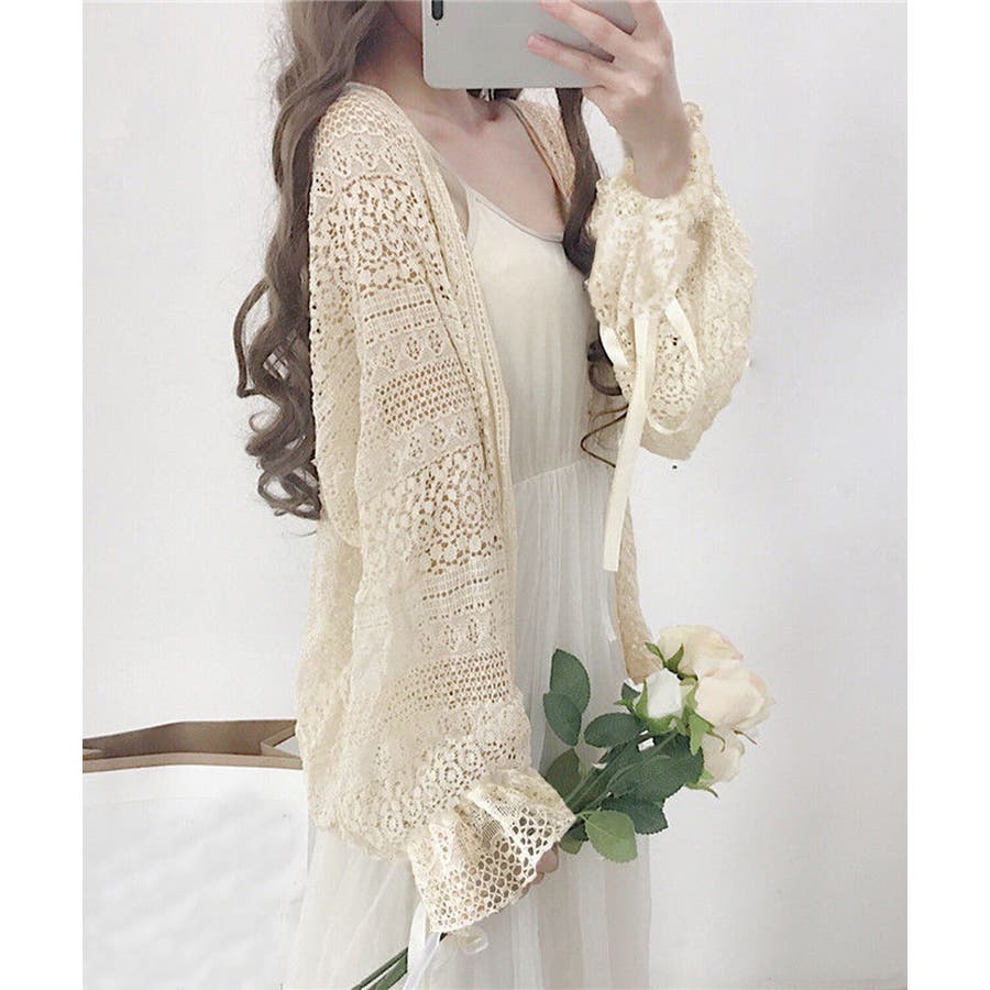 透かし編み レースカーディガン リボン袖