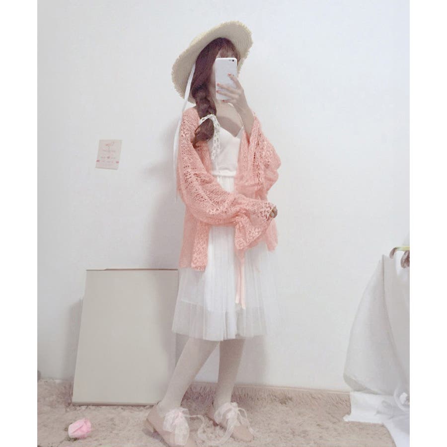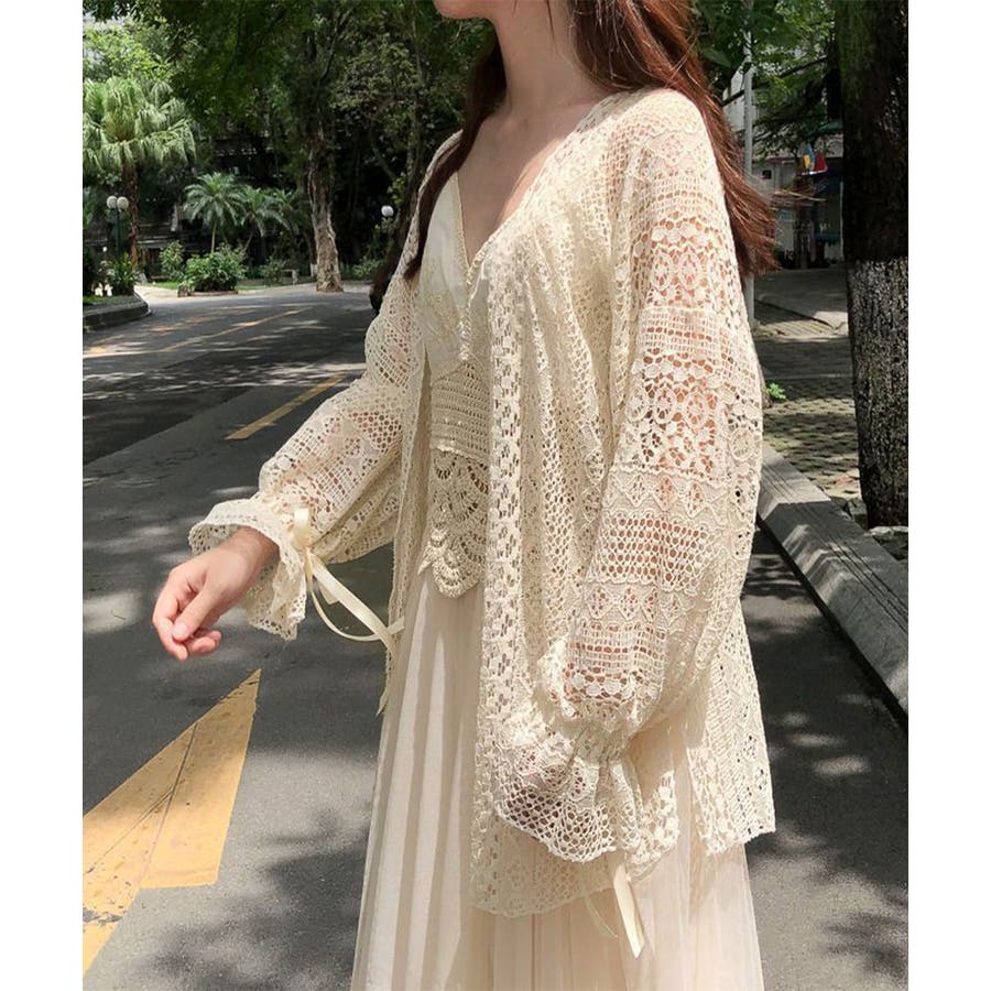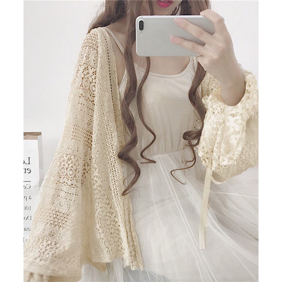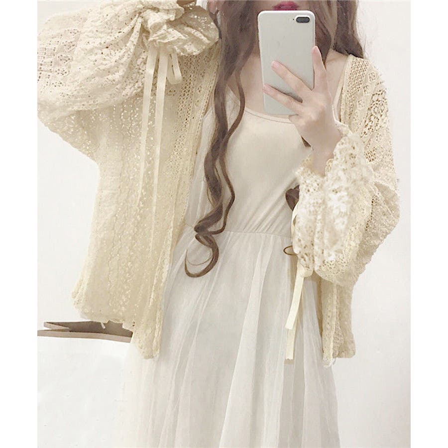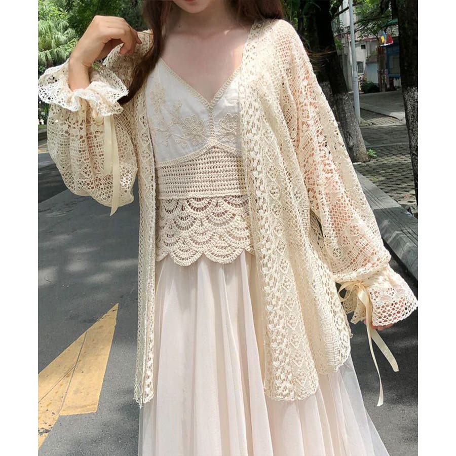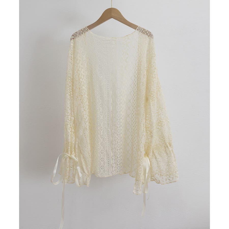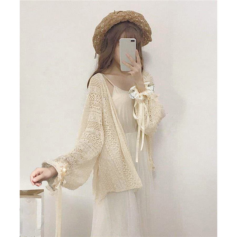 透かし編み レースカーディガン リボン袖