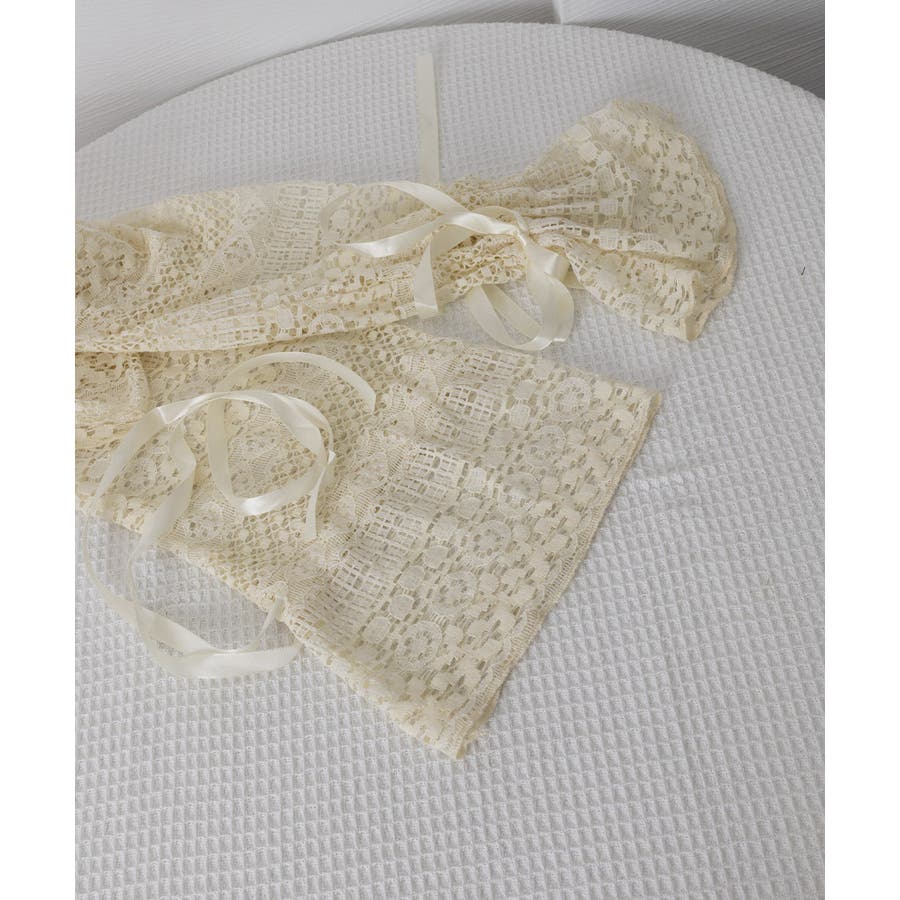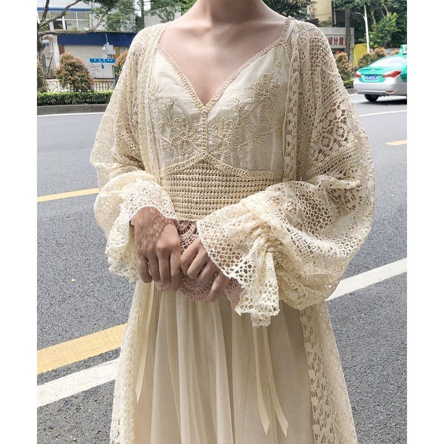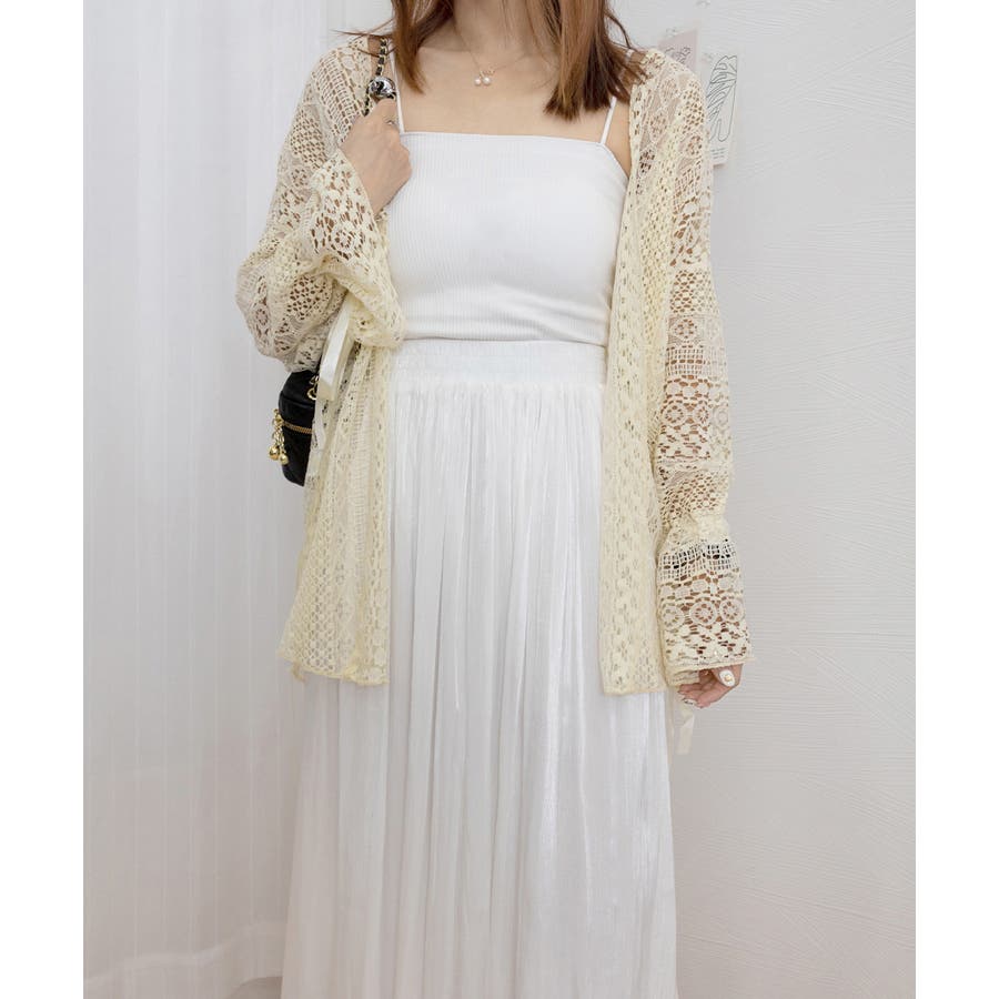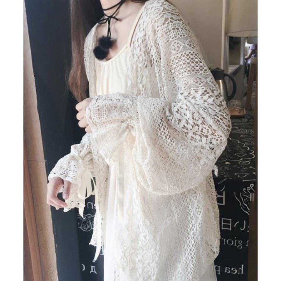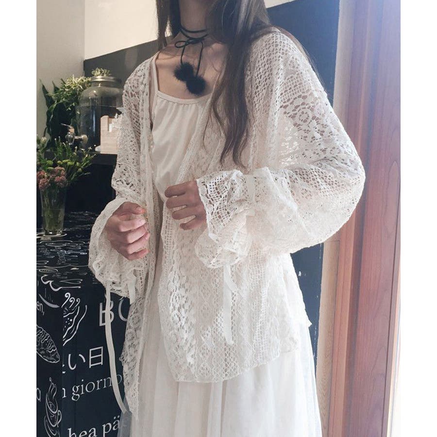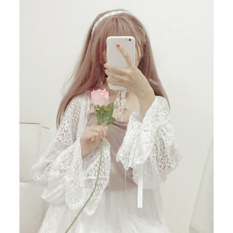 透かし編み レースカーディガン リボン袖