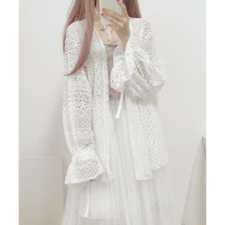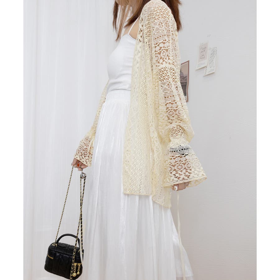 繊細なレース素材が目を引く、フェミニンな透かし編みカーディガン。