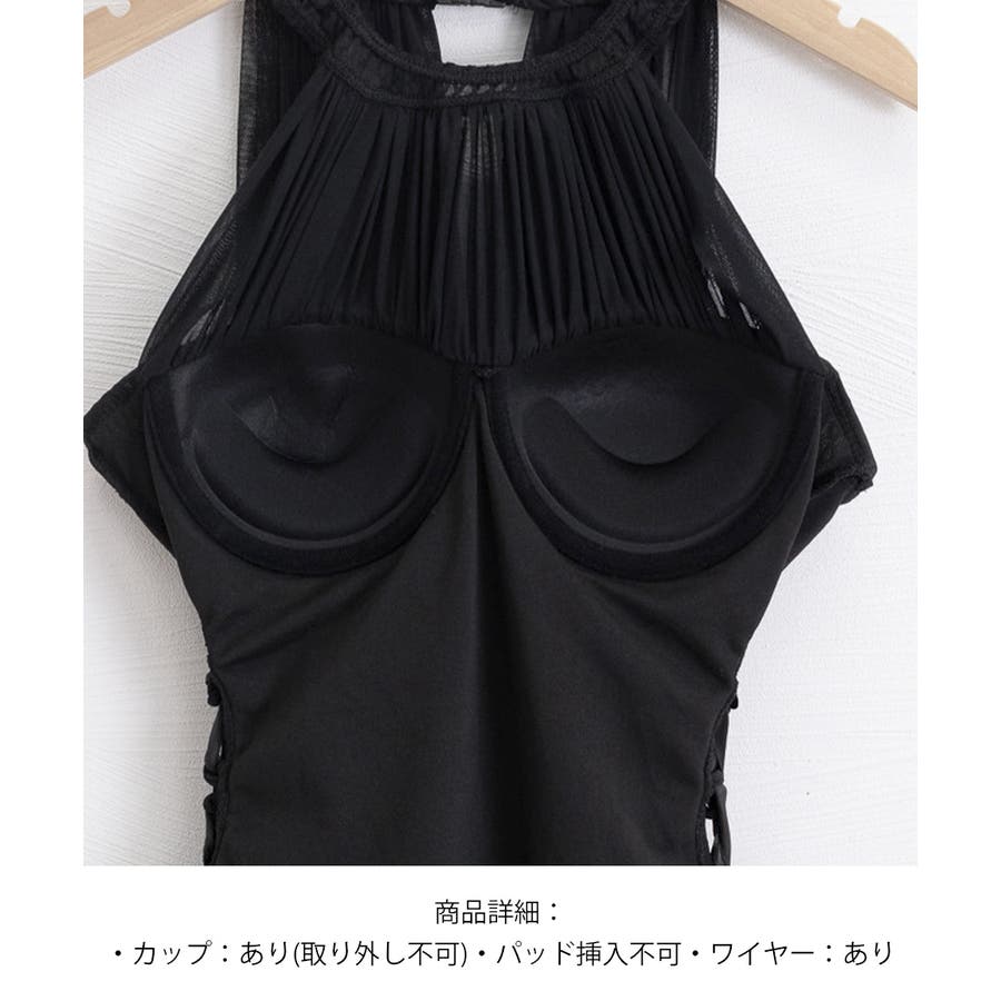 シースルー切り替えが魅力の、ホルターネック・ワンピースタイプのオールインワン水着。
