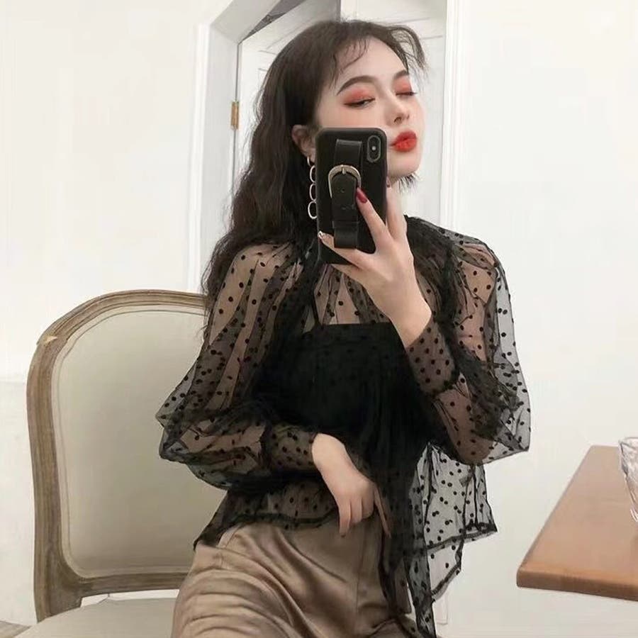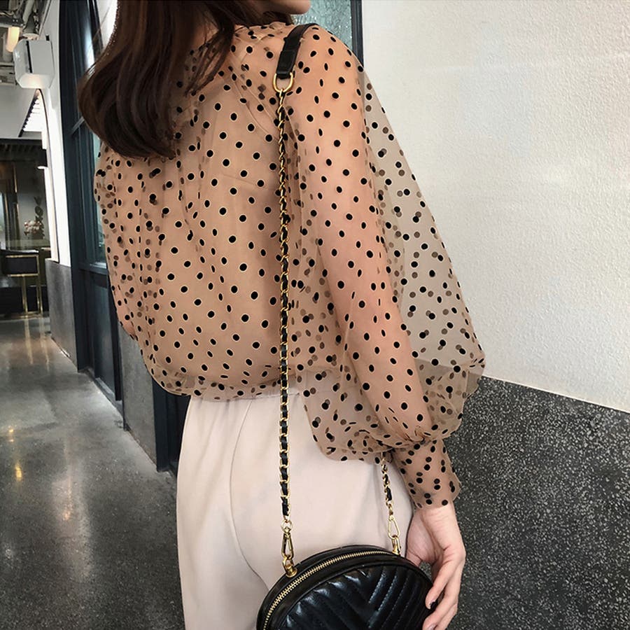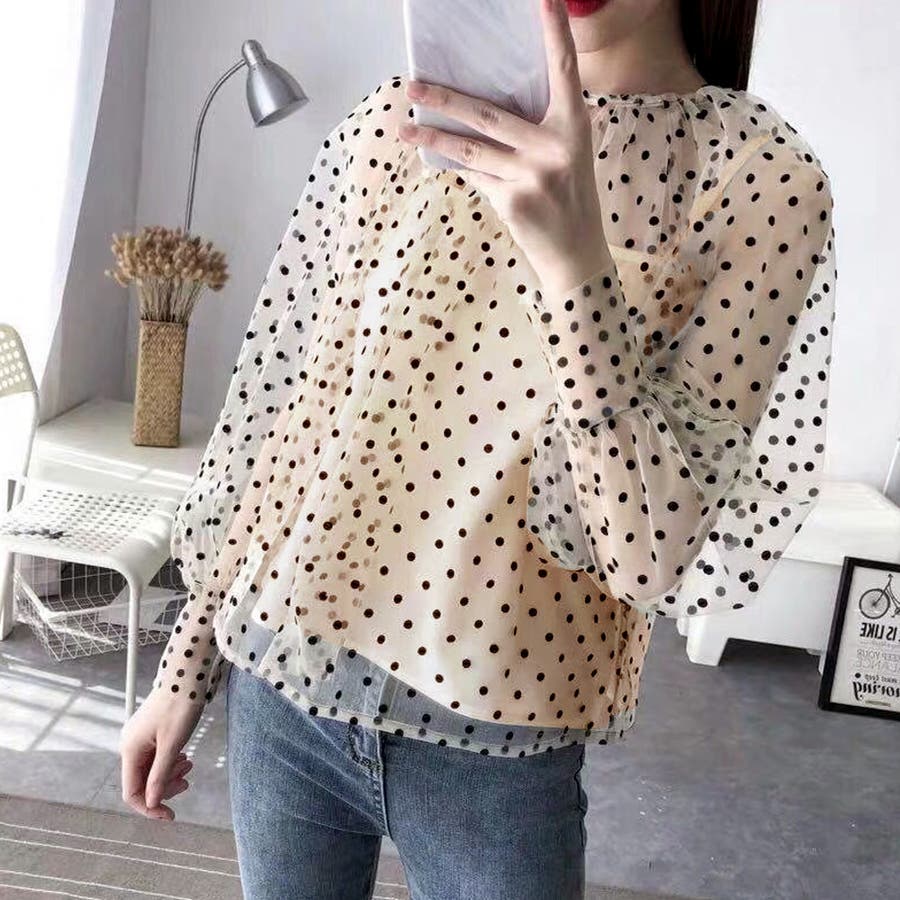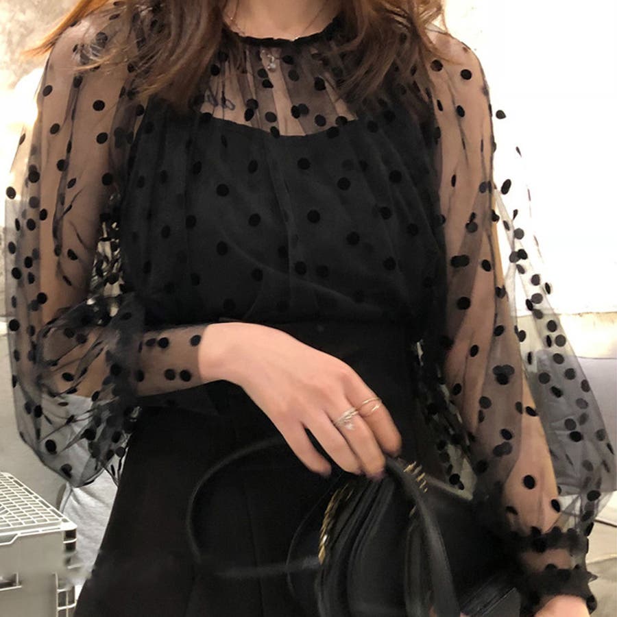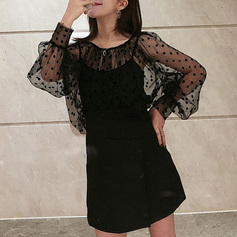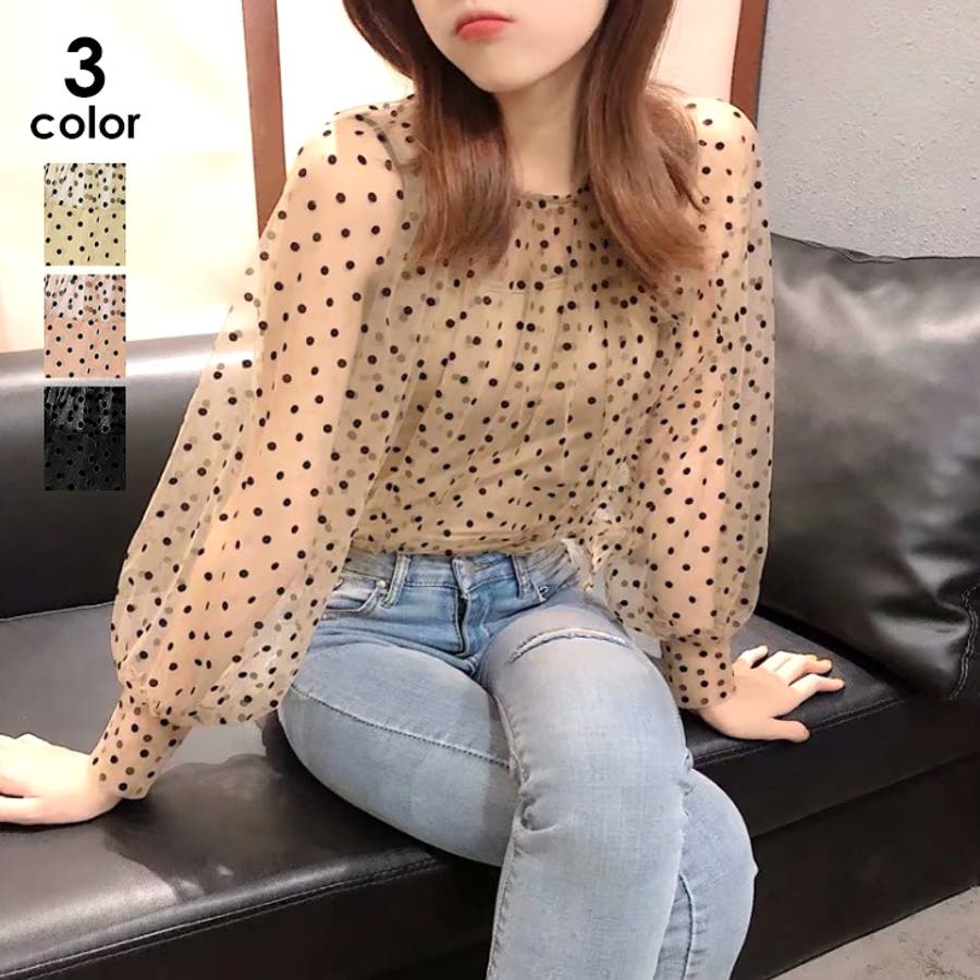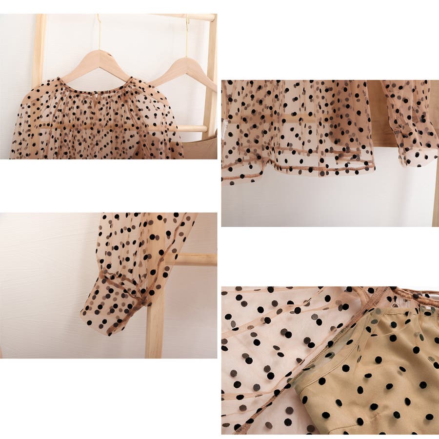 柔らかく軽いチュール生地に異素材ドット加工のシアートップスとキャミソールの2点セット
