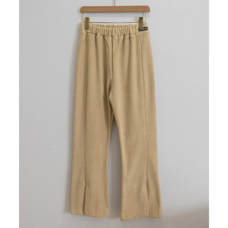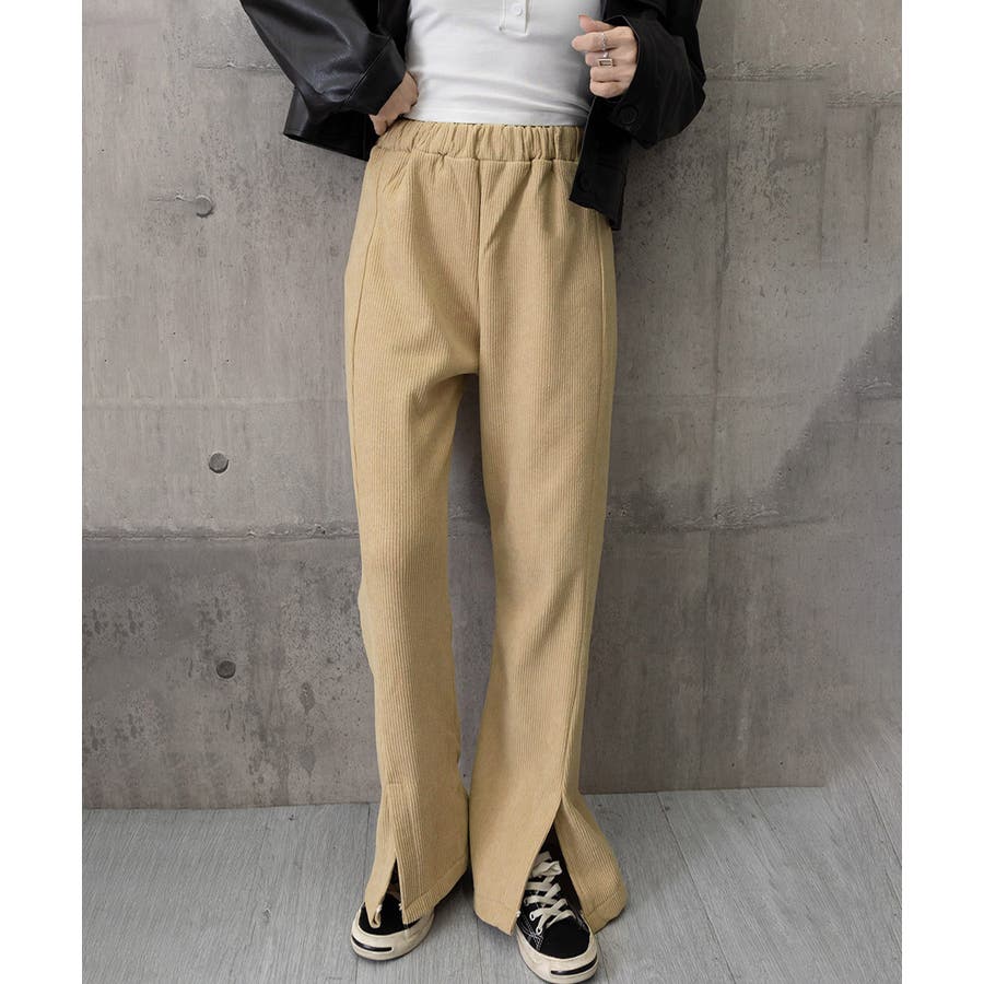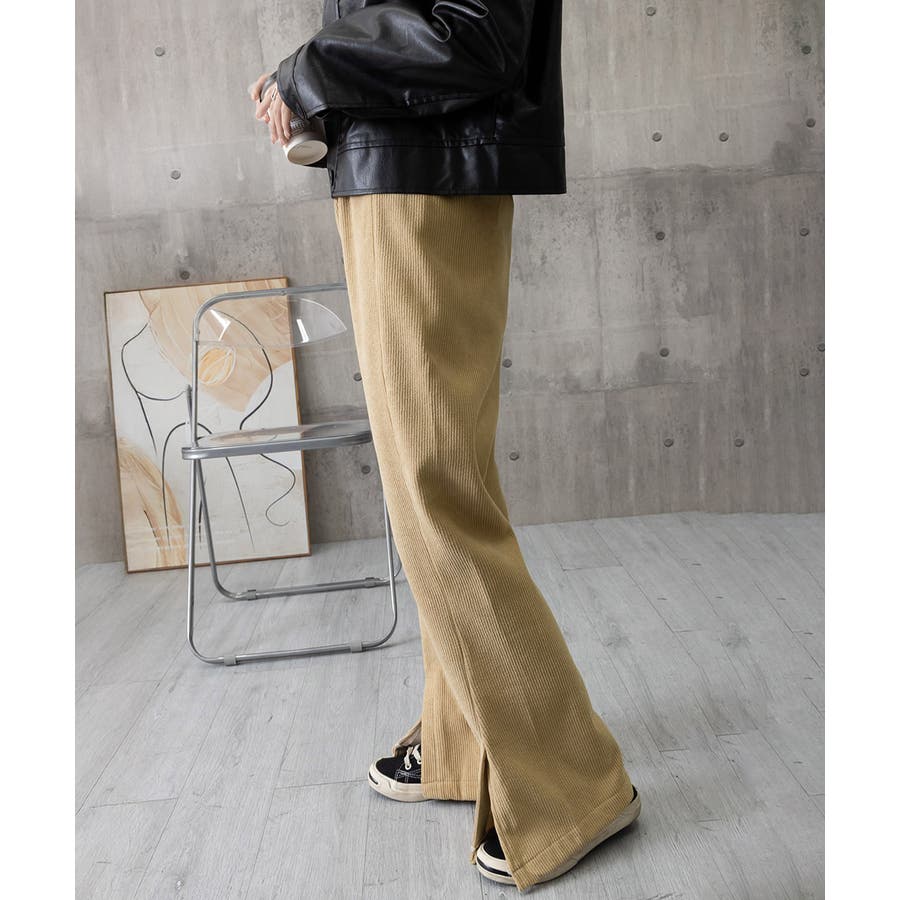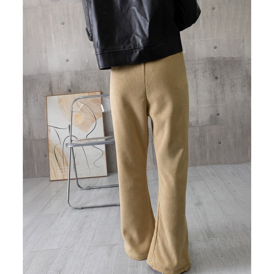 秋冬にぴったりな、暖かみのあるコーデュロイ調素材のセミフレアロングパンツ。