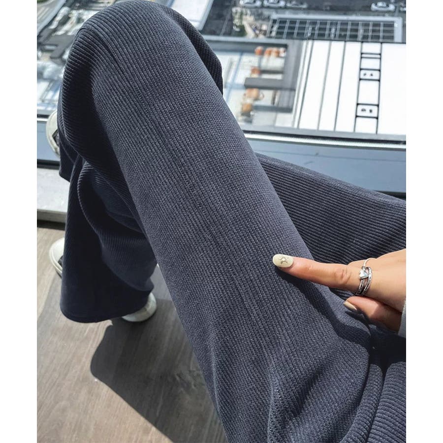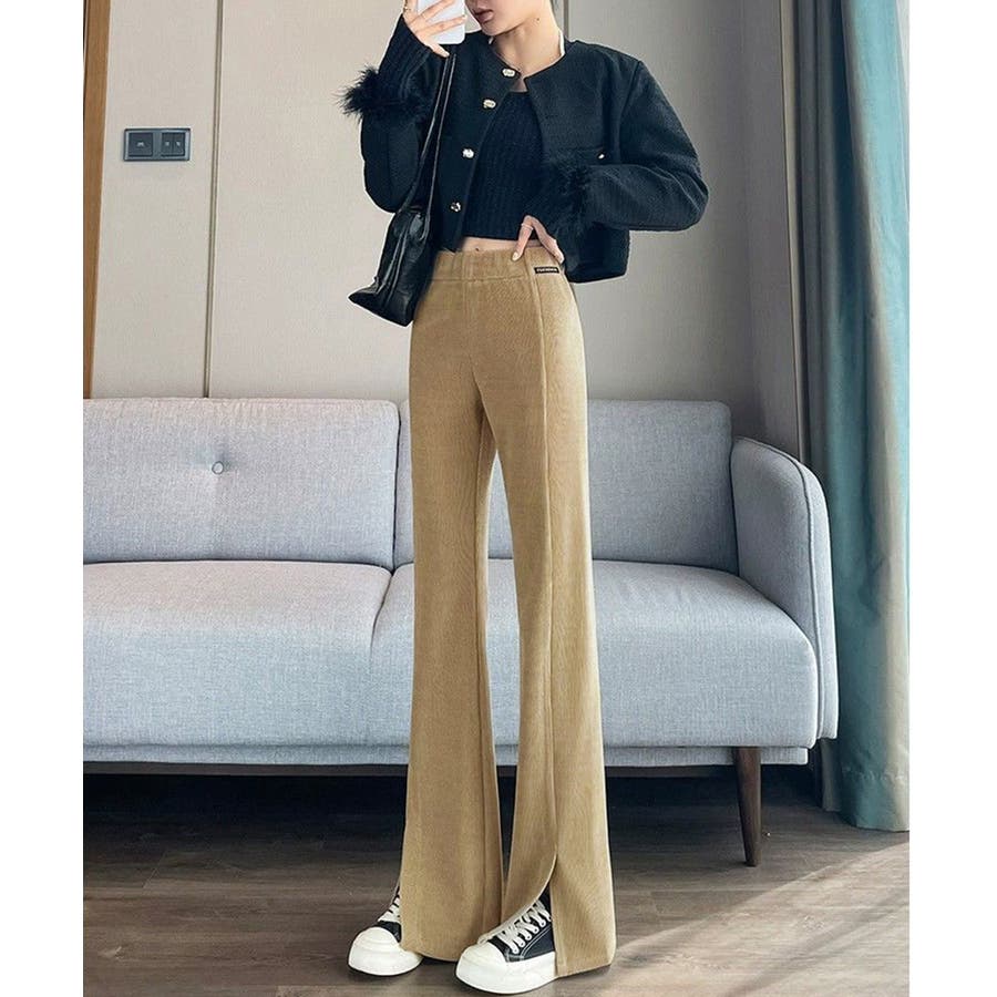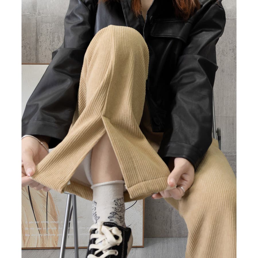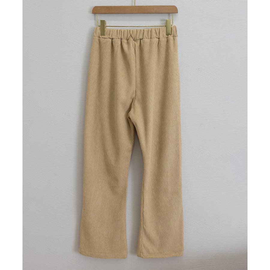 秋冬にぴったりな、暖かみのあるコーデュロイ調素材のセミフレアロングパンツ。