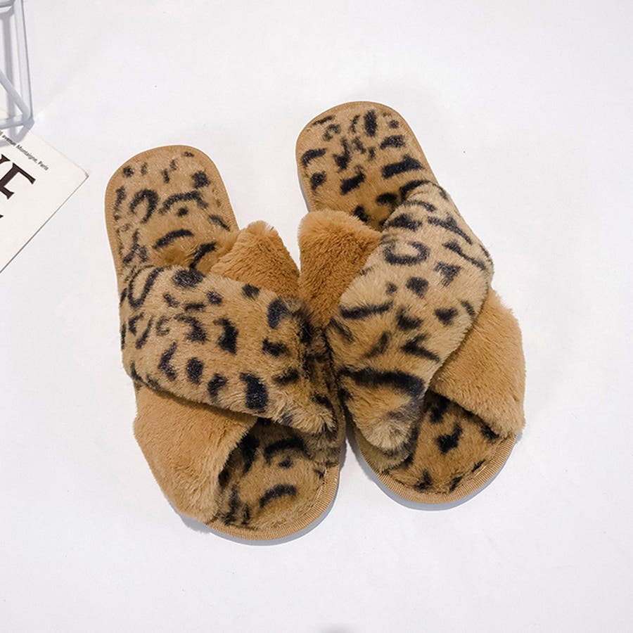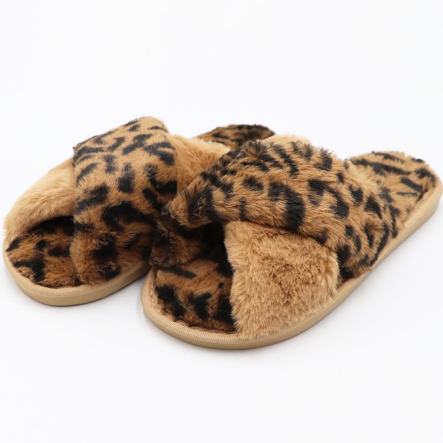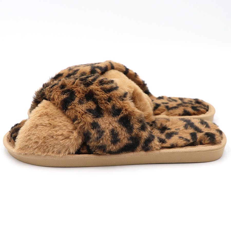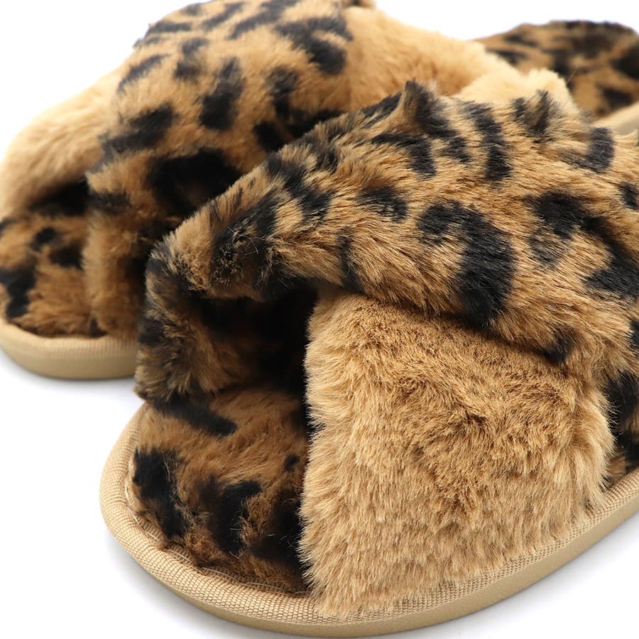 全体にファーをあしらった、温かな履き心地、大人気なレオパード柄のスリッパサンダル