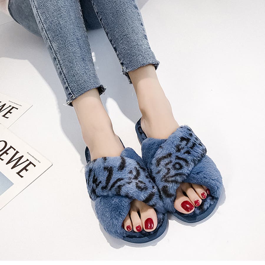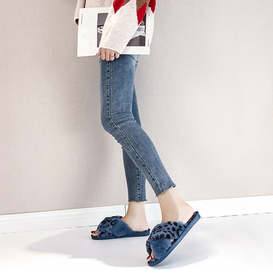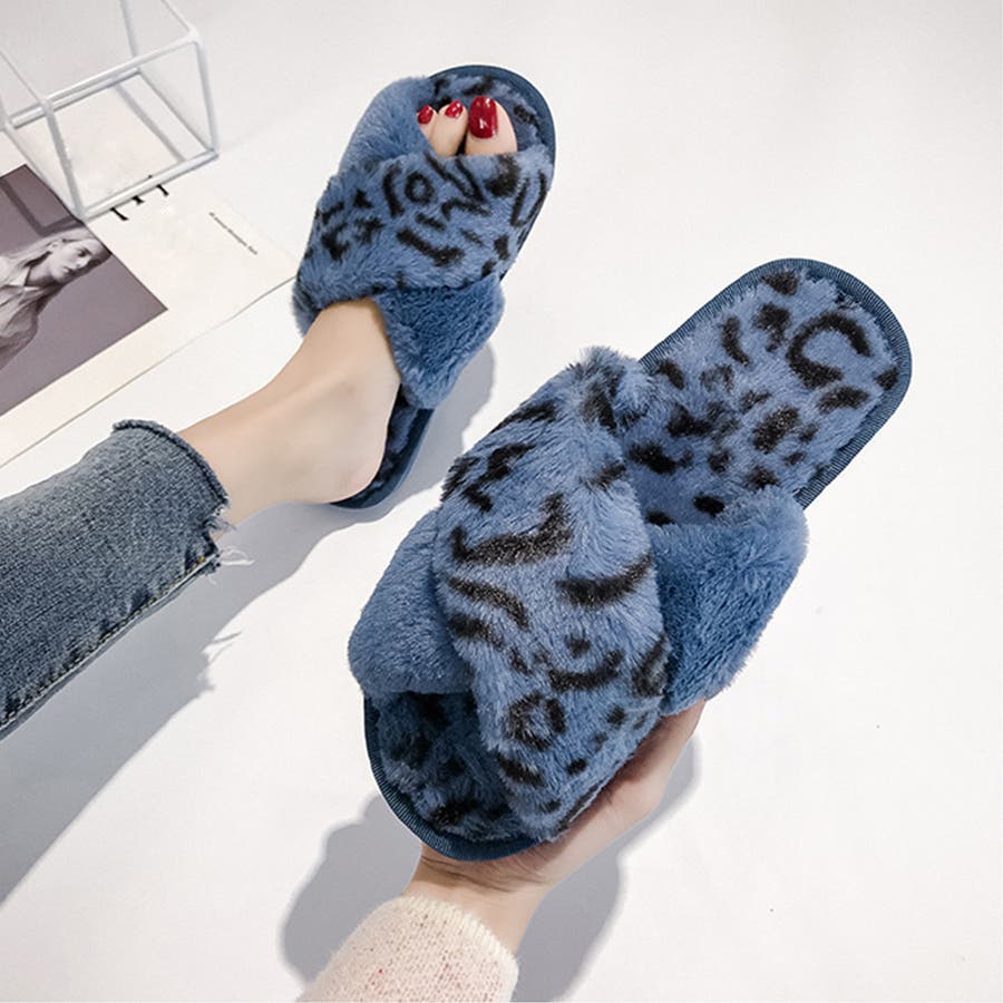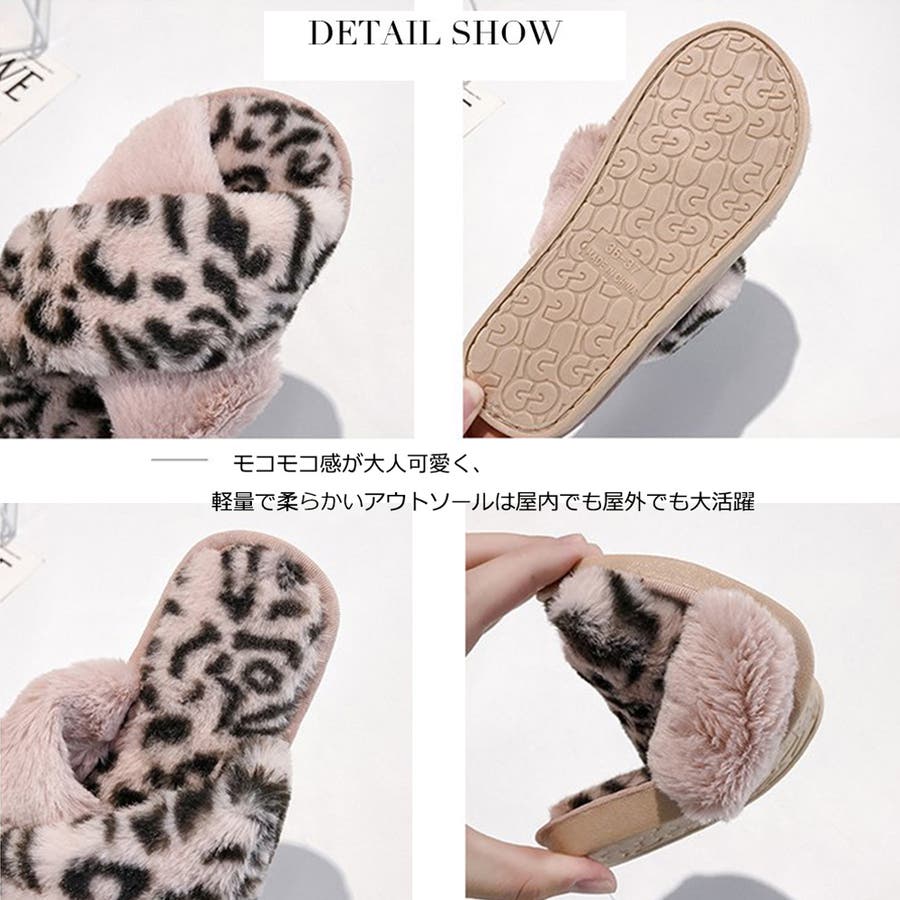 全体にファーをあしらった、温かな履き心地、大人気なレオパード柄のスリッパサンダル