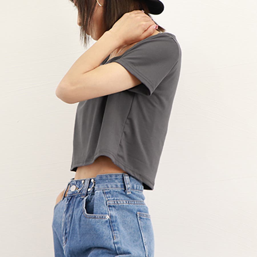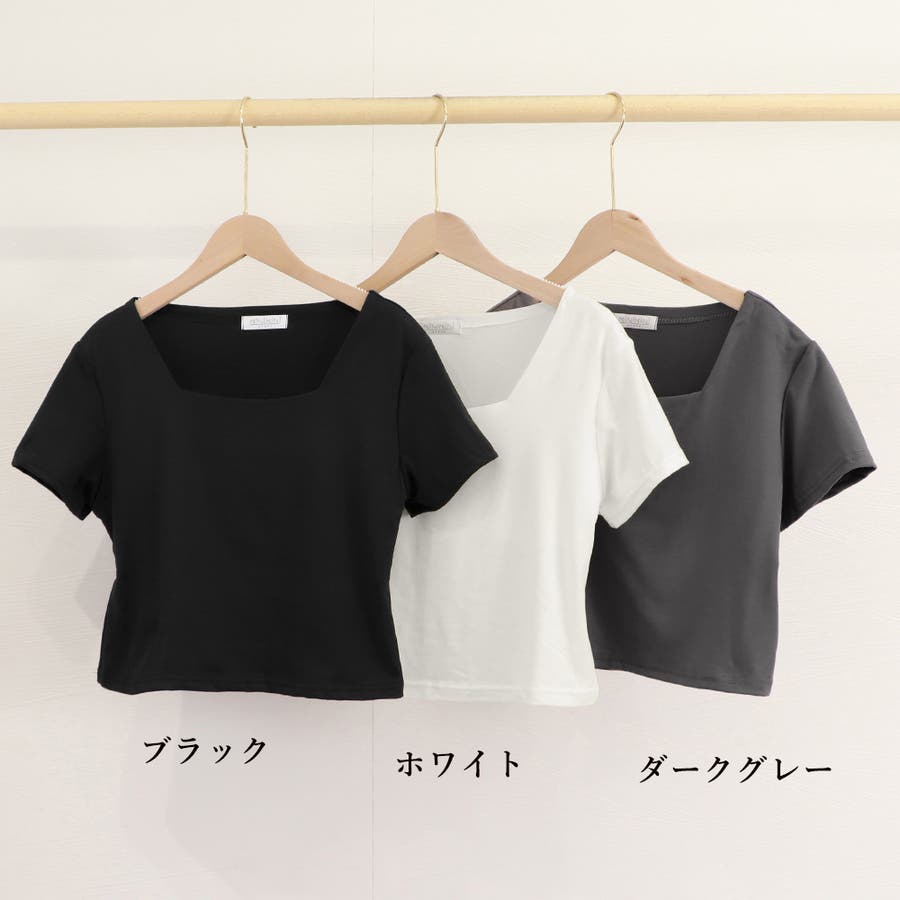 顔周りをすっきり見せてくれるスクエアネックの半袖クロップド丈Tシャツ