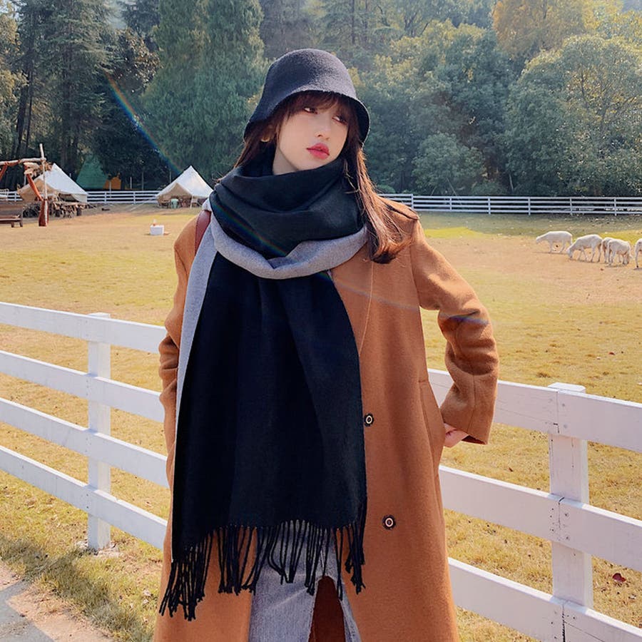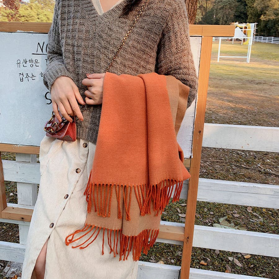 シンプルでスタイリッシュなフリンジ付きデザイン。1枚でオシャレの幅が広がる大判配色ストール
