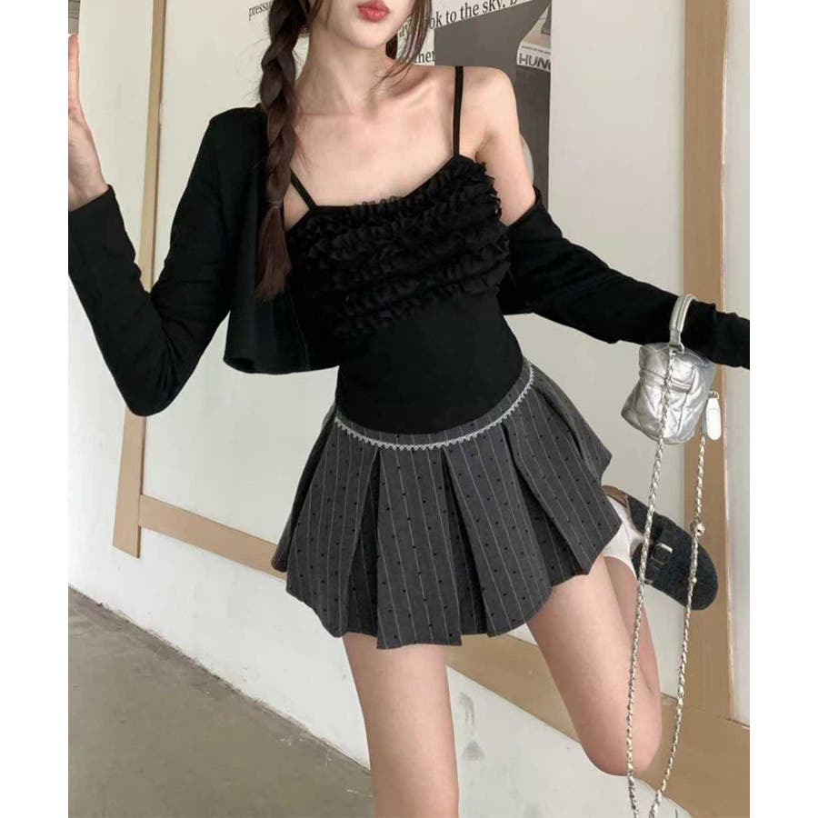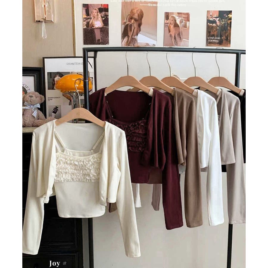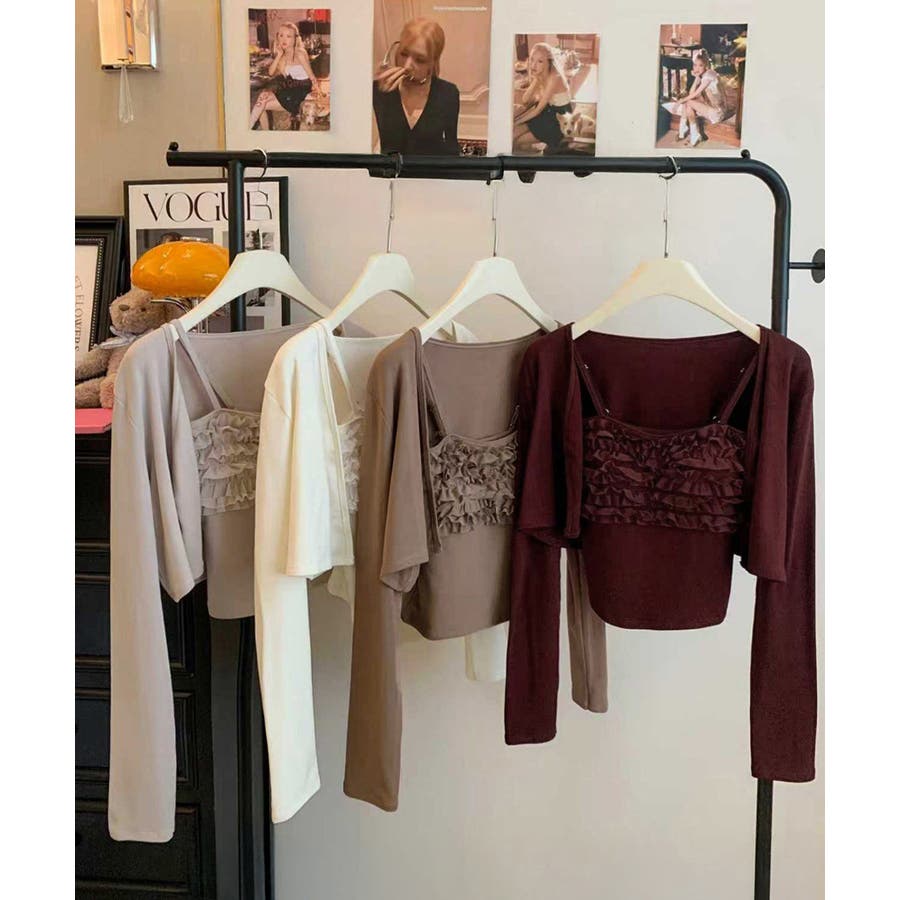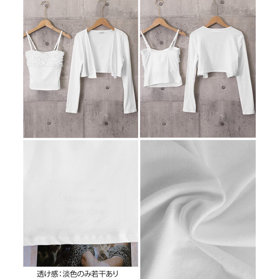 フリルが可愛いキャミソールとショート丈カーディガンのセット。