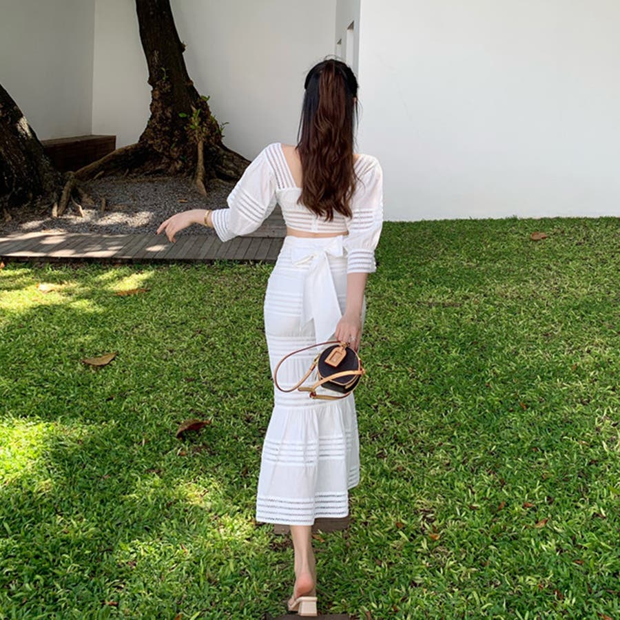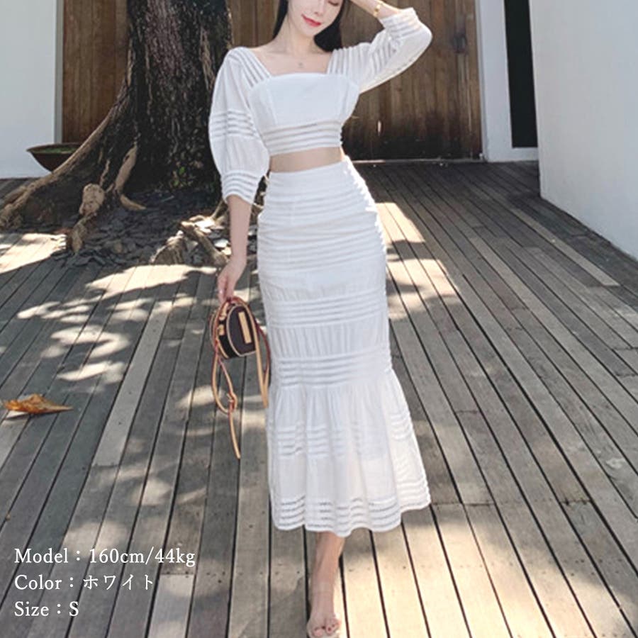 大人女性の清楚感を出してくれるショート丈トップスとハイウエストロングスカートの2点セット