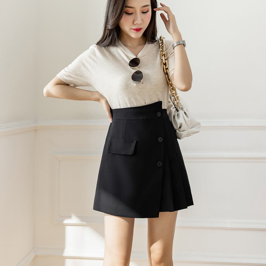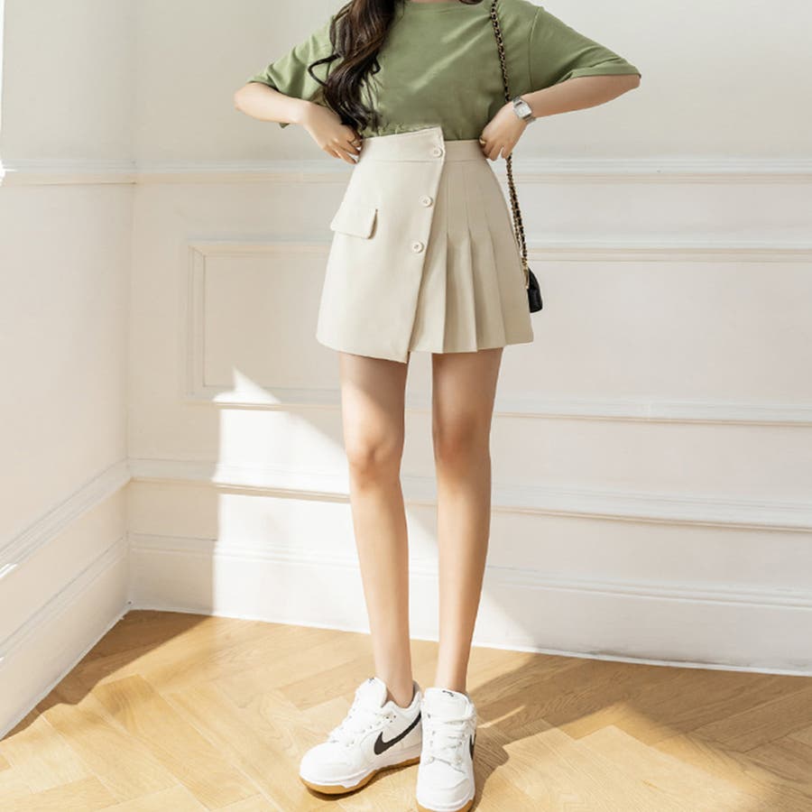 裾に向かって広がるAラインシルエットに、サイドにプリーツをあしらいましたミニスカート