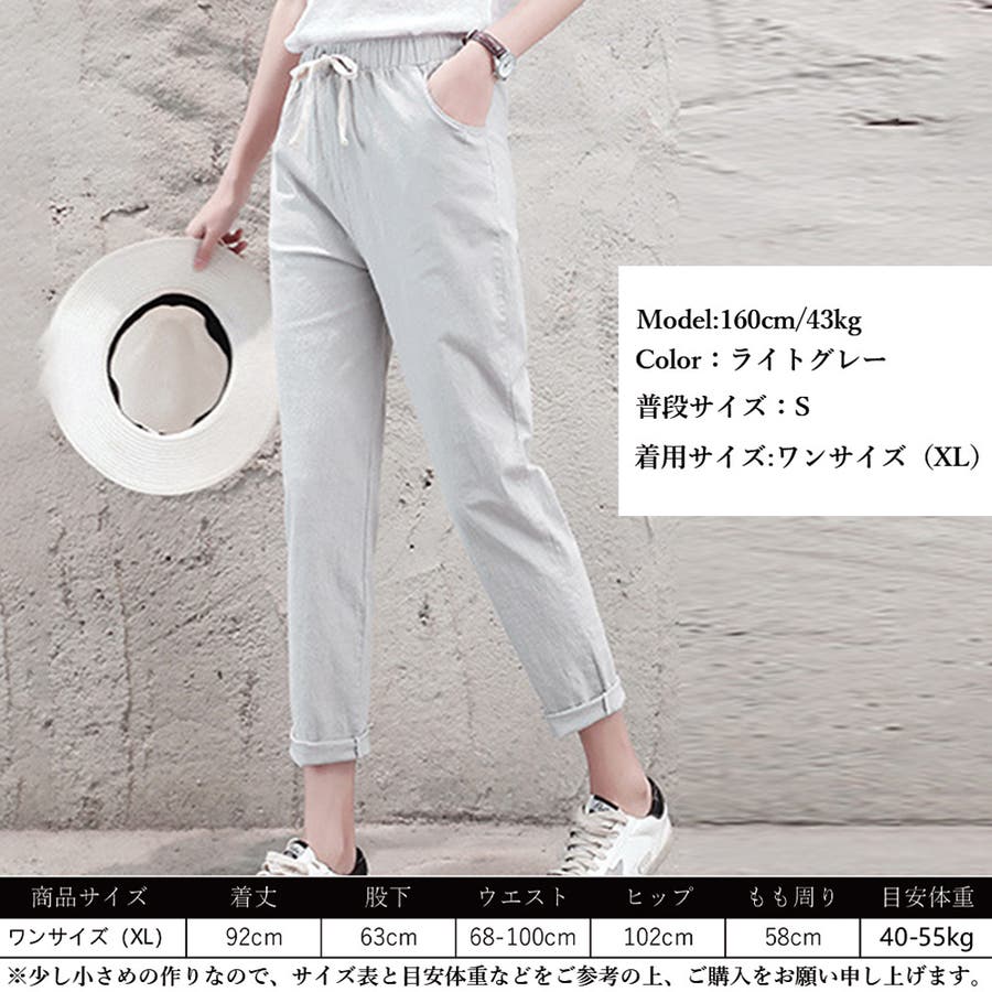 着丈:約92cm 股下:約63cm ウエスト(ゴム仕様):約62-100cm ヒップ:約102cm もも周り:約58cm