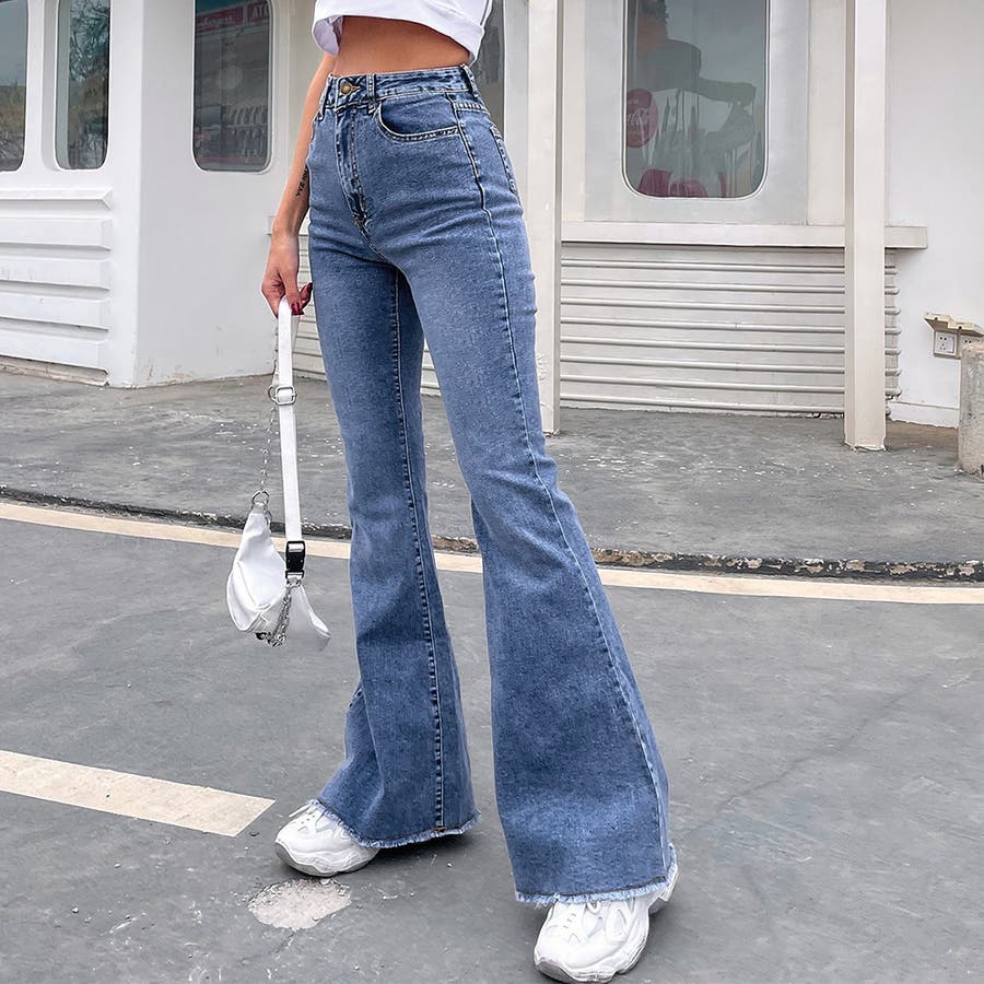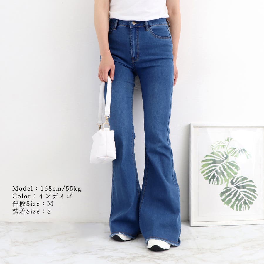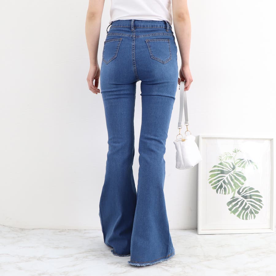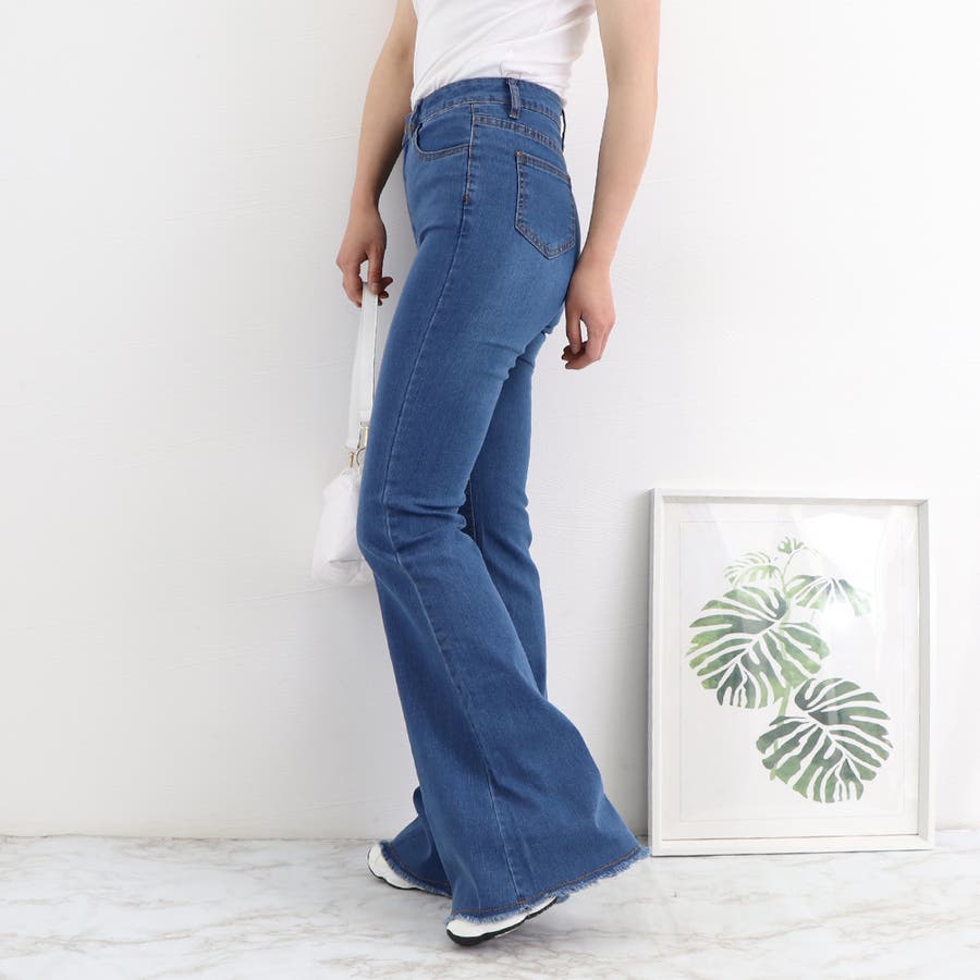 デニム フレアパンツ 裾フリンジ 美脚