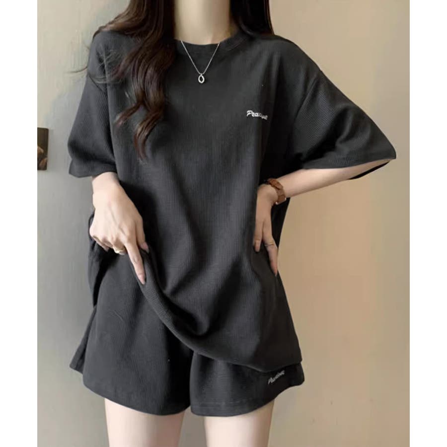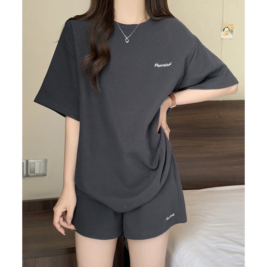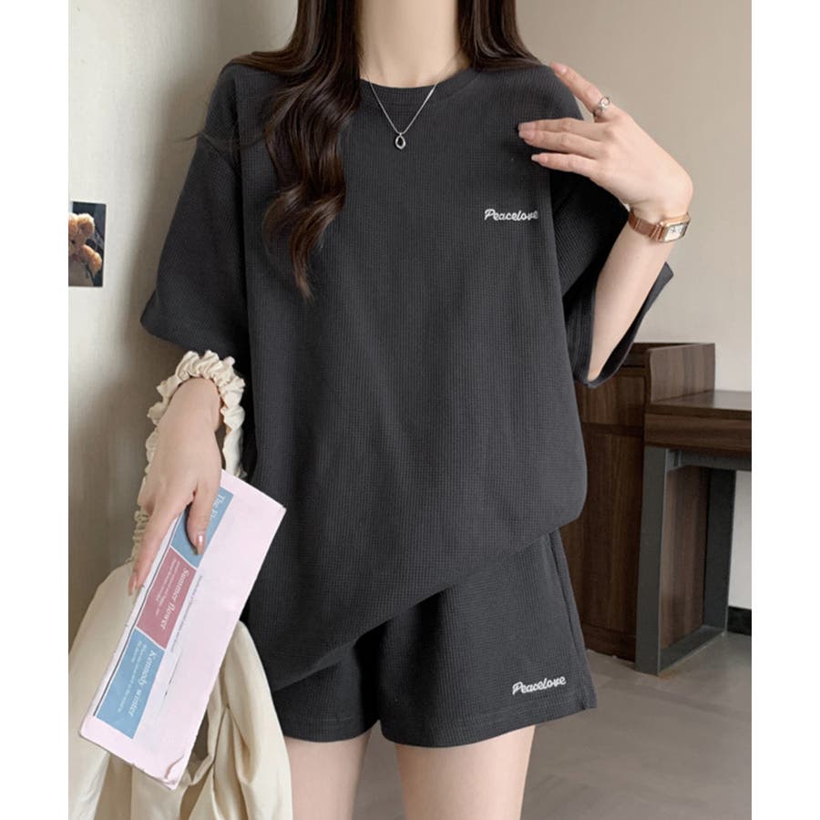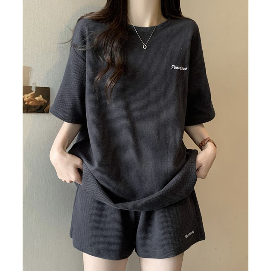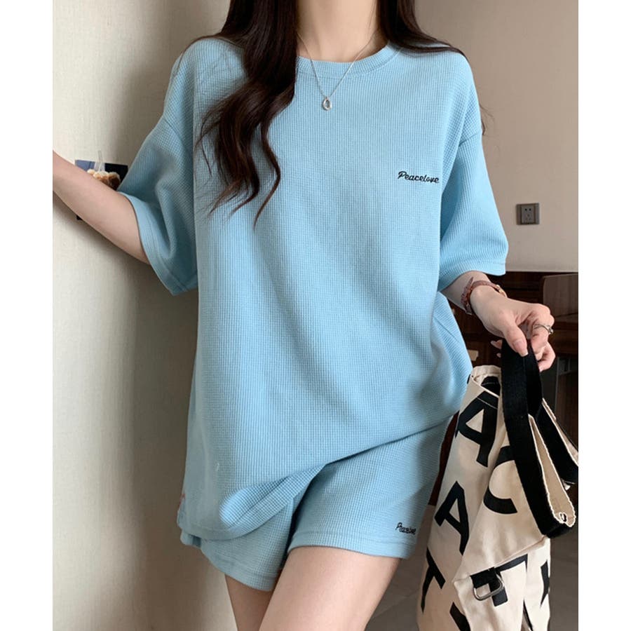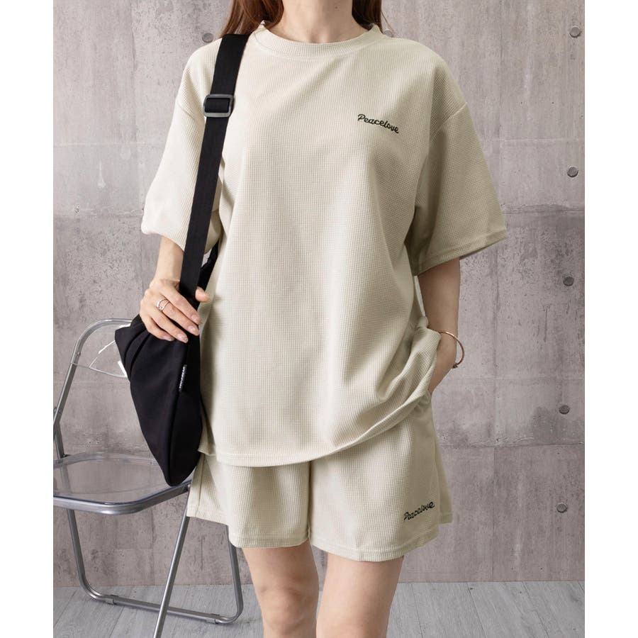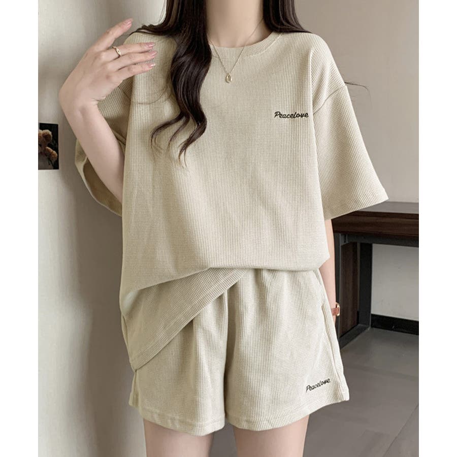 ルーズフィットシルエットにシンプルなロゴ刺繍が映える、ワッフル素材の半袖Tシャツとショーパンの上下セット。