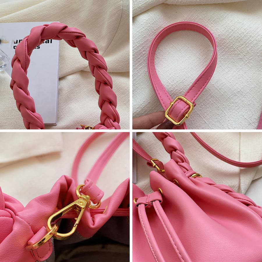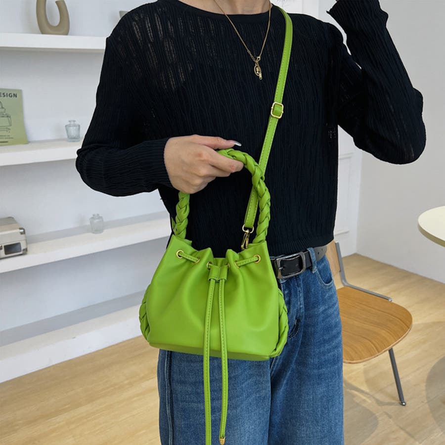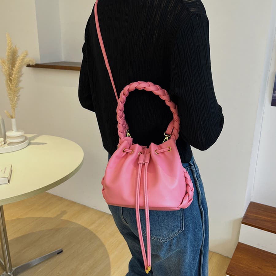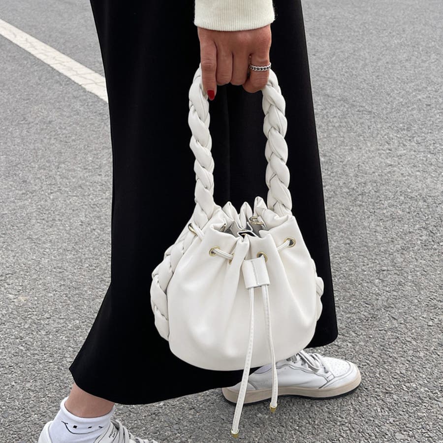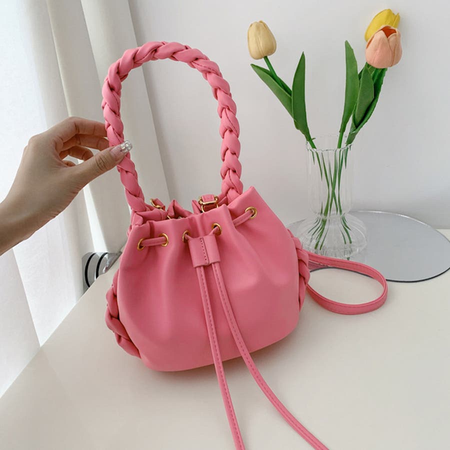 編込みデザインハンドルがアクセントをプラスする巾着ショルダーバッグ