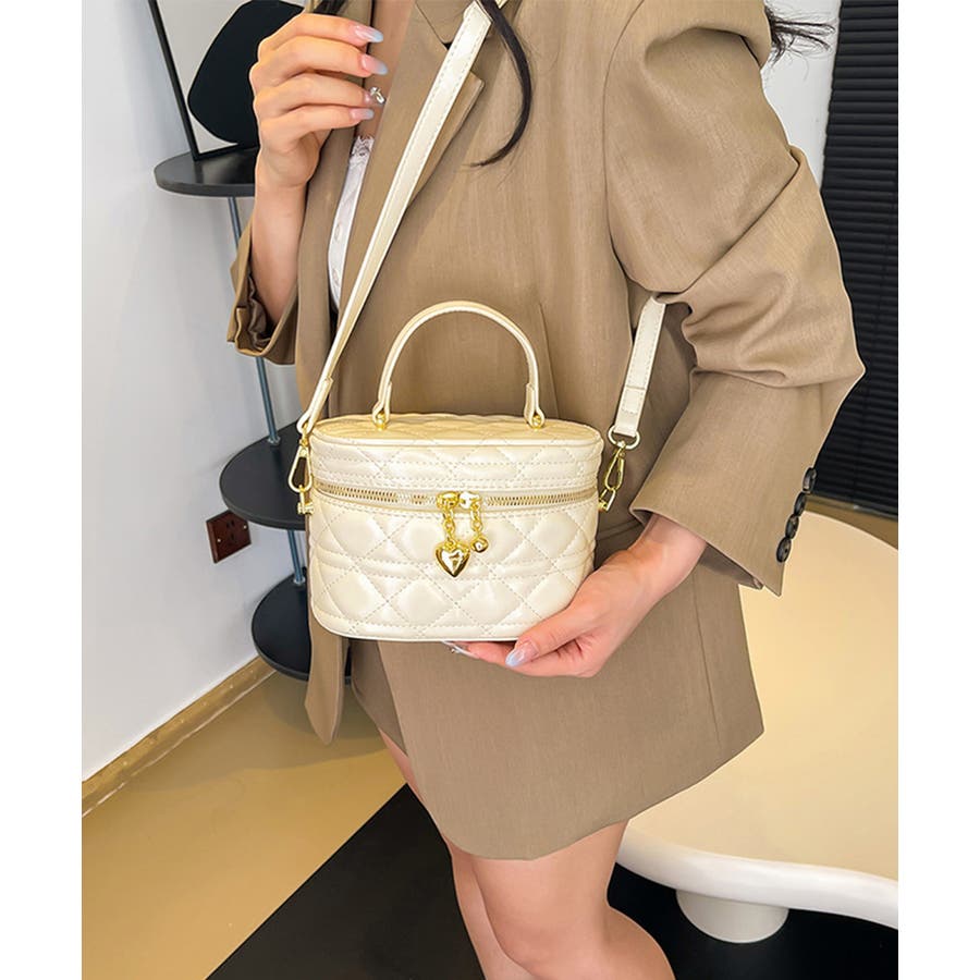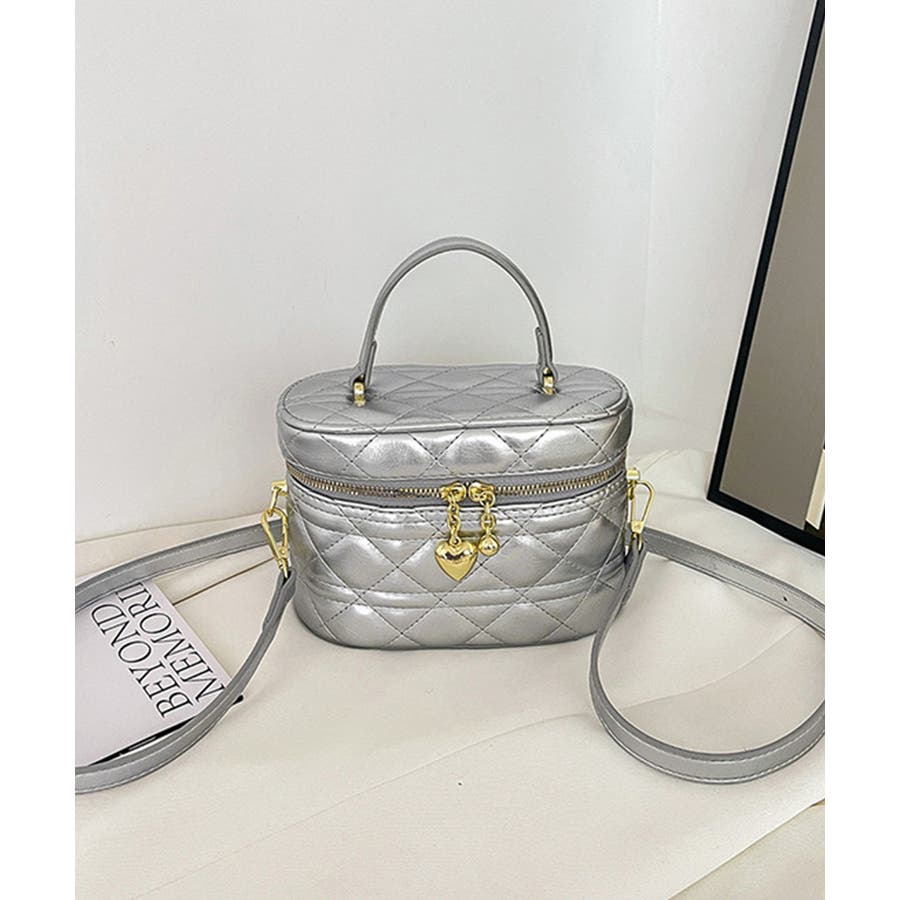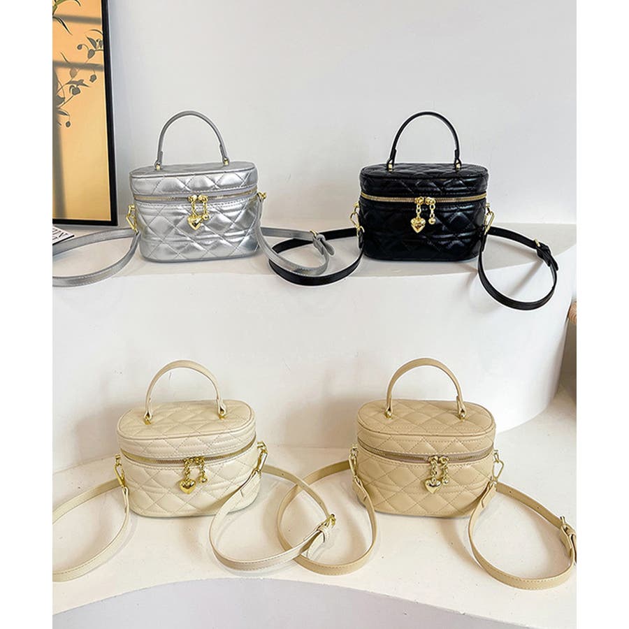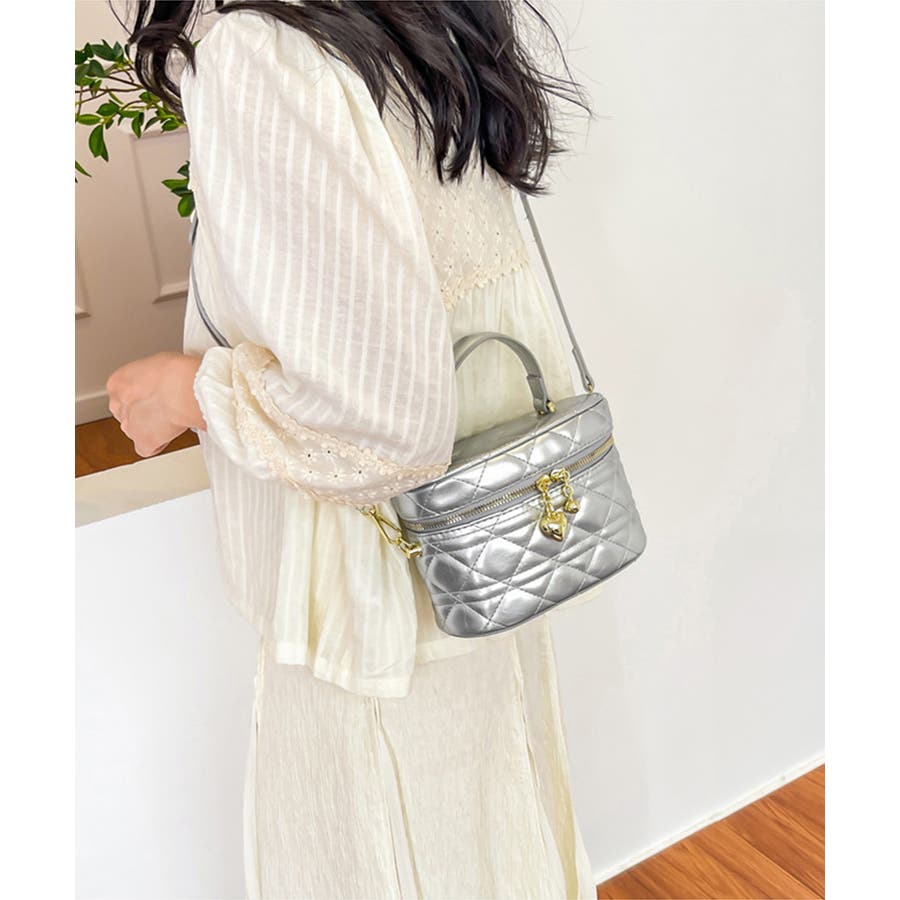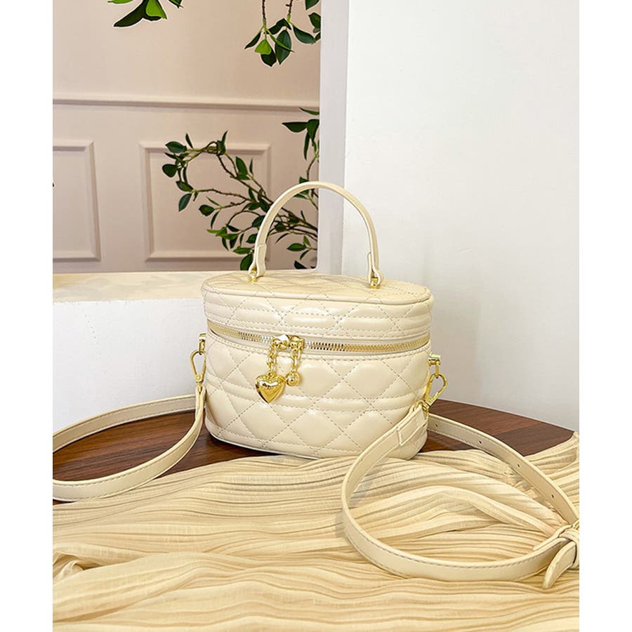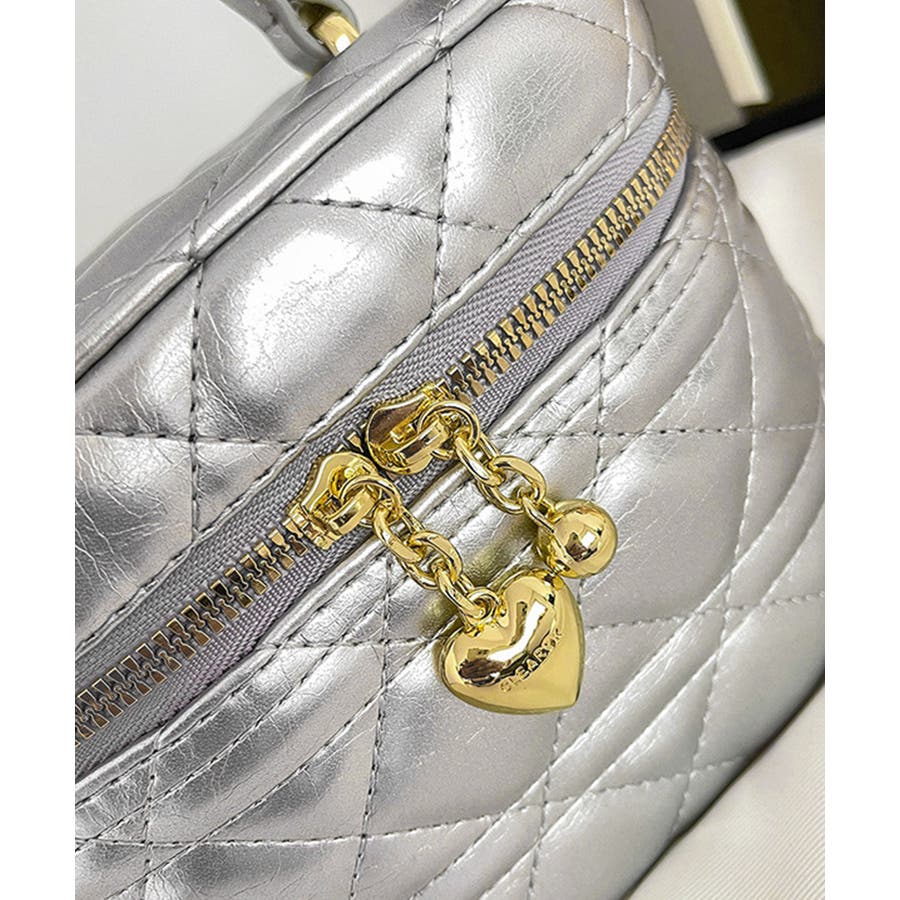 全体にキルティング加工が施され、ゴールドの金具とハートのチャームがアクセントに