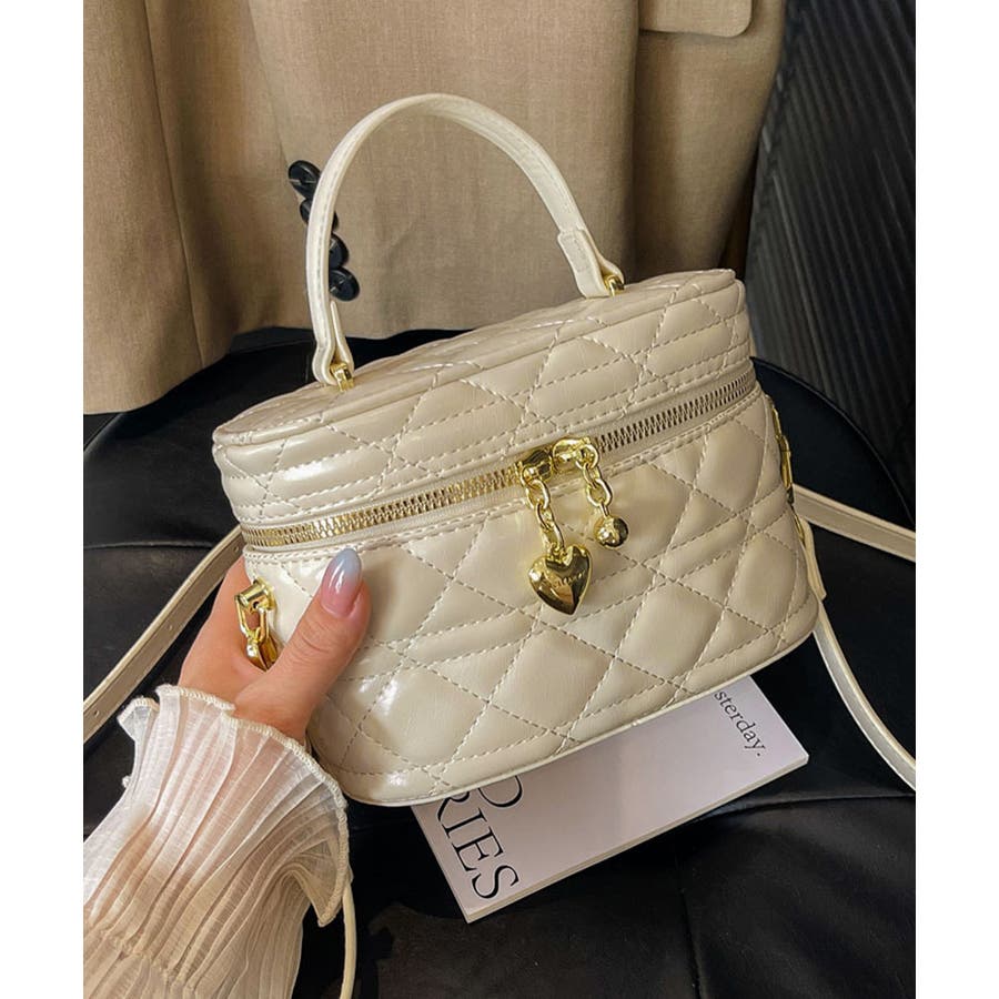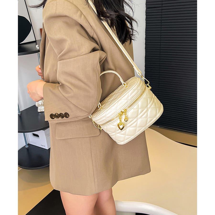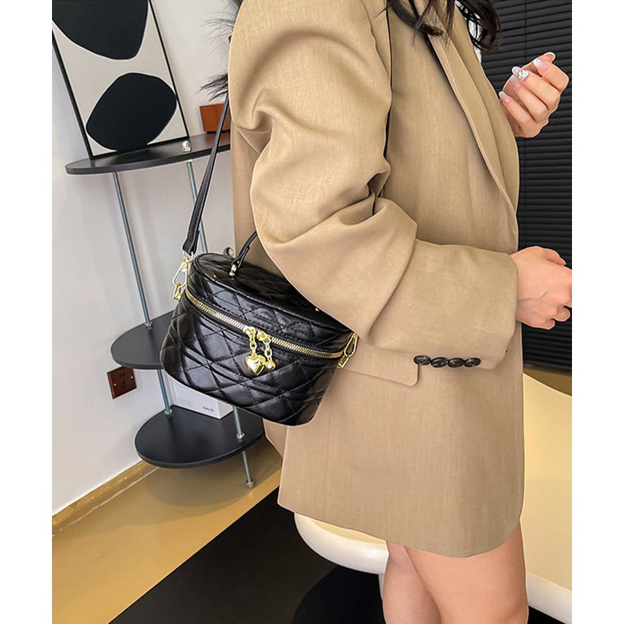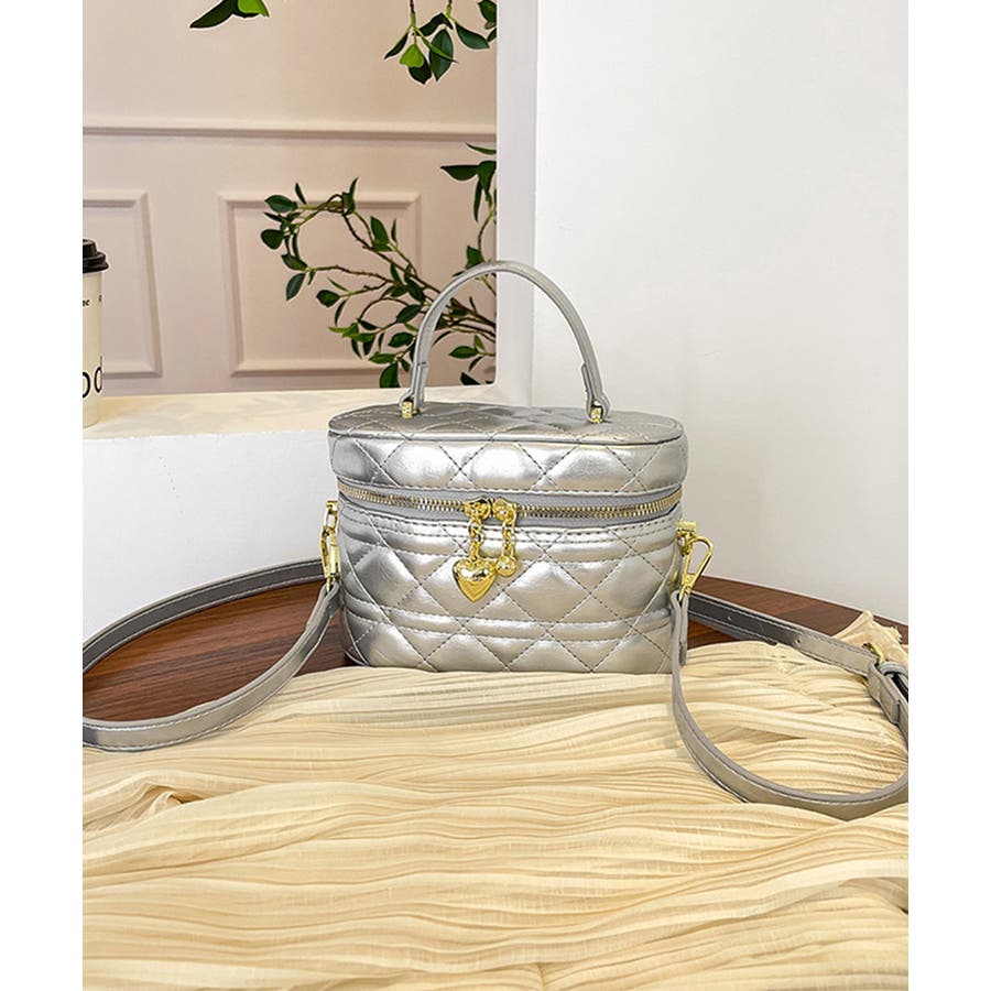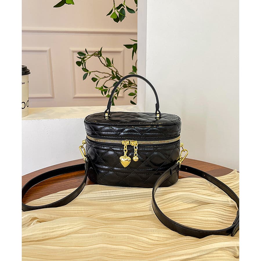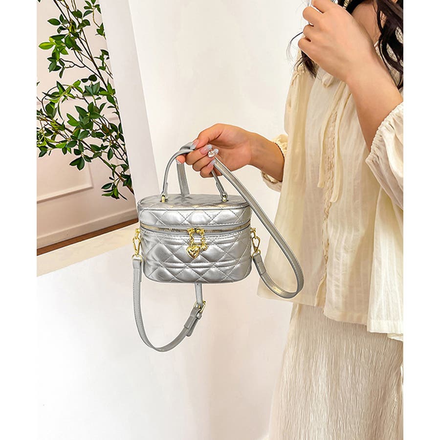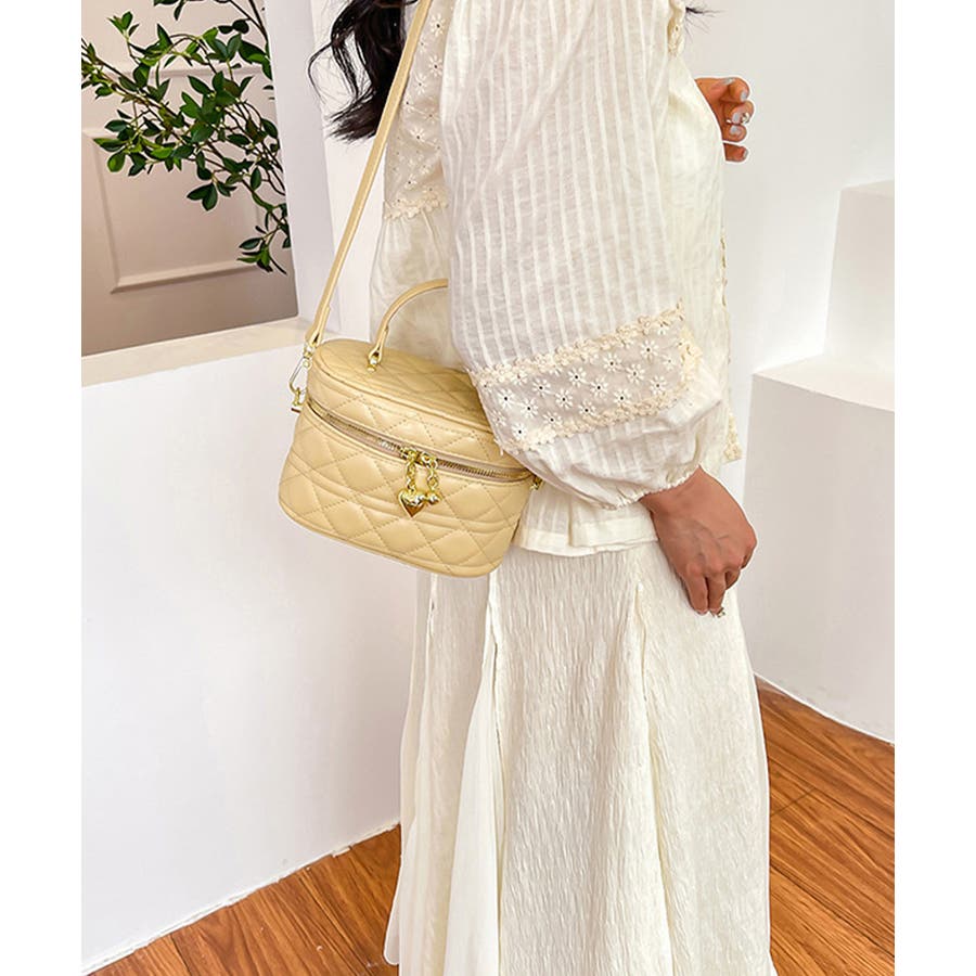 全体にキルティング加工が施され、ゴールドの金具とハートのチャームがアクセントに