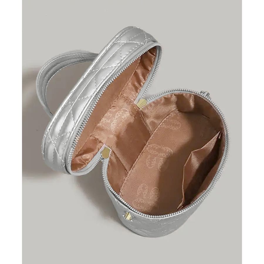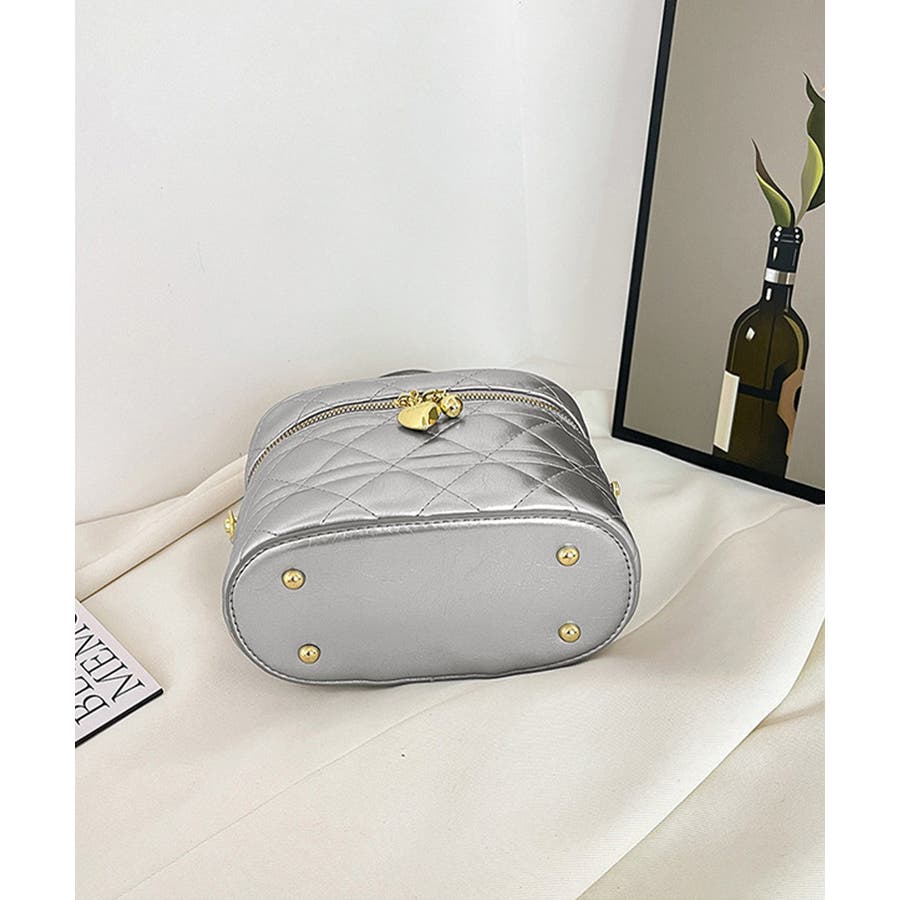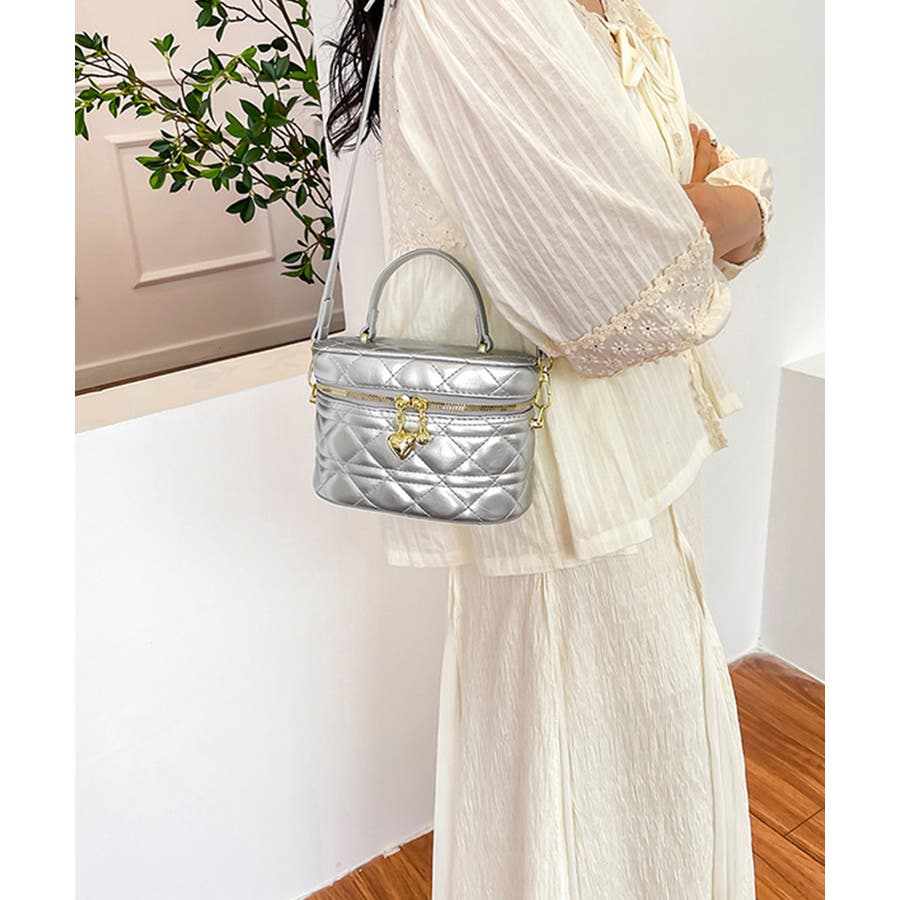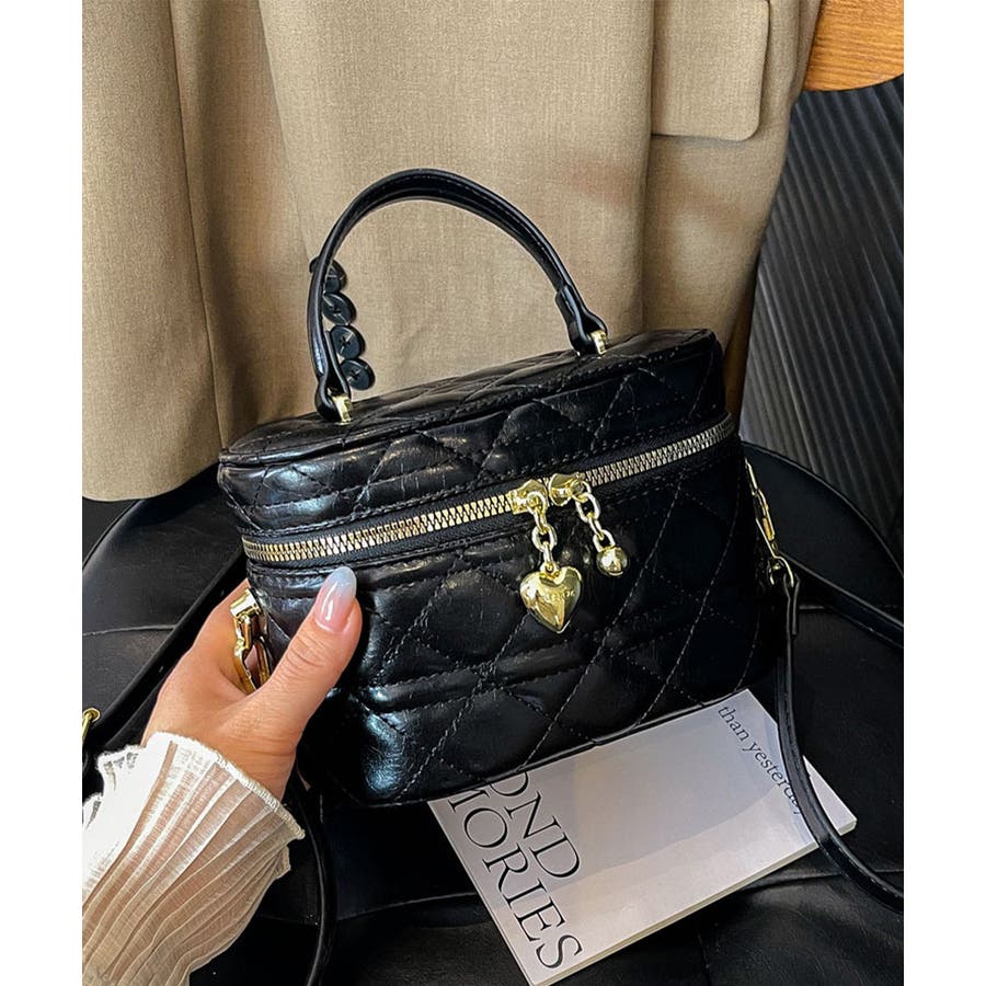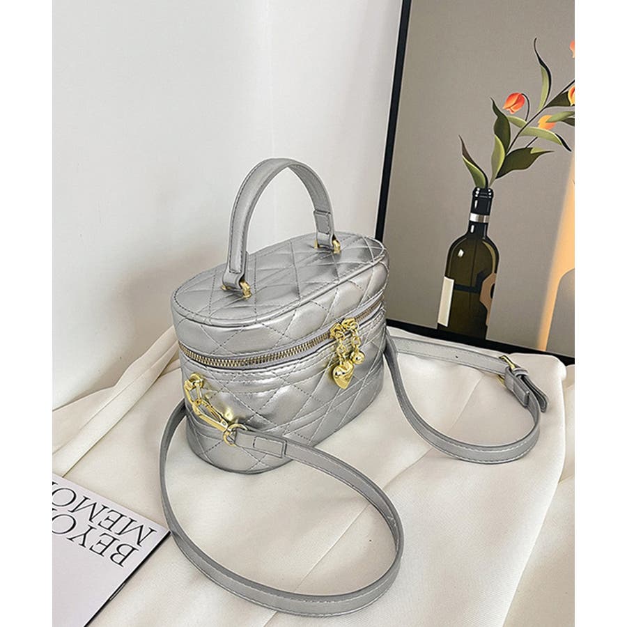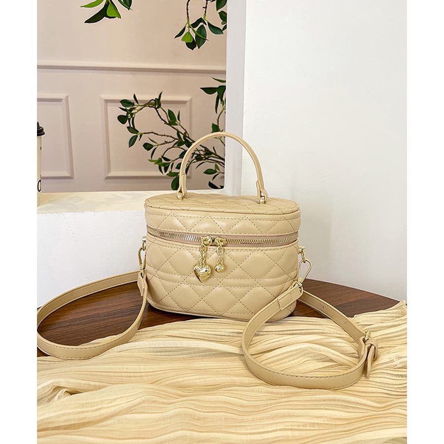 全体にキルティング加工が施され、ゴールドの金具とハートのチャームがアクセントに