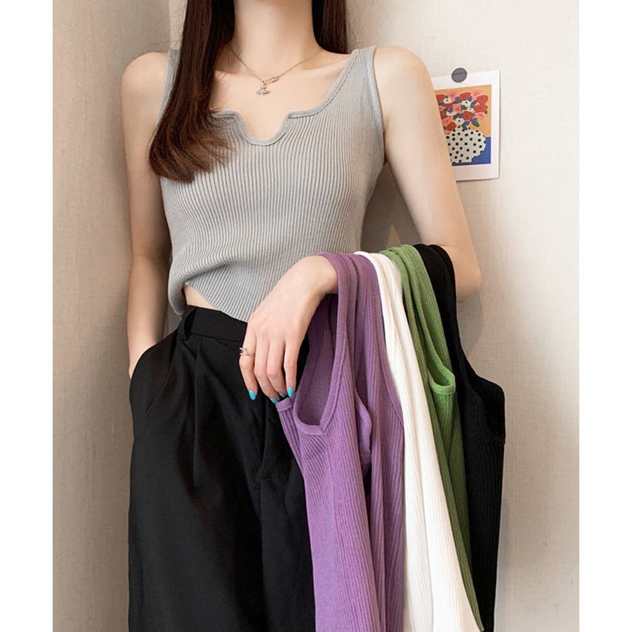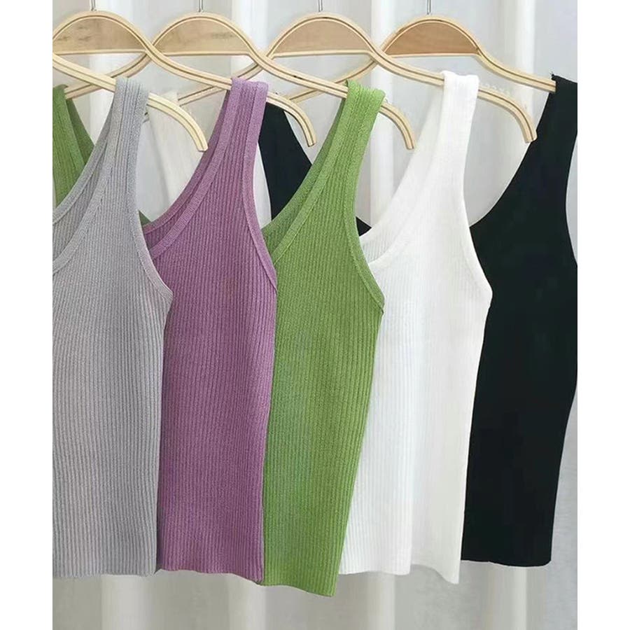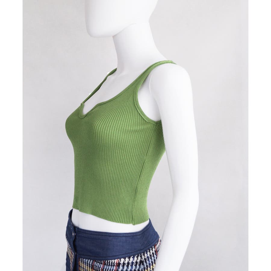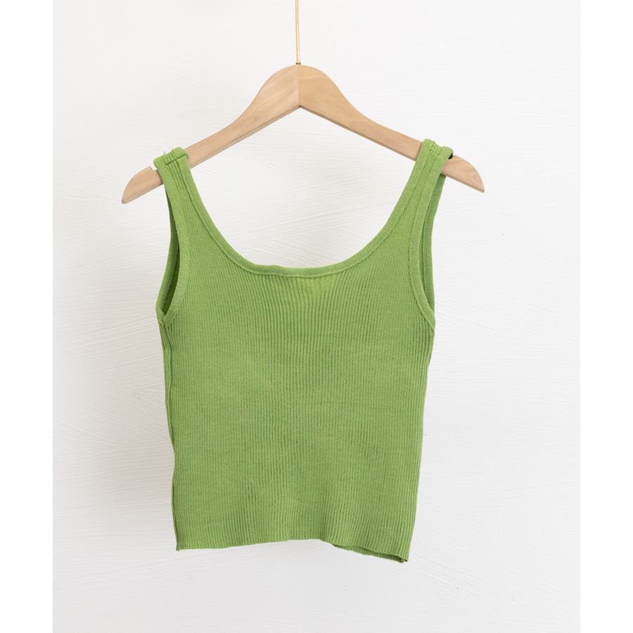 ほどよくフィットするリブニット素材が、ボディラインをきれいに引き立ててくれるタンクトップ