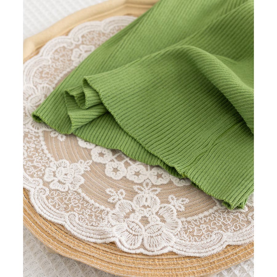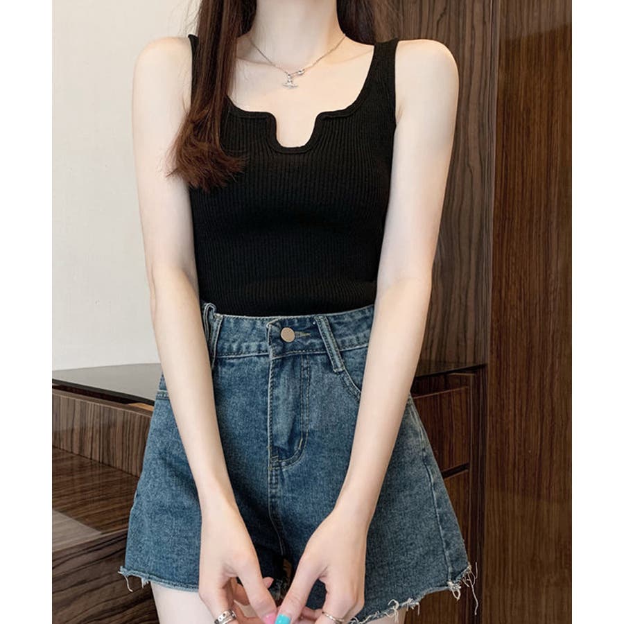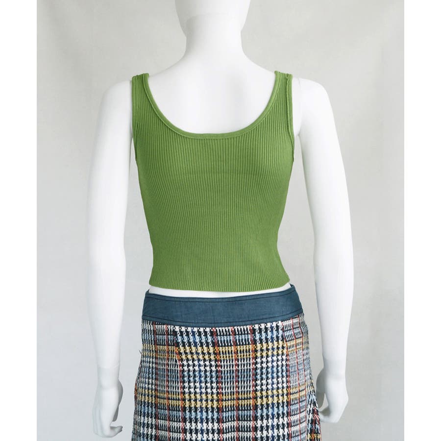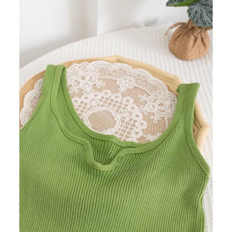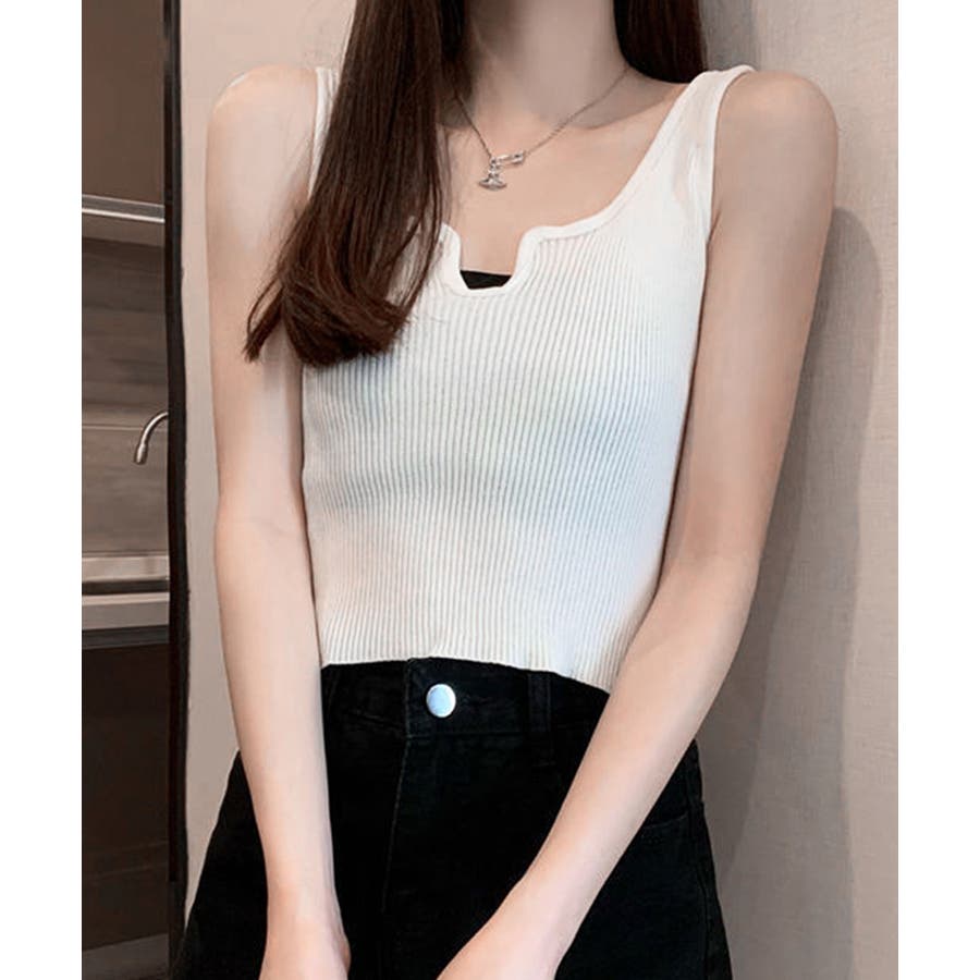 ほどよくフィットするリブニット素材が、ボディラインをきれいに引き立ててくれるタンクトップ