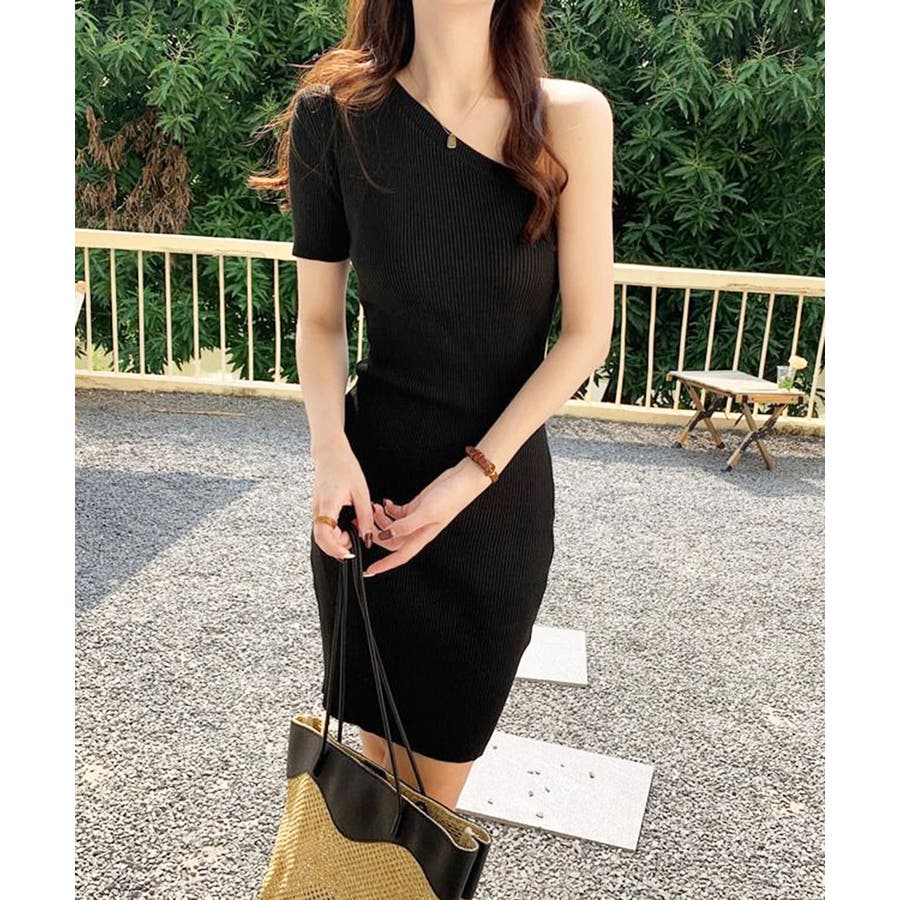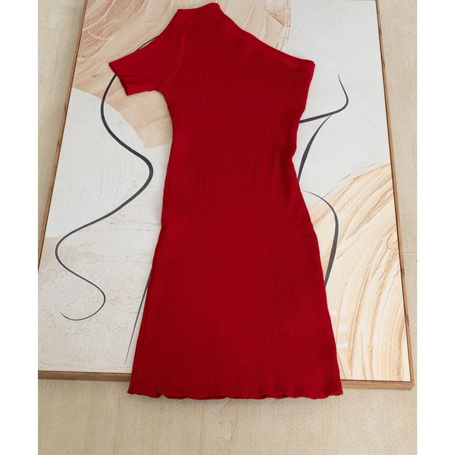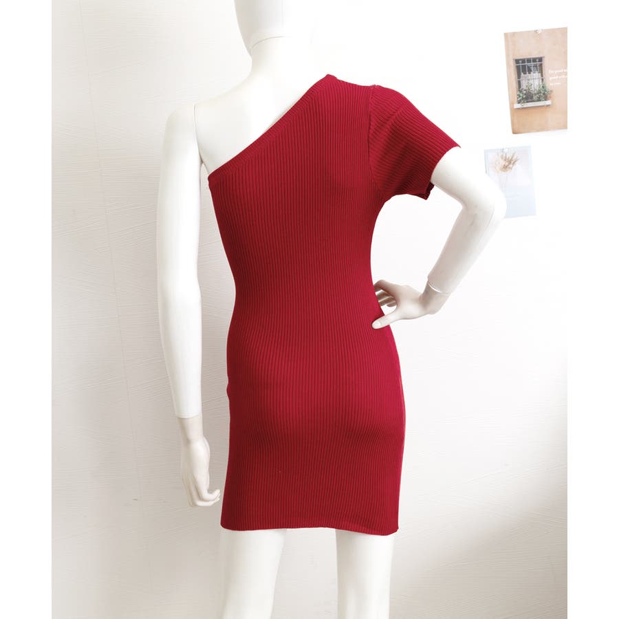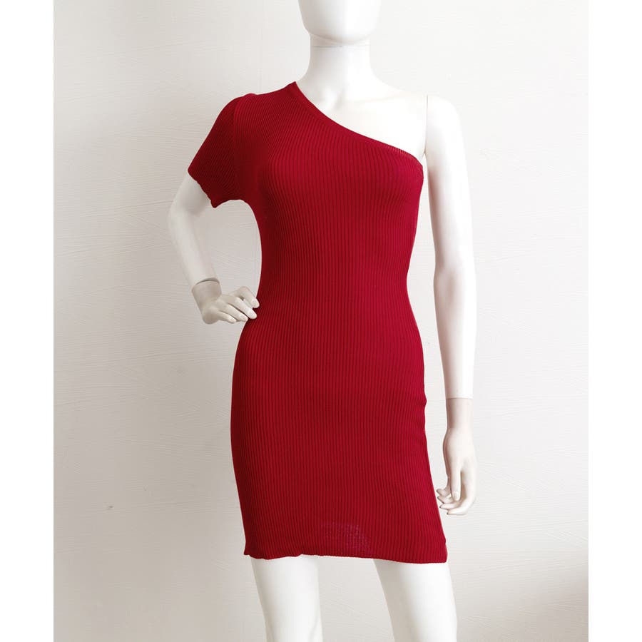 上品さとセクシーさを兼ね備えたワンショルダーデザインが魅力のリブニットワンピース
