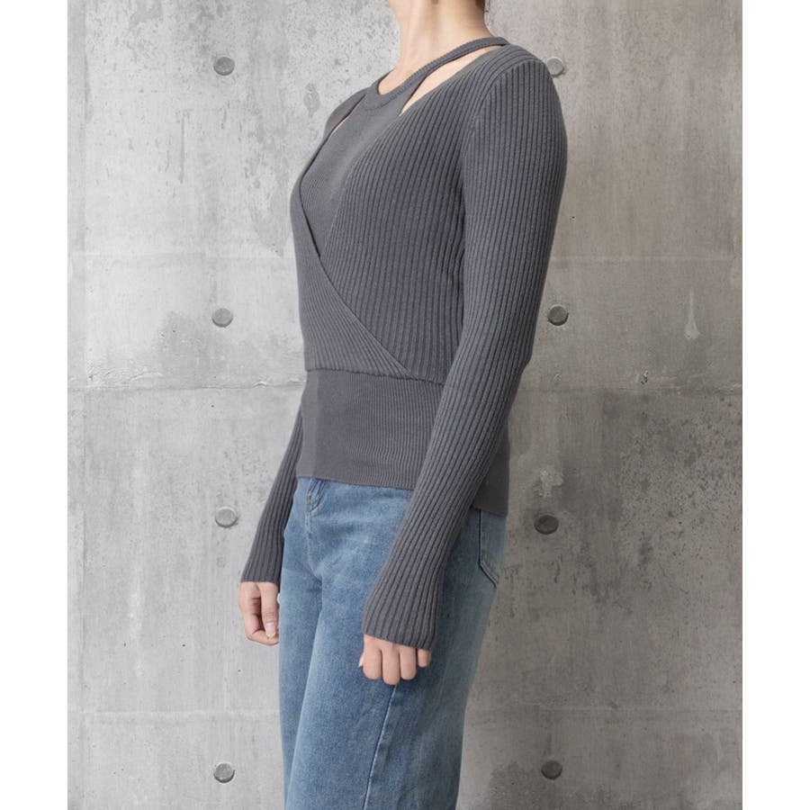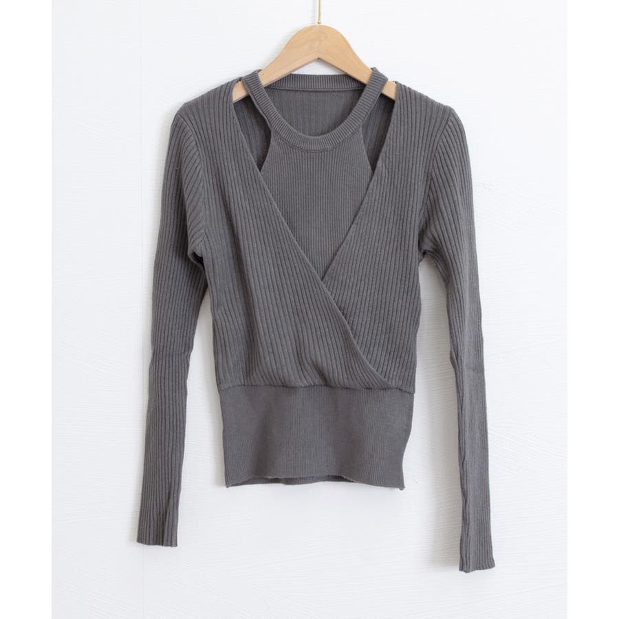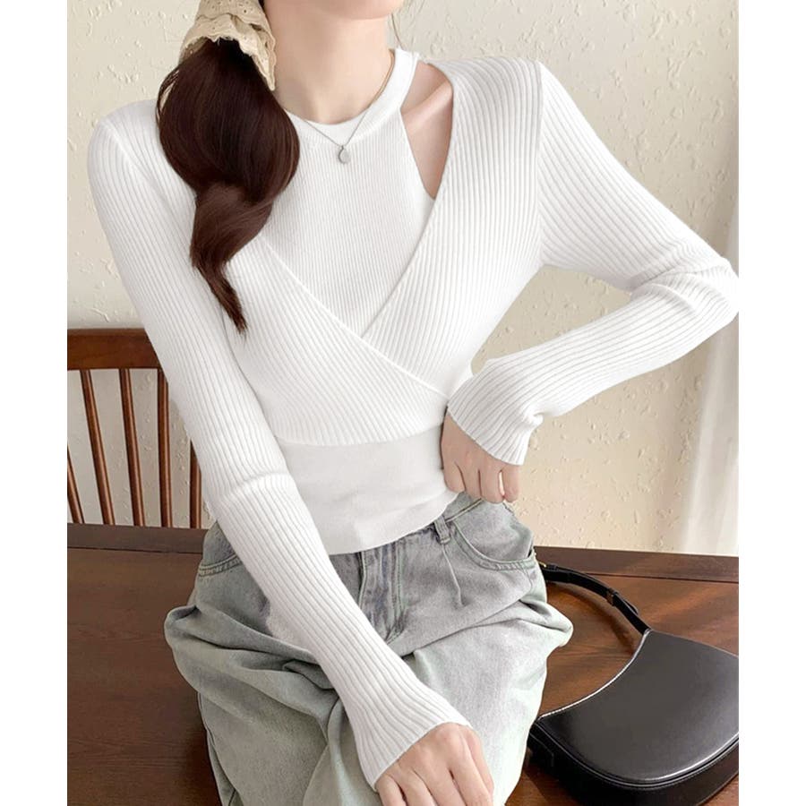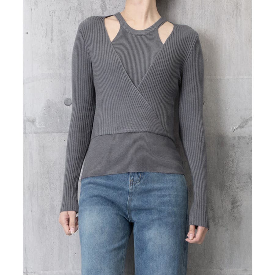 重ね着風のクロスデザインが目を引くリブニットトップス。