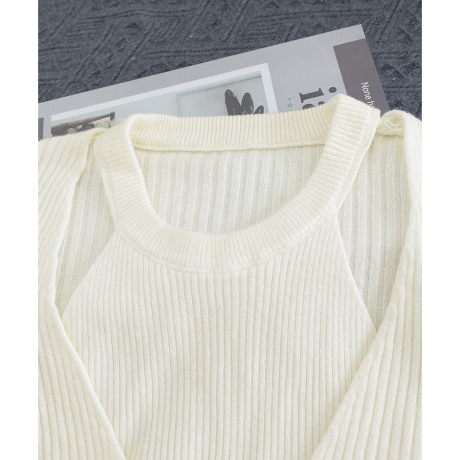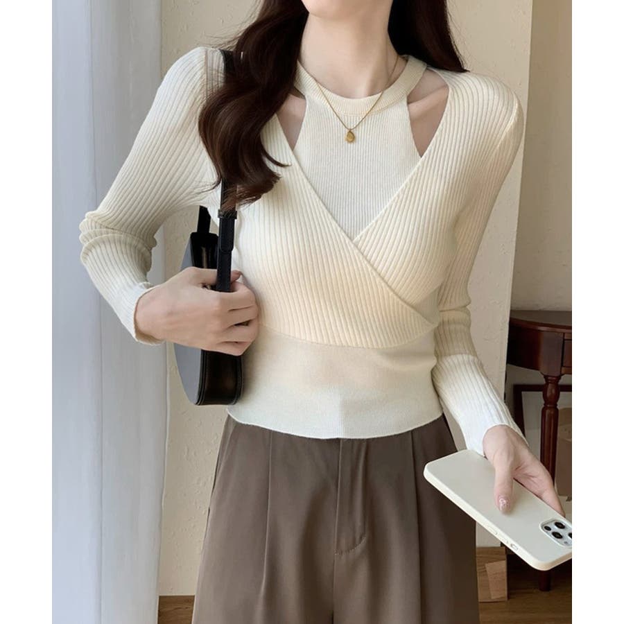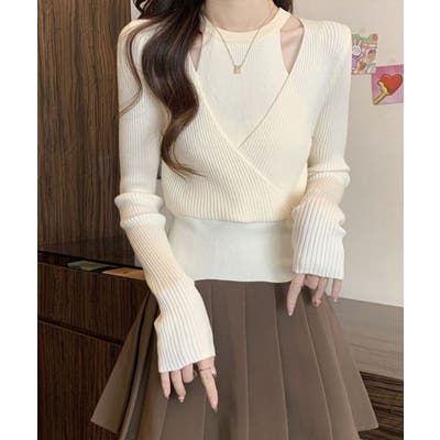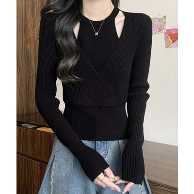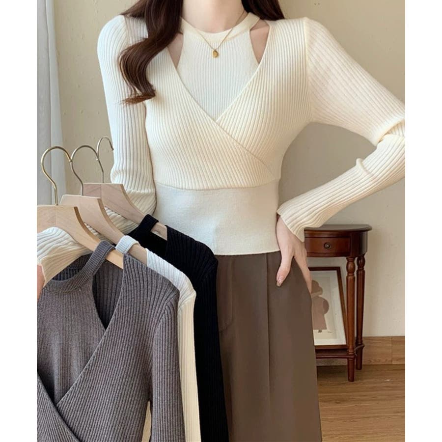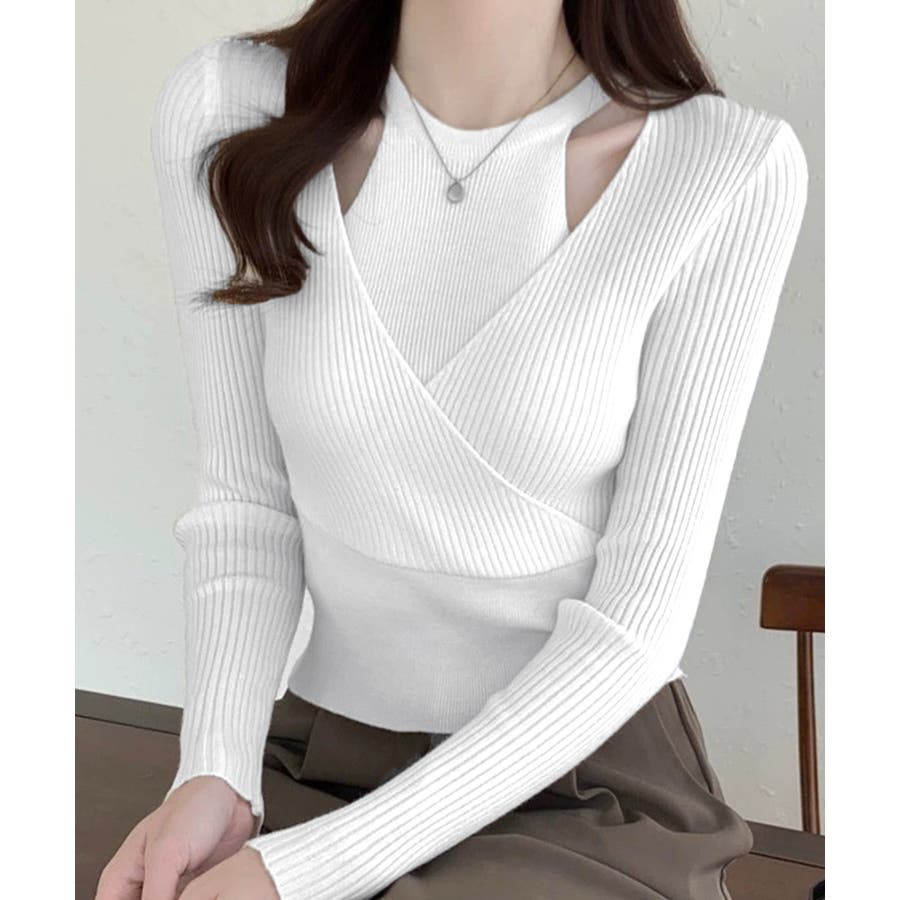 重ね着風のクロスデザインが目を引くリブニットトップス。