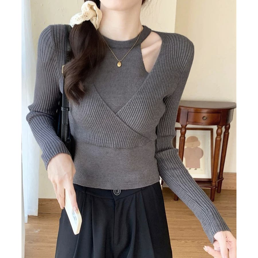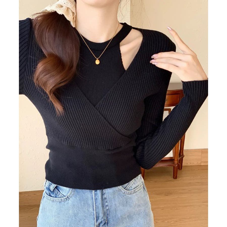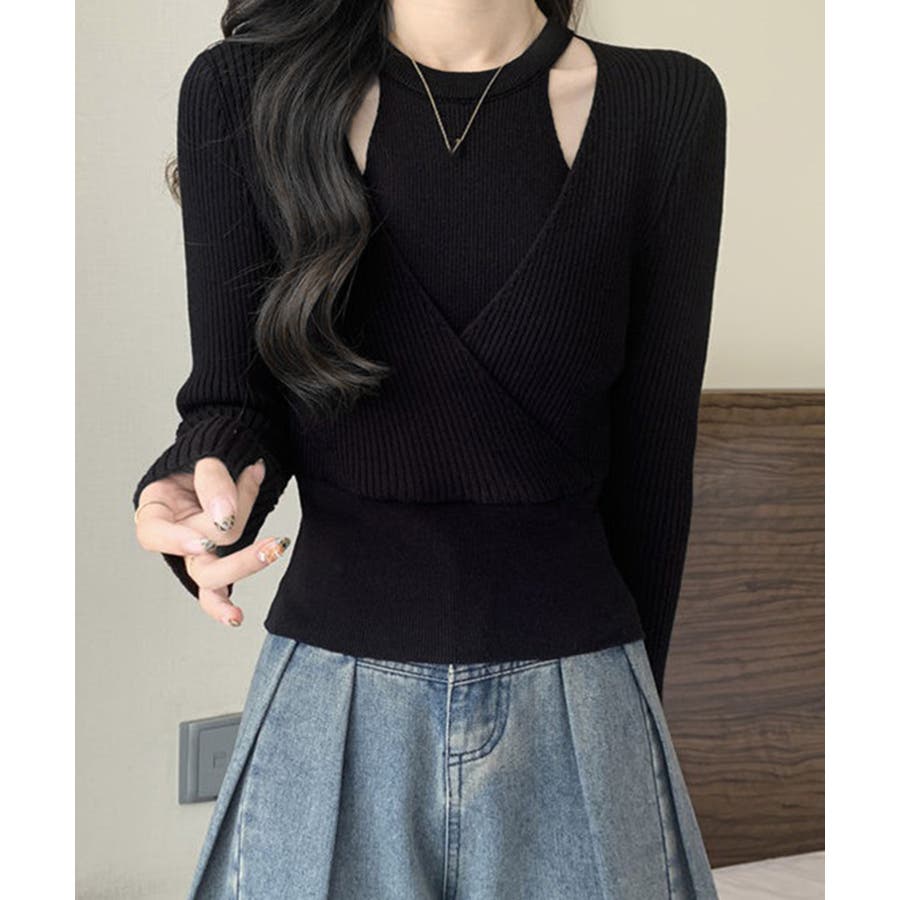 ニットウェア クロスデザイン リブニット ショート丈 着やせ服 ニットインナー 無地 韓国ファッション ニットセーター