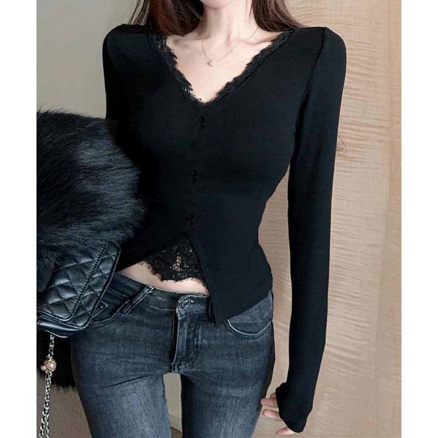 無地重ね着Tシャツ レース付きトップス 秋冬タイトトップス
