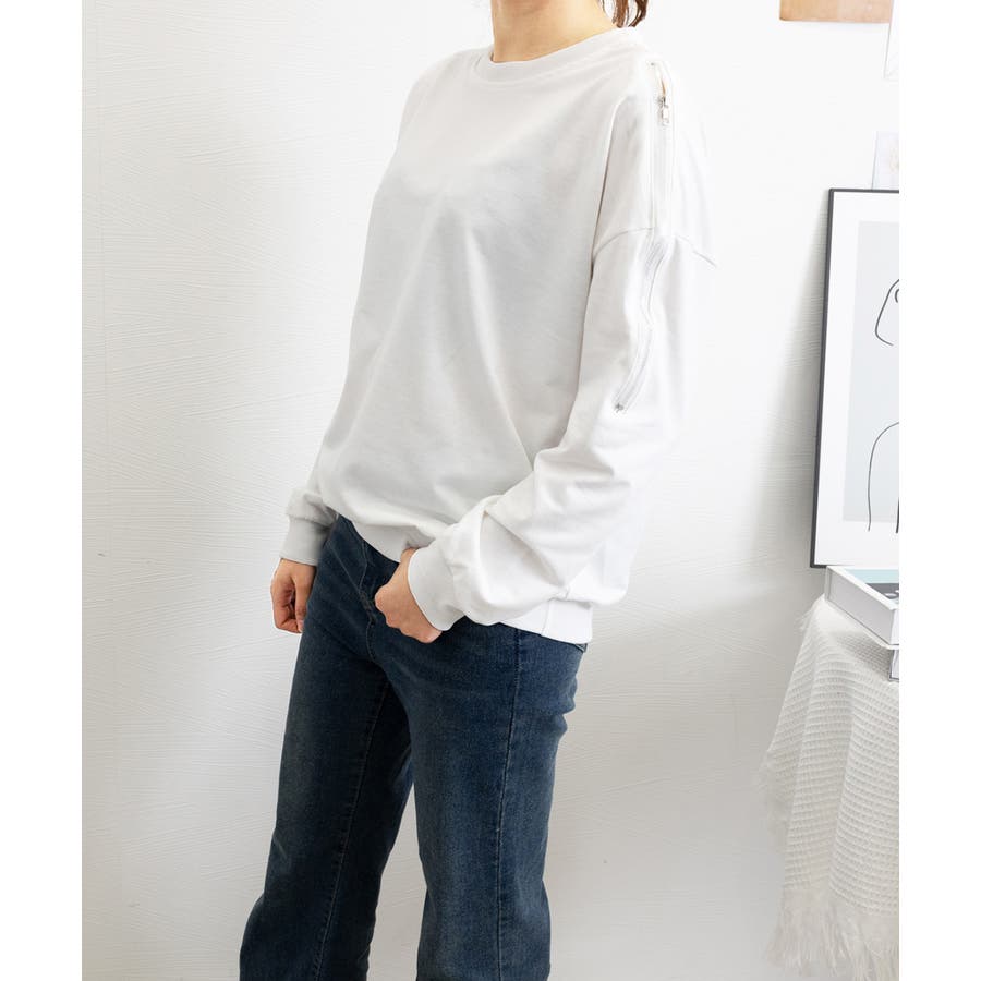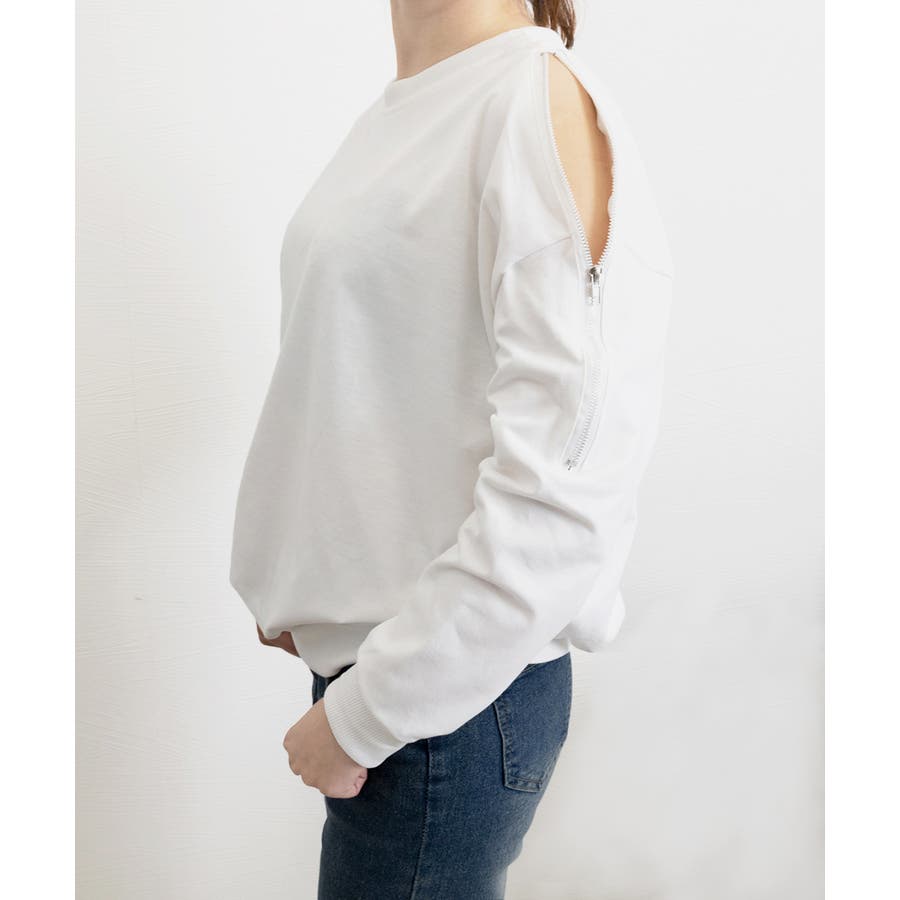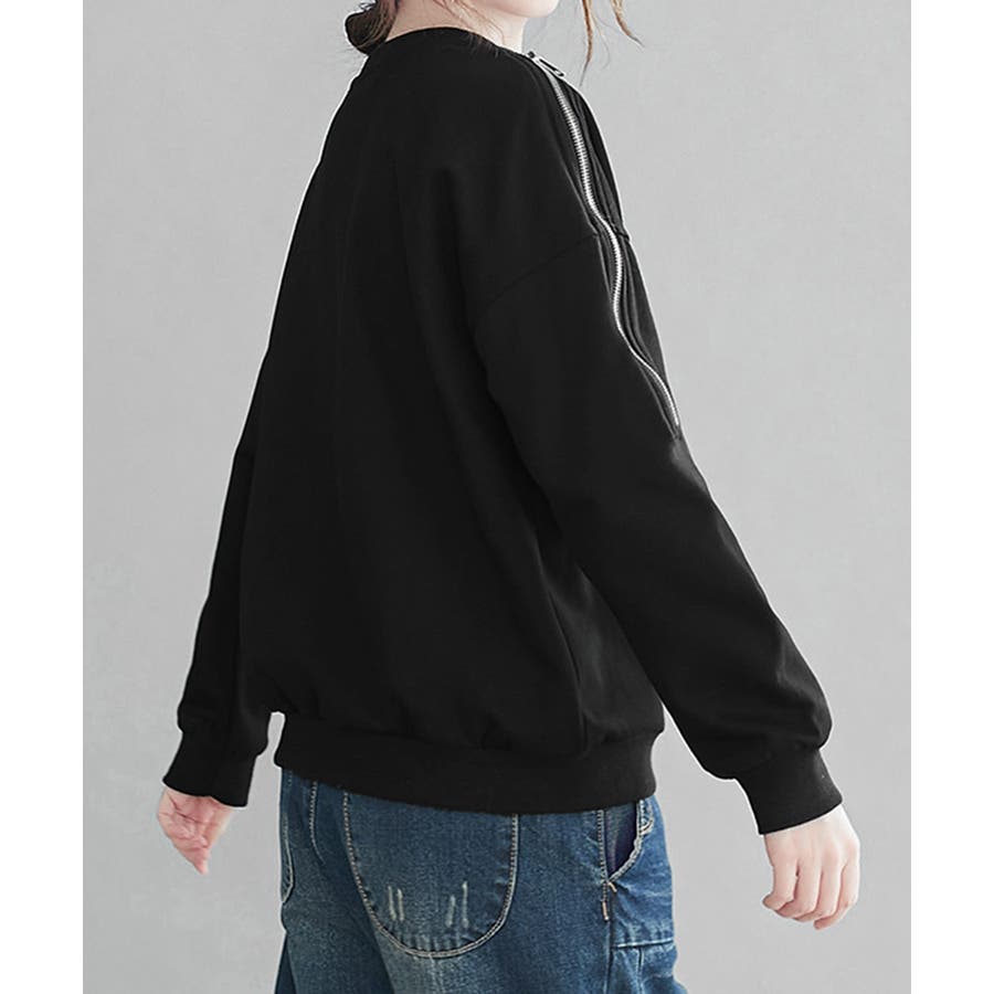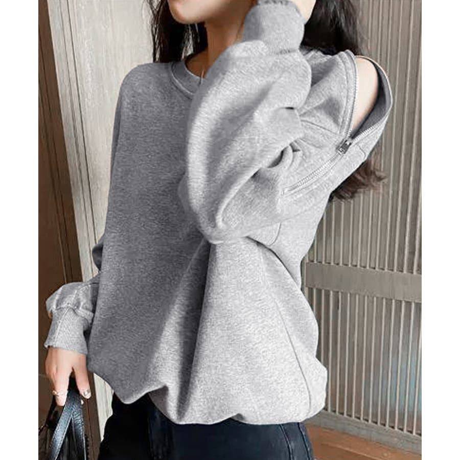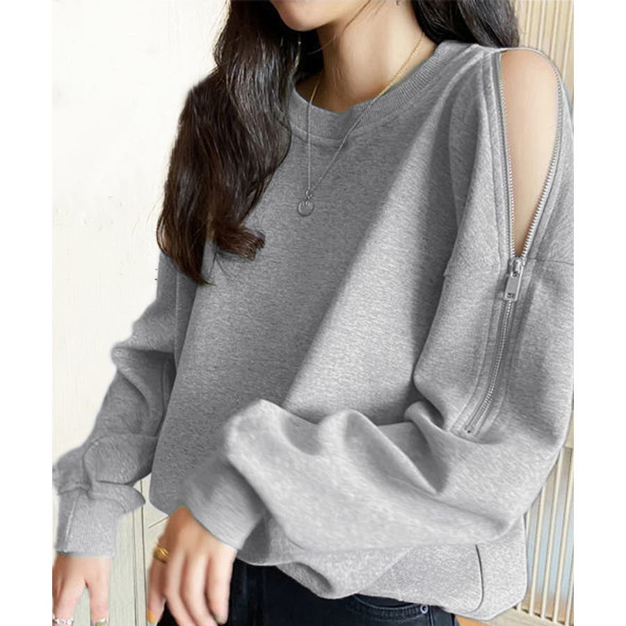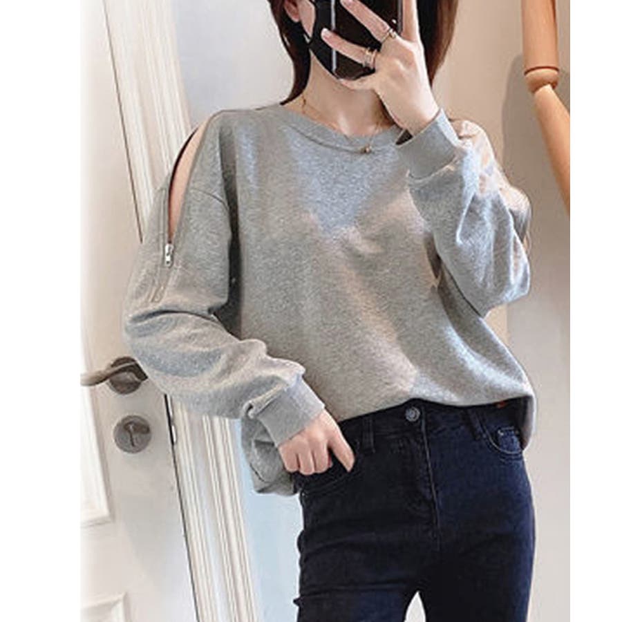 スウェット クルーネック 肩出しトップス 薄手 ゆったり セクシー ファスナー 大人カジュアル 体型カバー カットソー