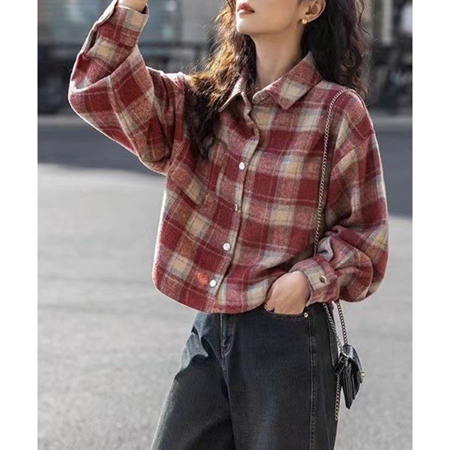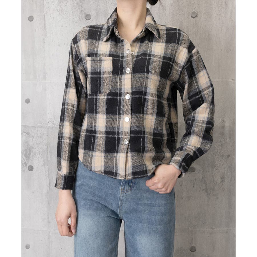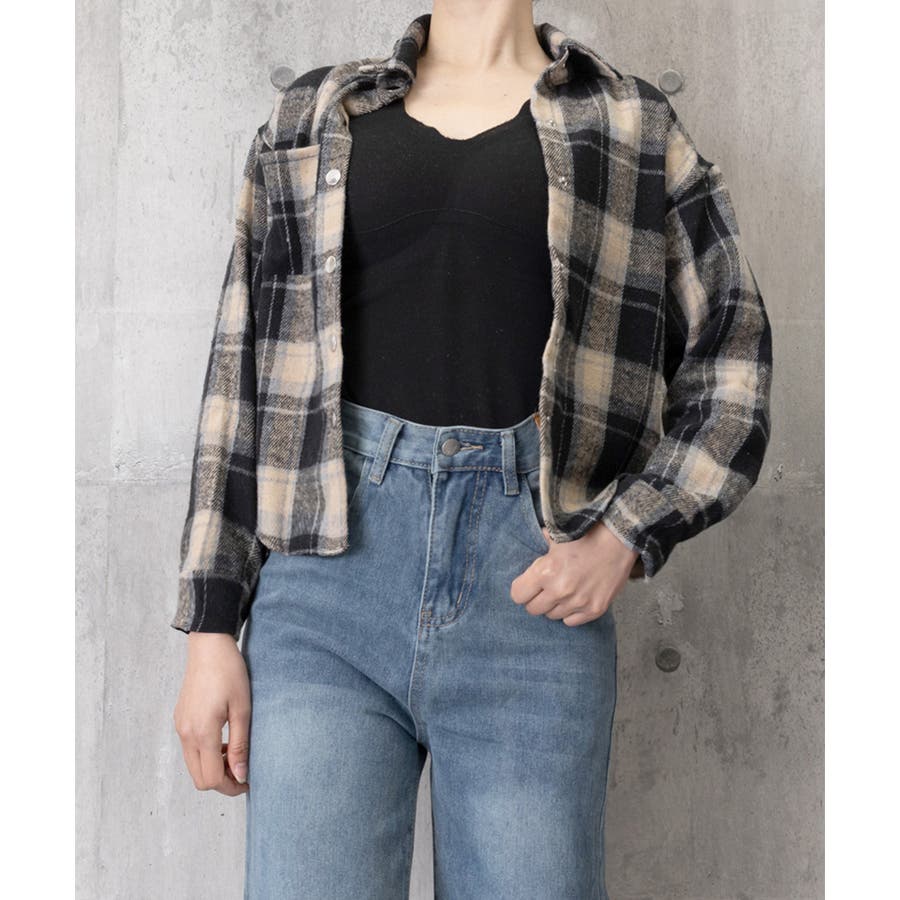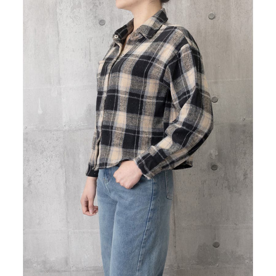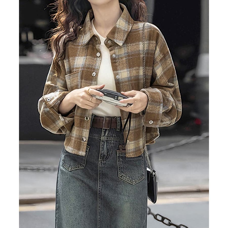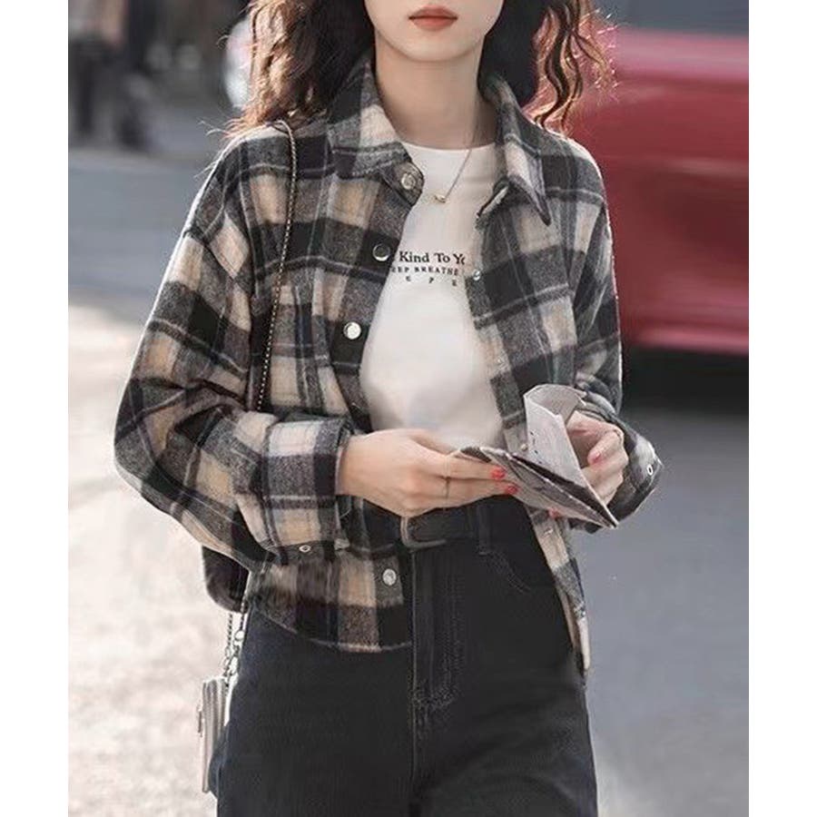ショート丈が今っぽい、チェック柄シャツトップス。