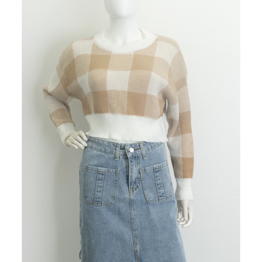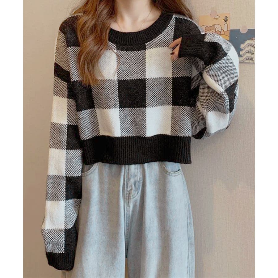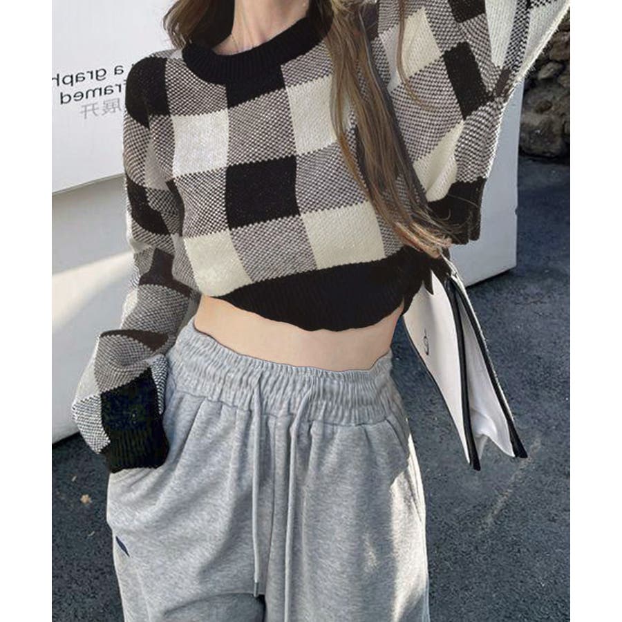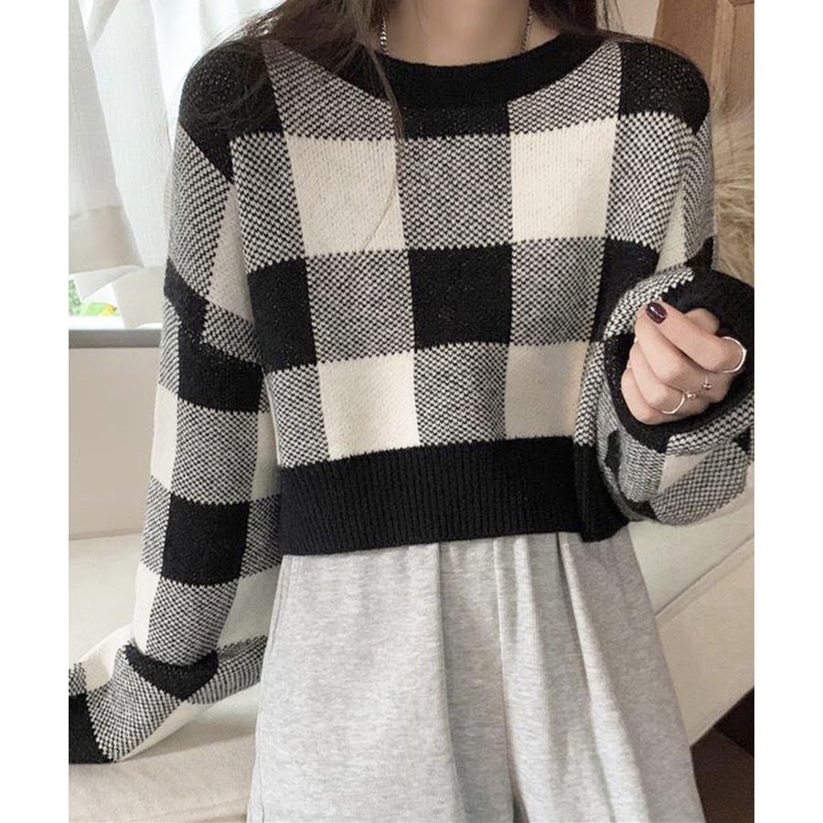 大きめチェック柄が特徴のショート丈ニットトップス
