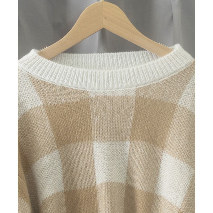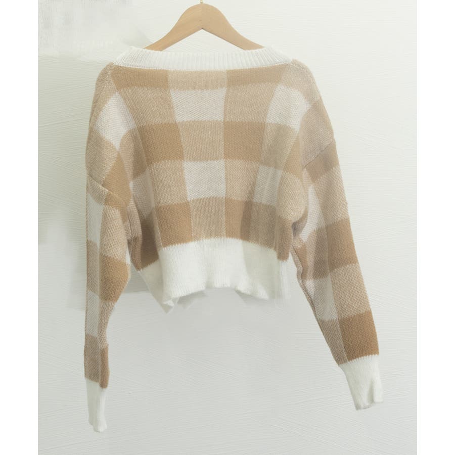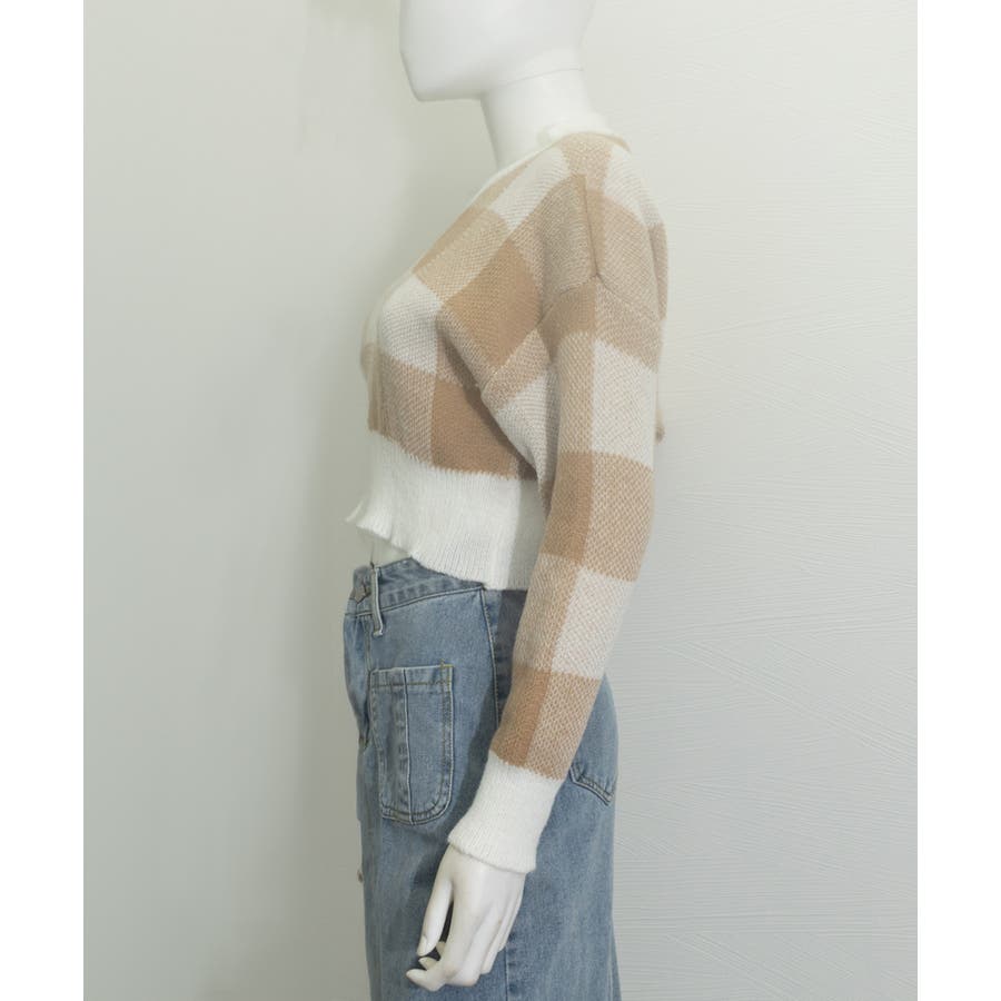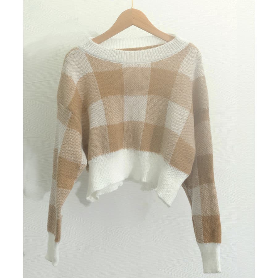 大きめチェック柄が特徴のショート丈ニットトップス