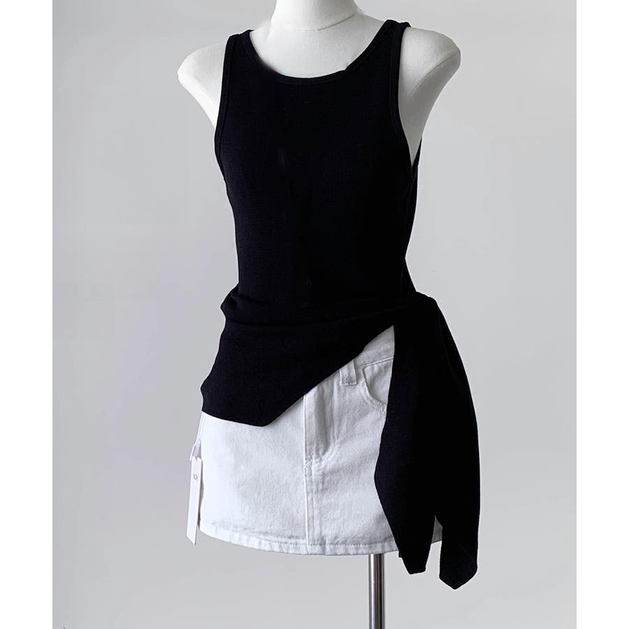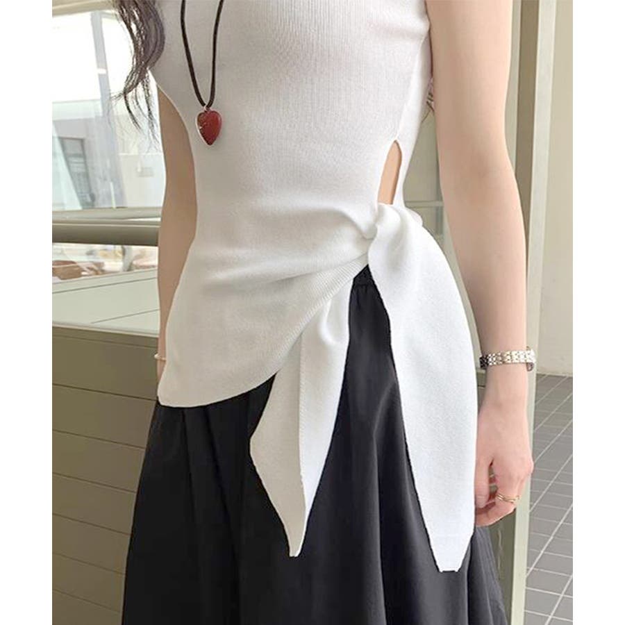 トレンド感あふれるアシンメトリーデザインが目を惹くノースリーブニットトップス。
