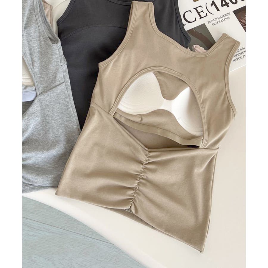 程よい肌見せで、ヘルシーさとセクシーさを兼ね備えたカップ付きタンクトップ。