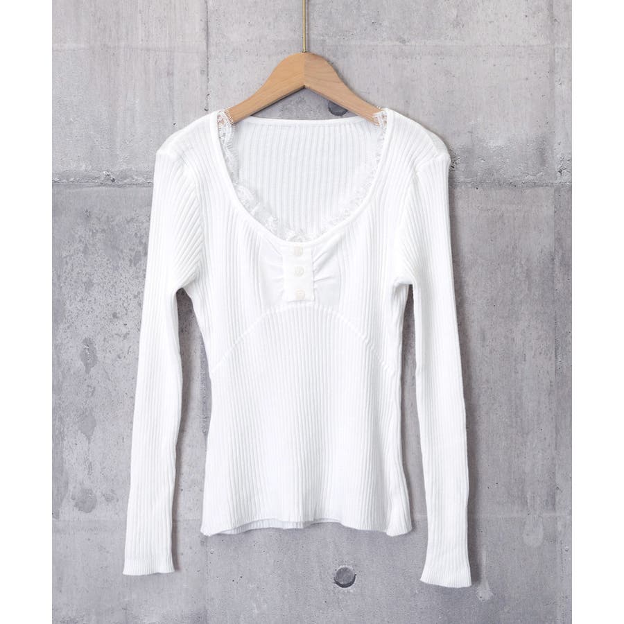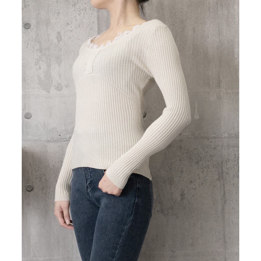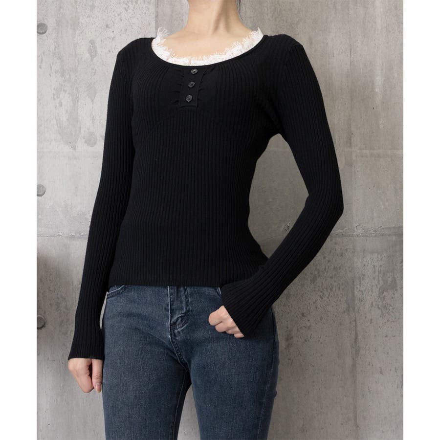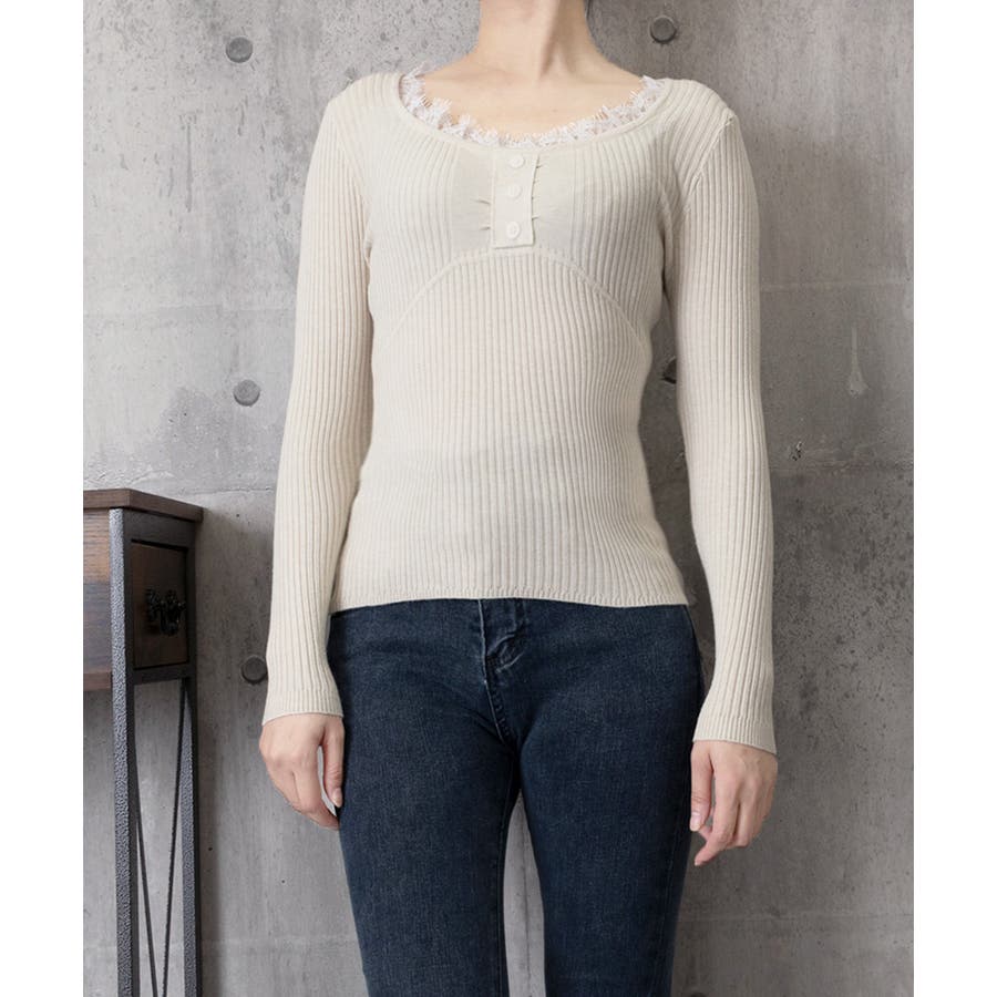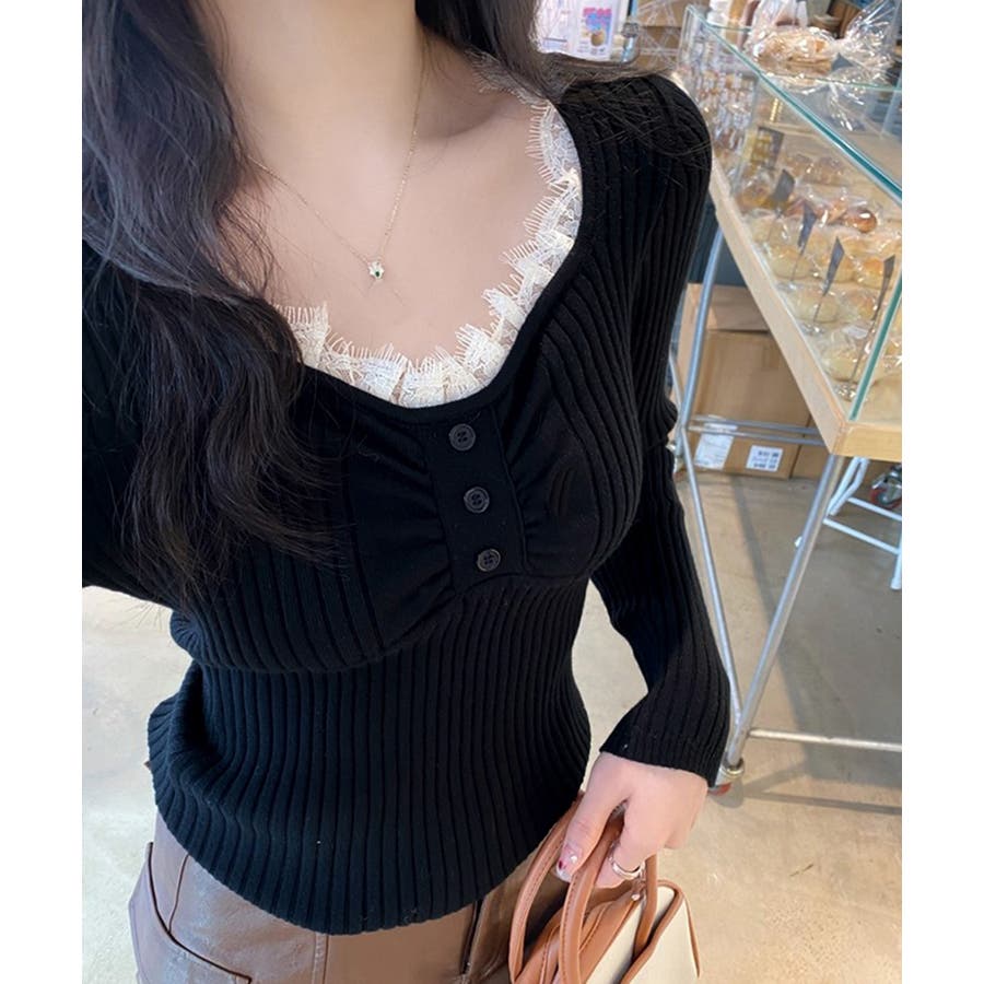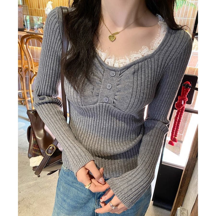 ニットトップス レースネック 長袖 秋冬