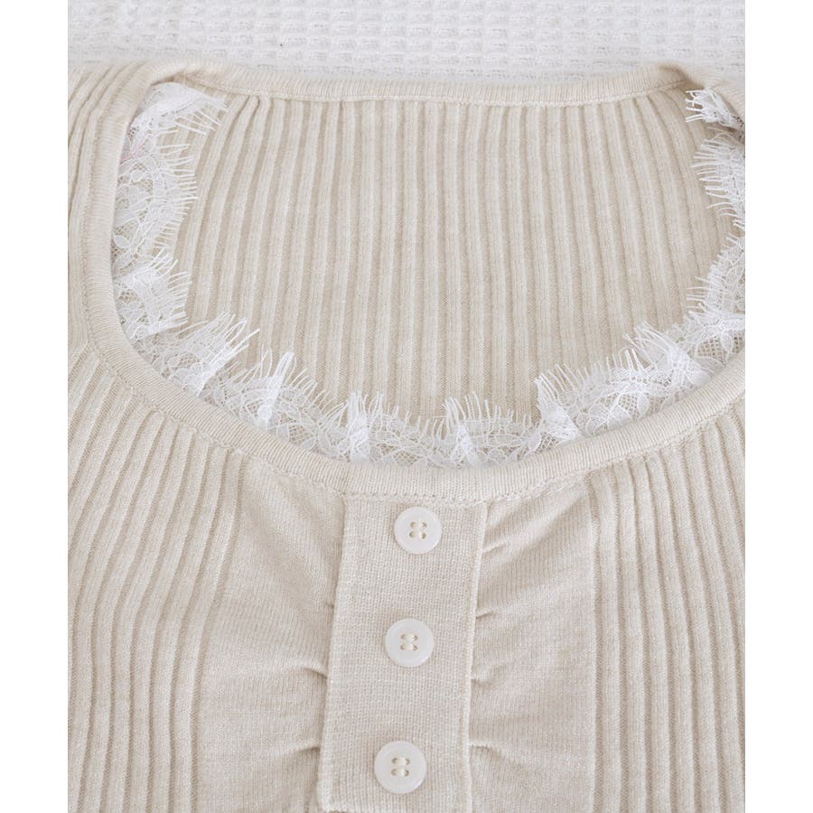繊細なレースネックが女性らしいフェミニンな雰囲気をプラス。