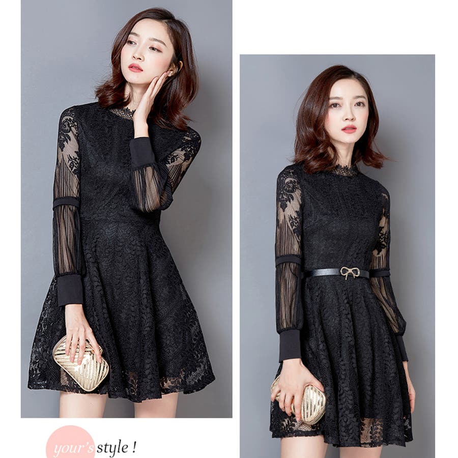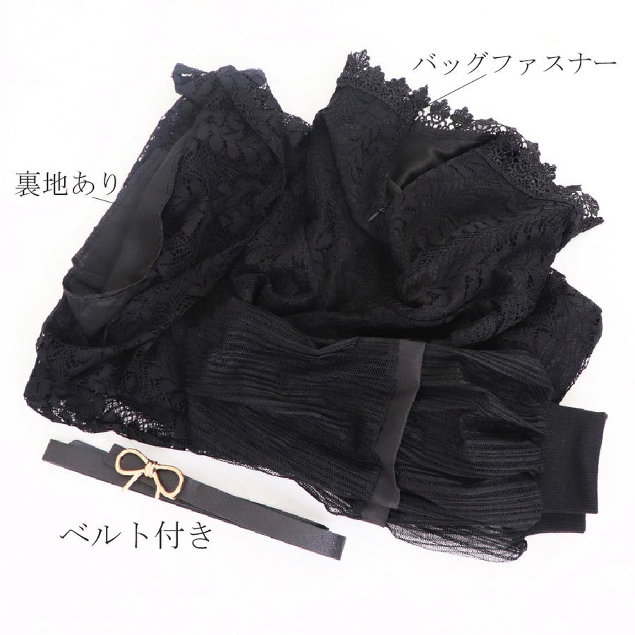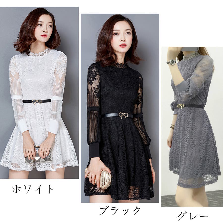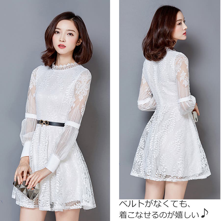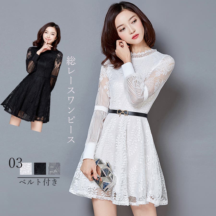 ワンピース 総レース レディース フレアワンピ スカラップ ベルト付き パーティードレス 透け感 パフスリーブ 披露宴