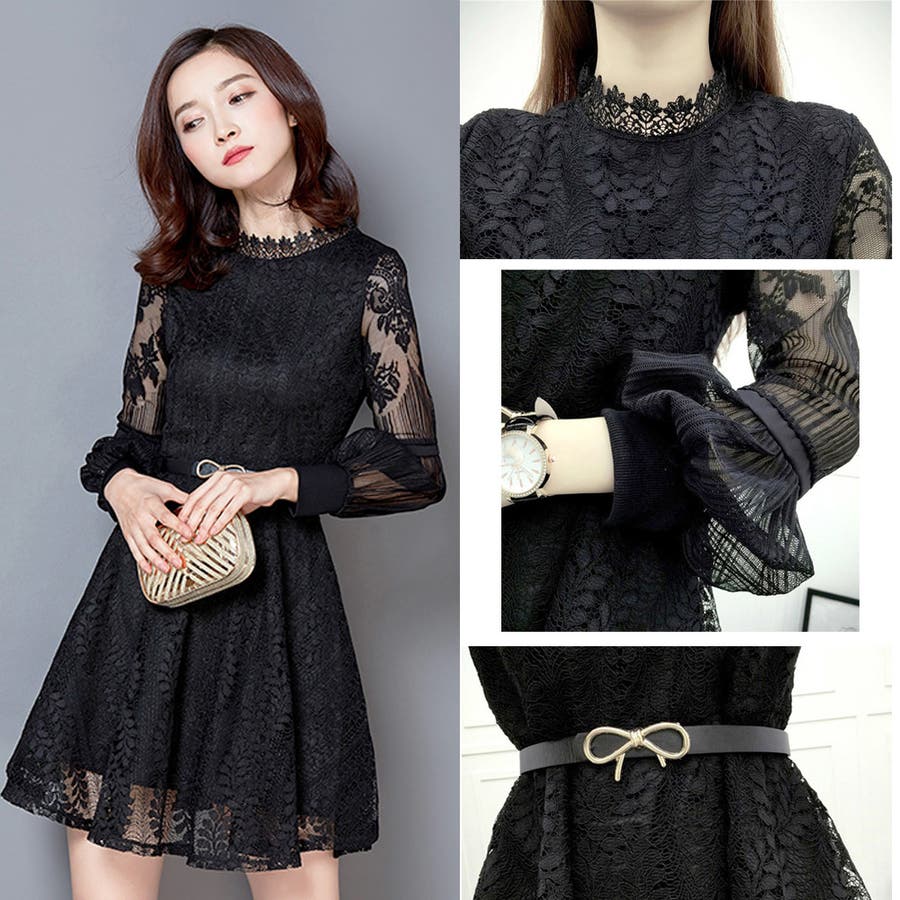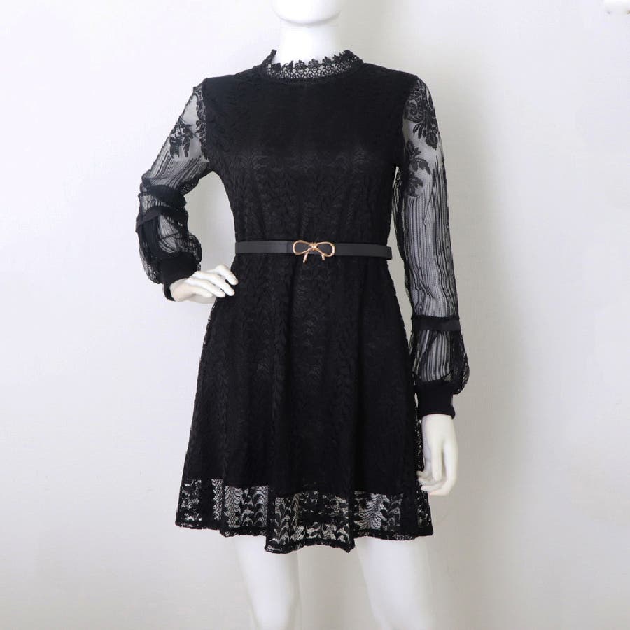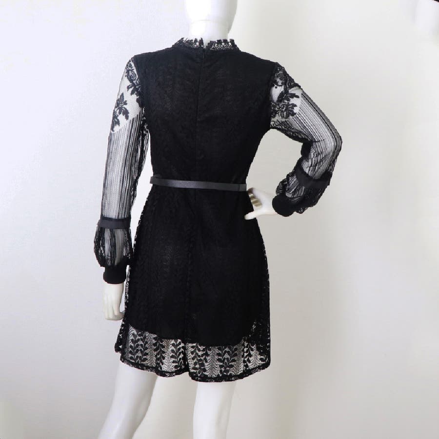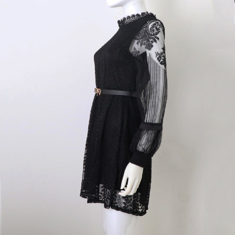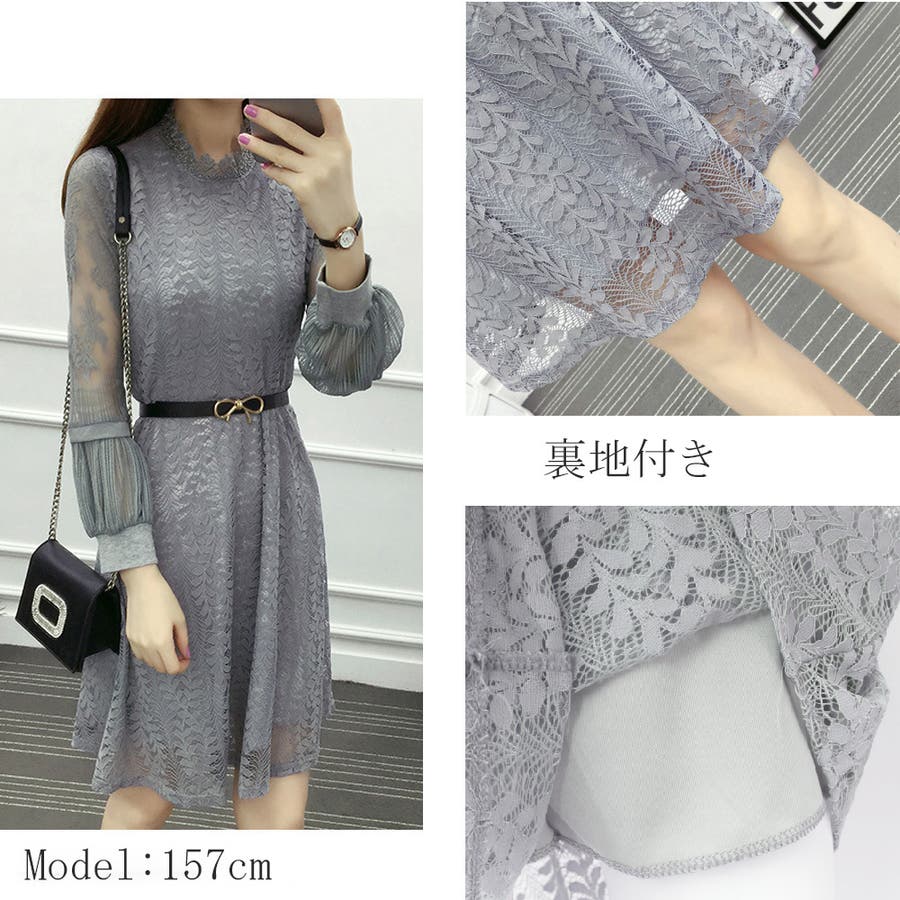 ワンピース 総レース レディース フレアワンピ スカラップ ベルト付き パーティードレス 透け感 パフスリーブ 披露宴