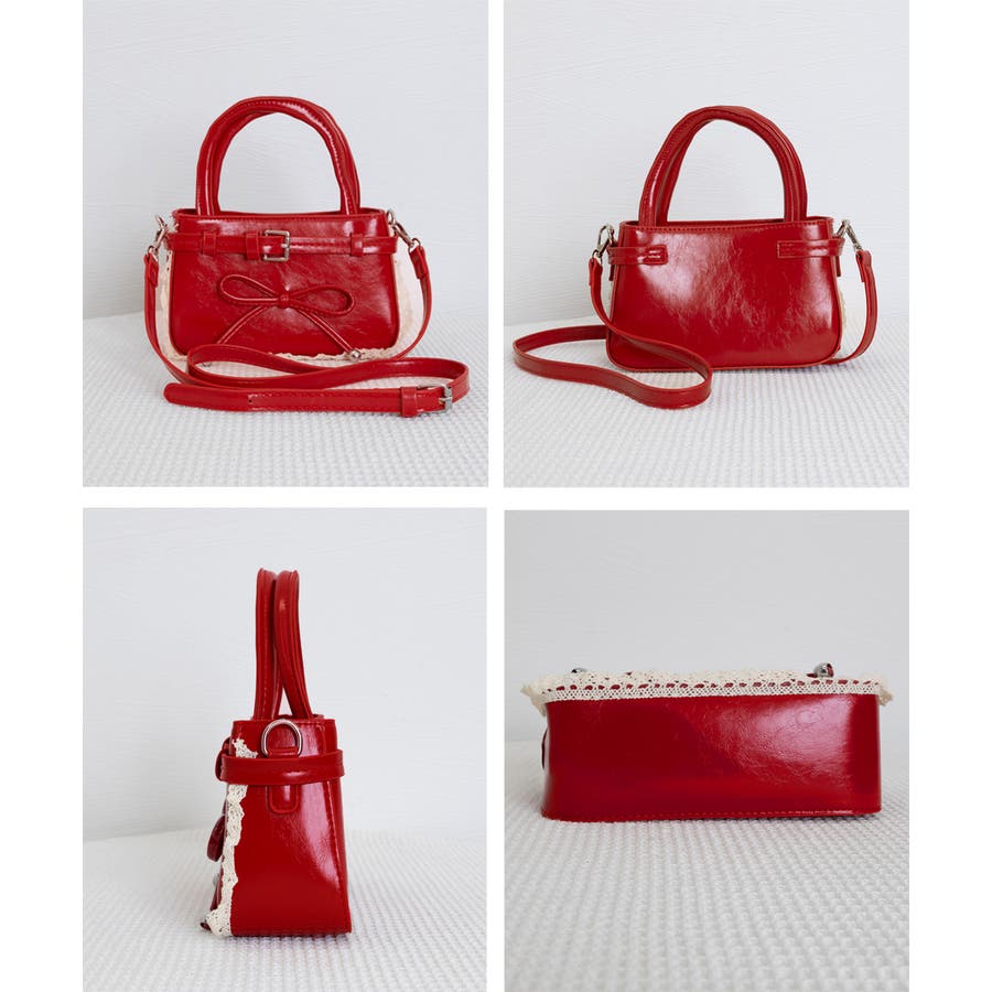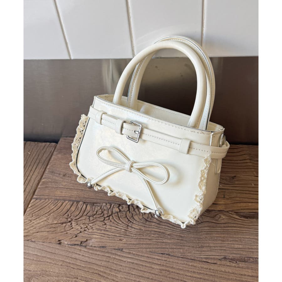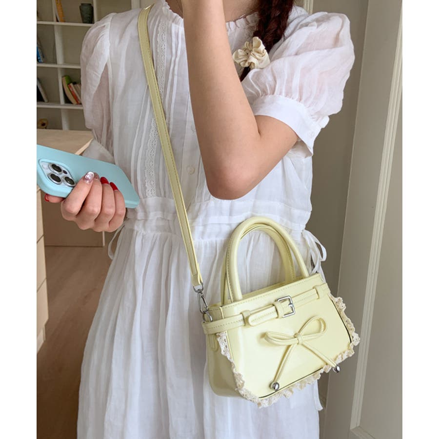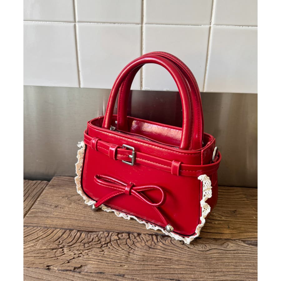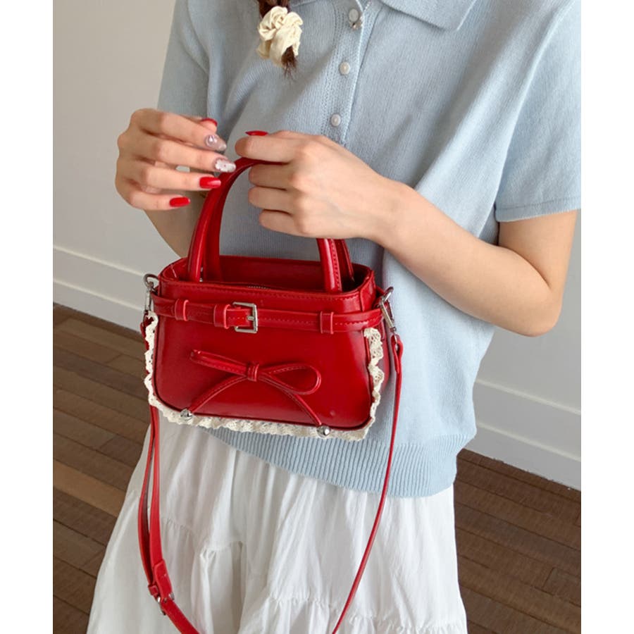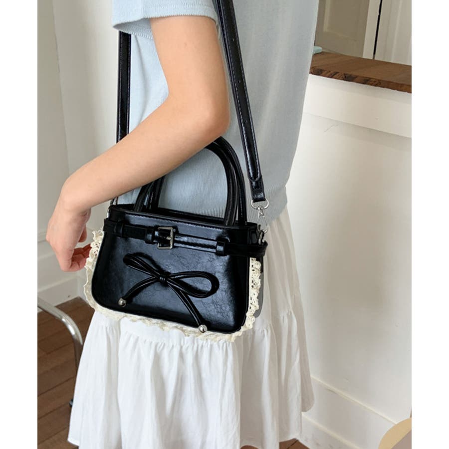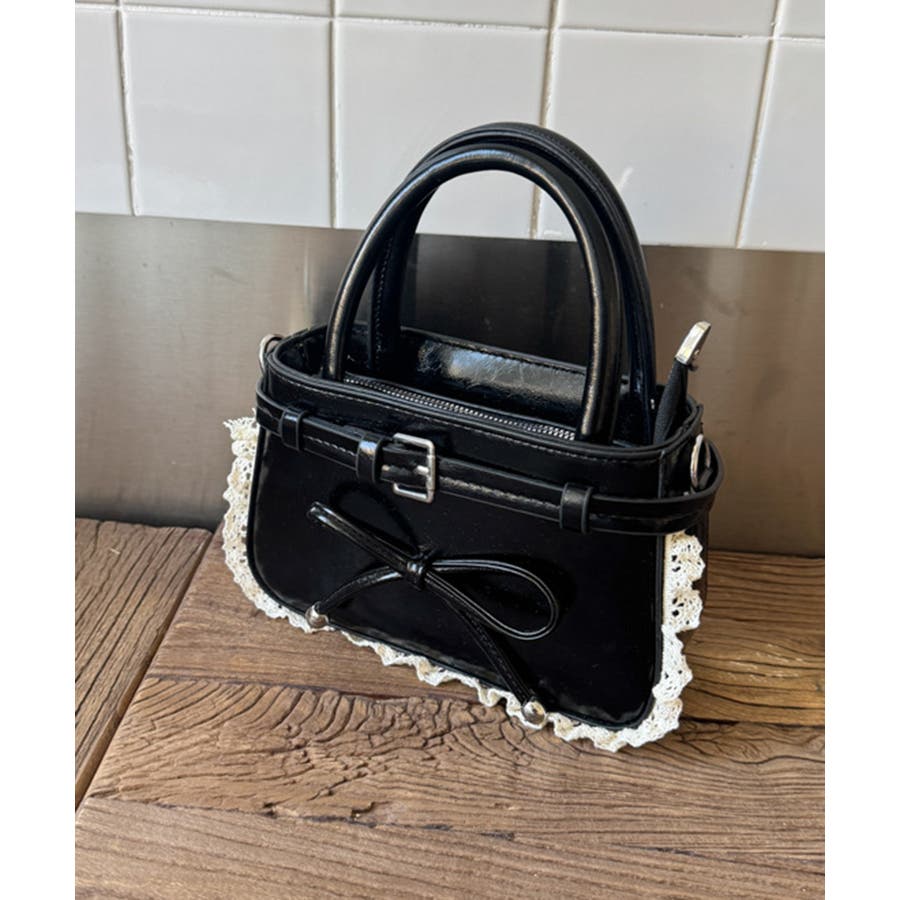 フロントのリボンと縁にあしらわれたレースが目を惹く、フェイクレザー素材の2WAYミニバッグ。