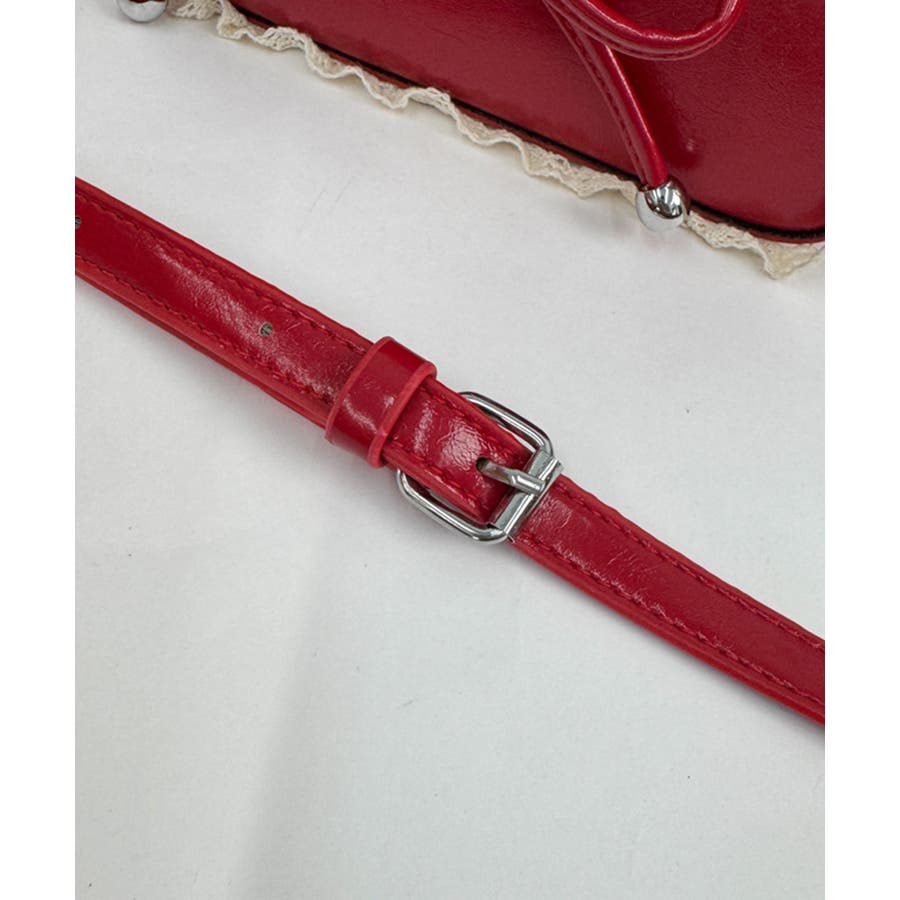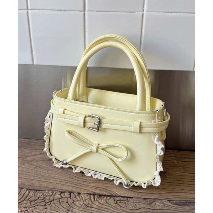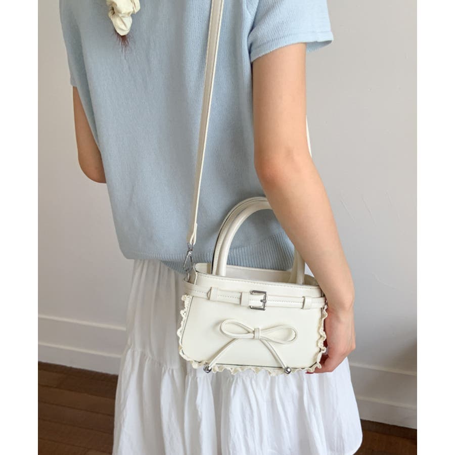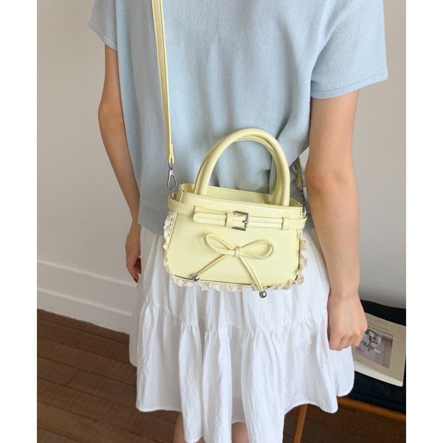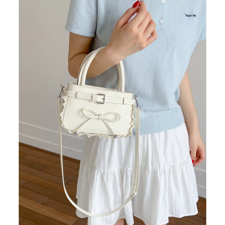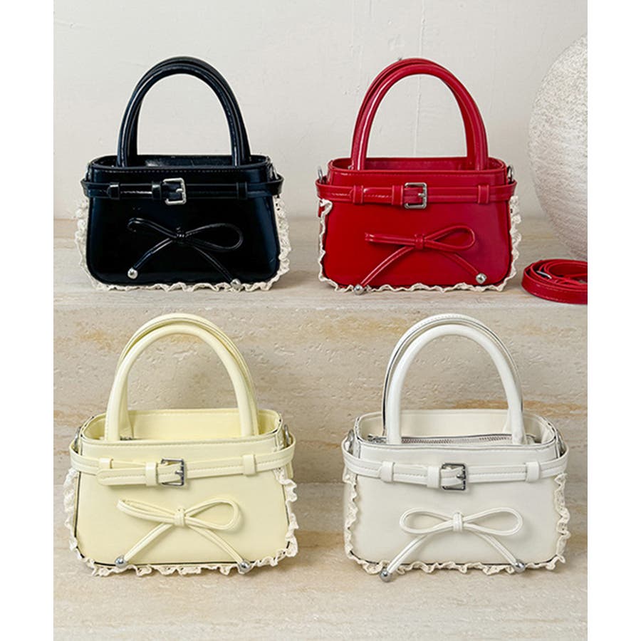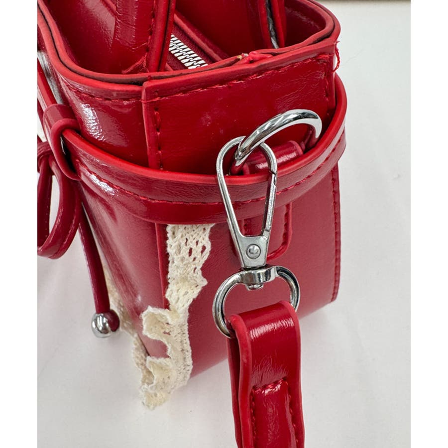 フロントのリボンと縁にあしらわれたレースが目を惹く、フェイクレザー素材の2WAYミニバッグ。
