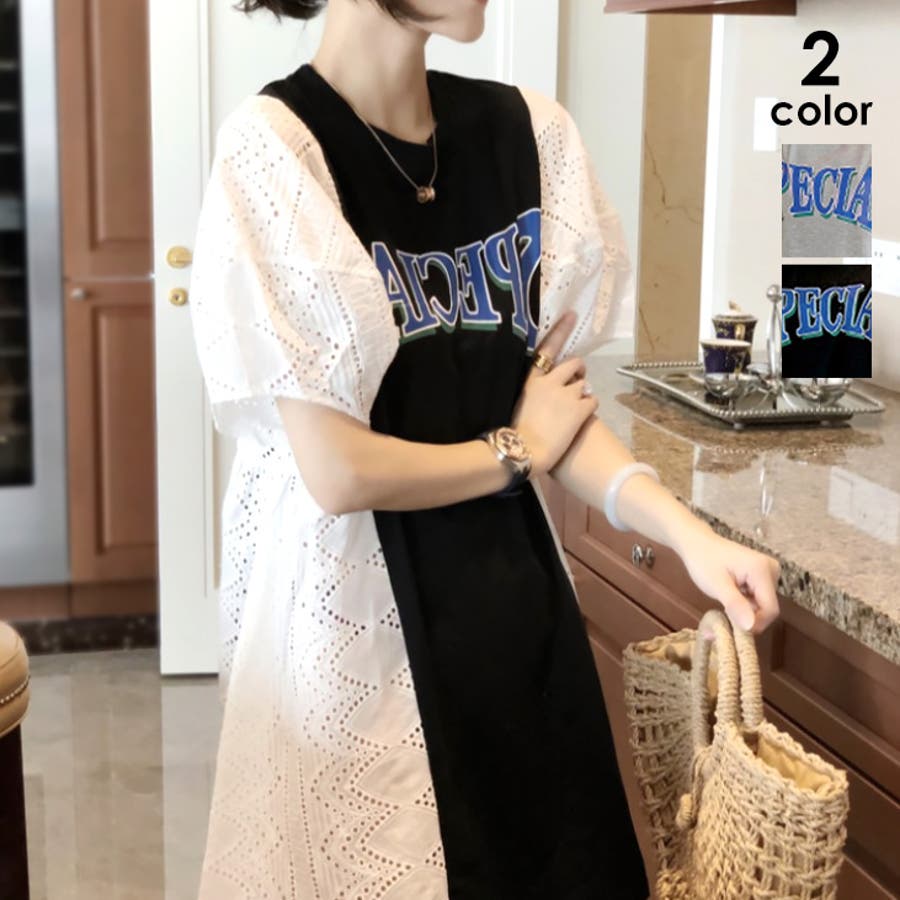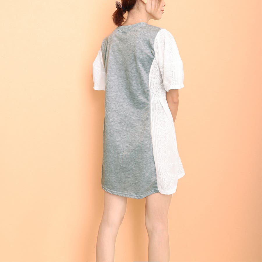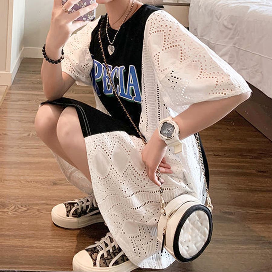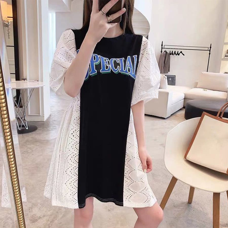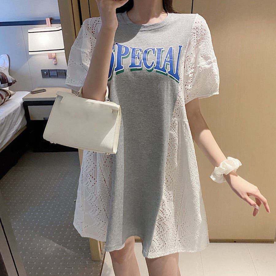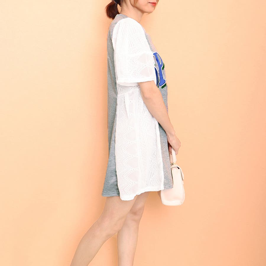 tシャツ素材にパンチングレースの異素材mix英字ロゴミニ丈ワンピース
