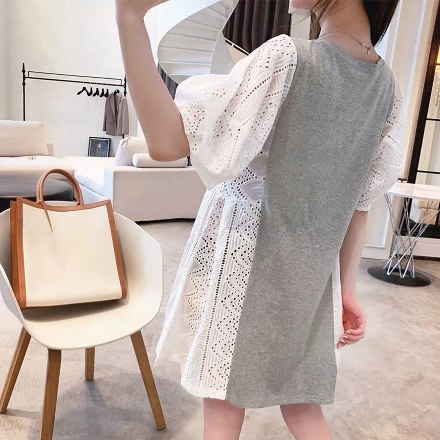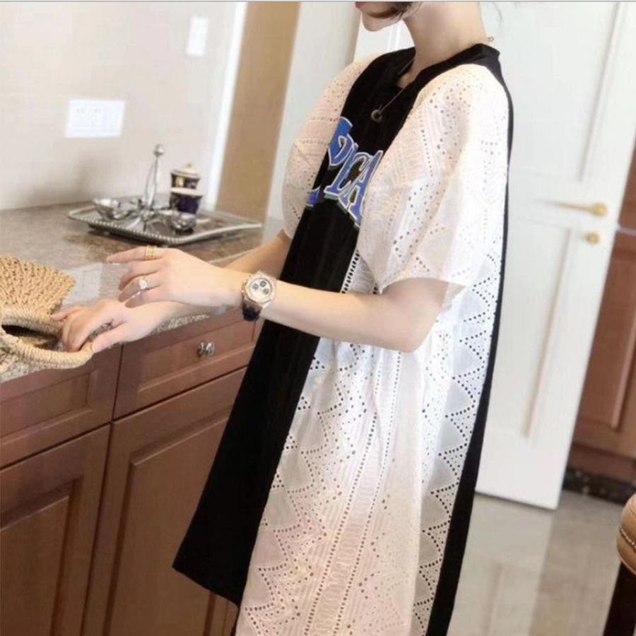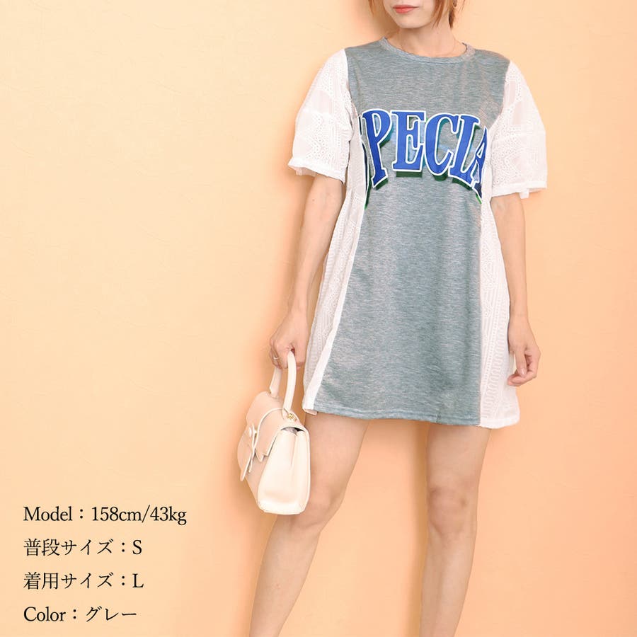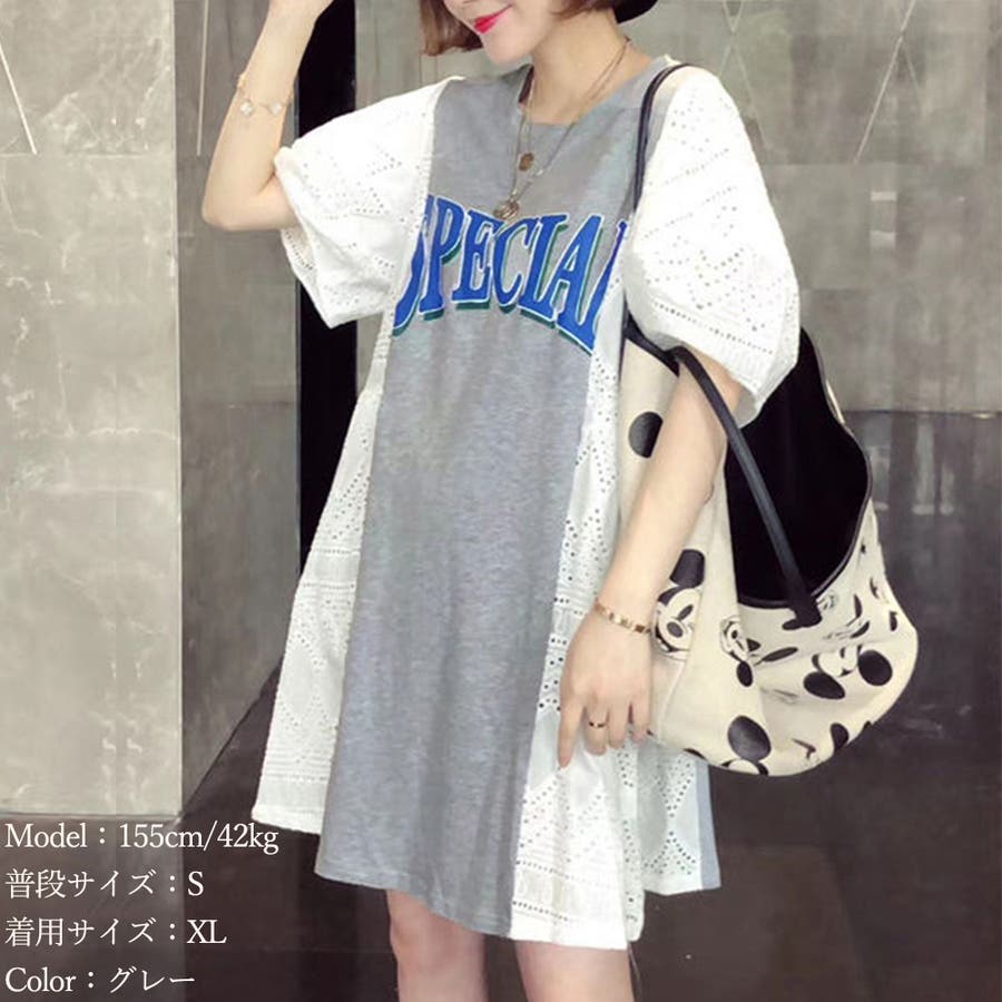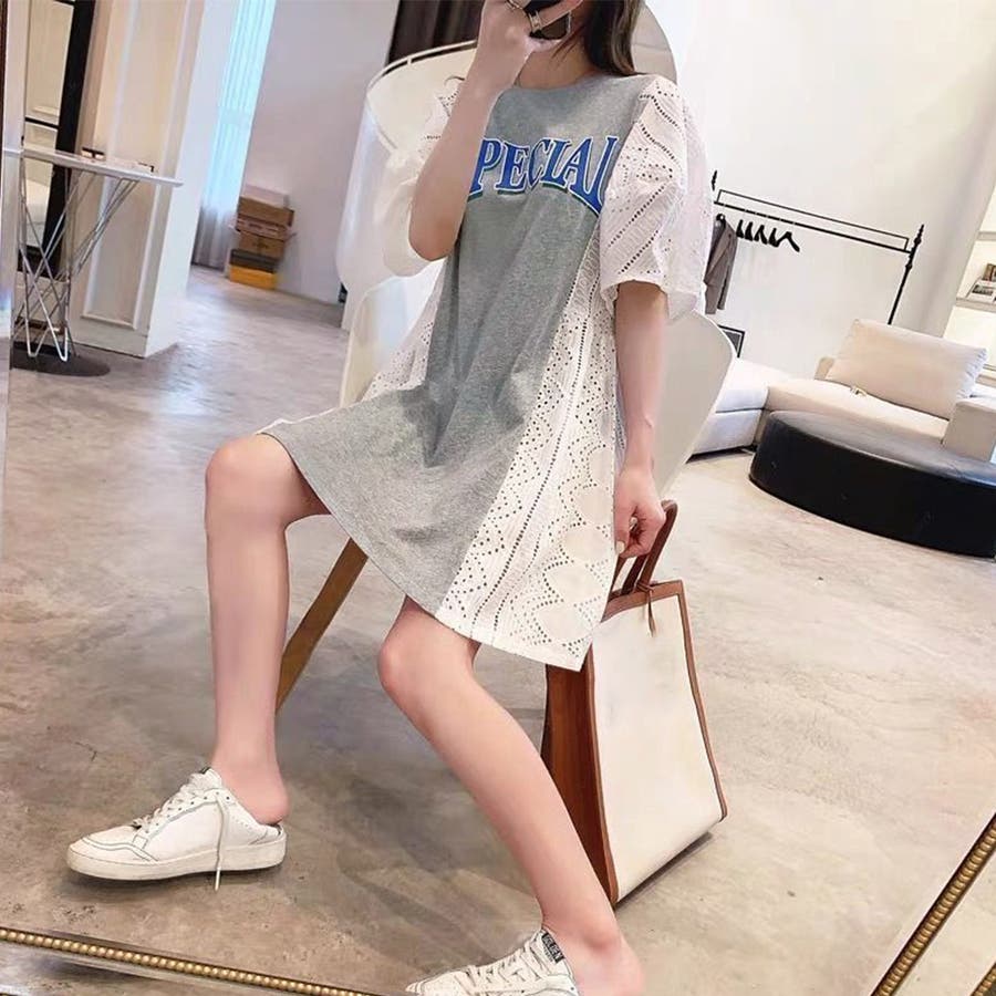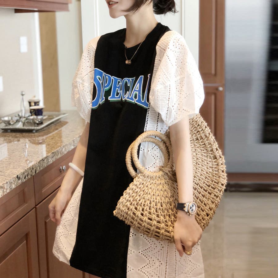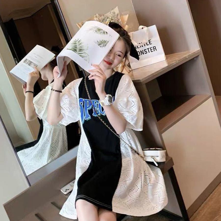 tシャツ素材にパンチングレースの異素材mix英字ロゴミニ丈ワンピース