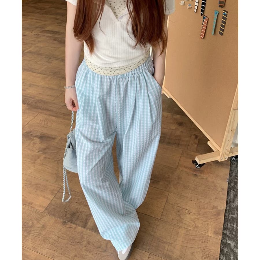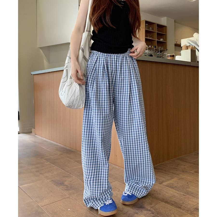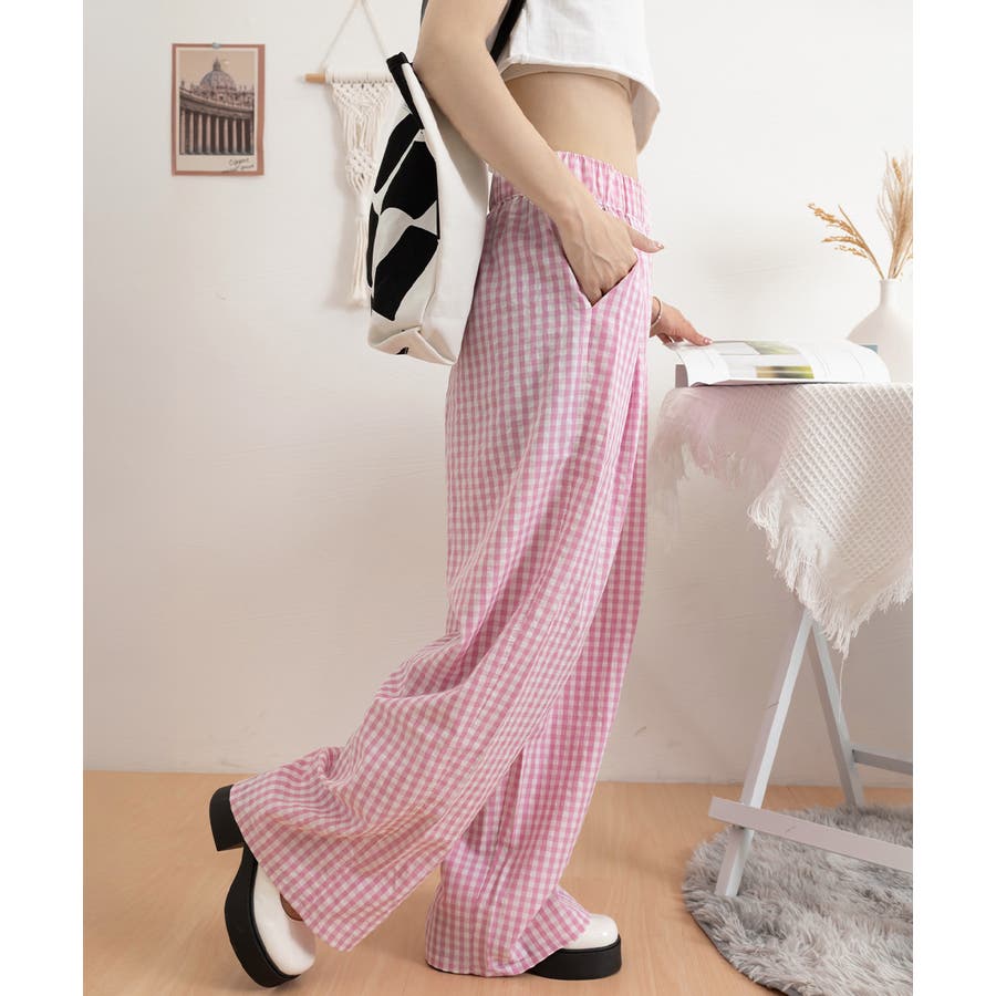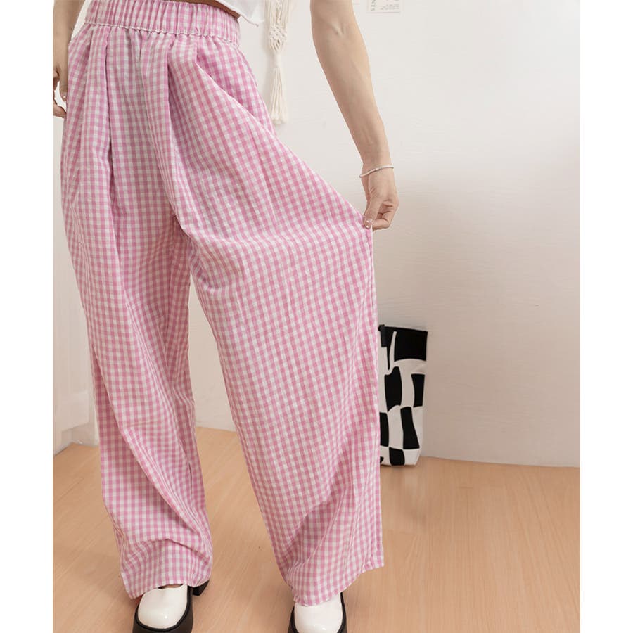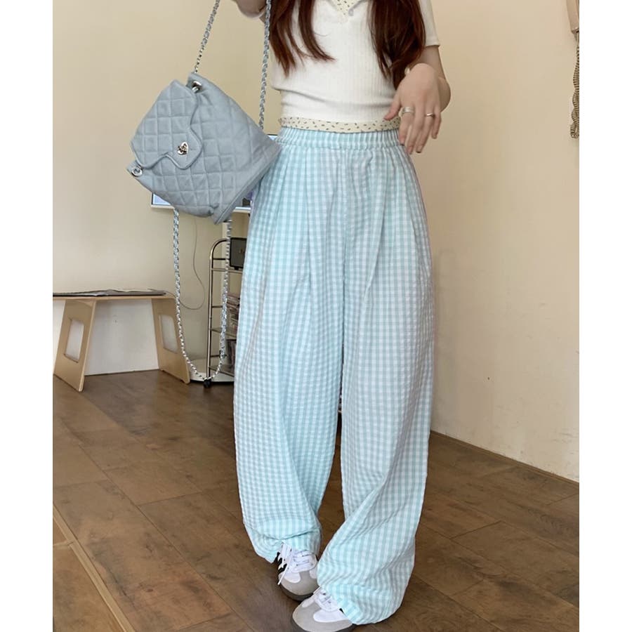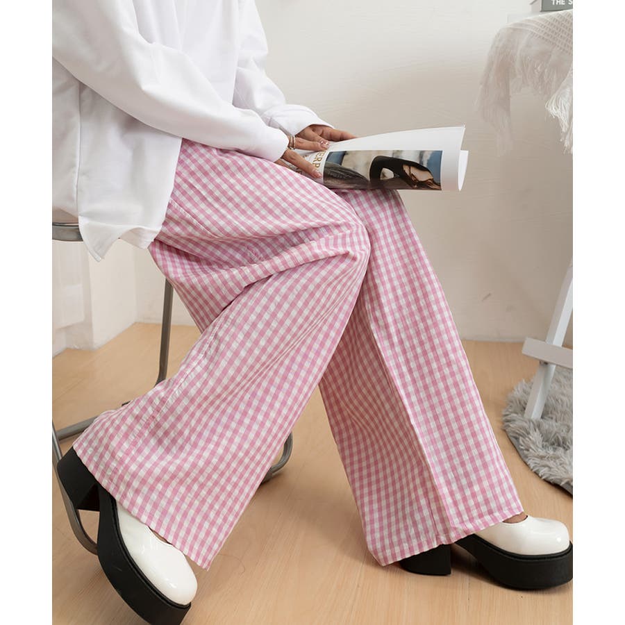 かわいらしいギンガムチェック柄の配色が春夏モードを盛り上げるワイドパンツ。