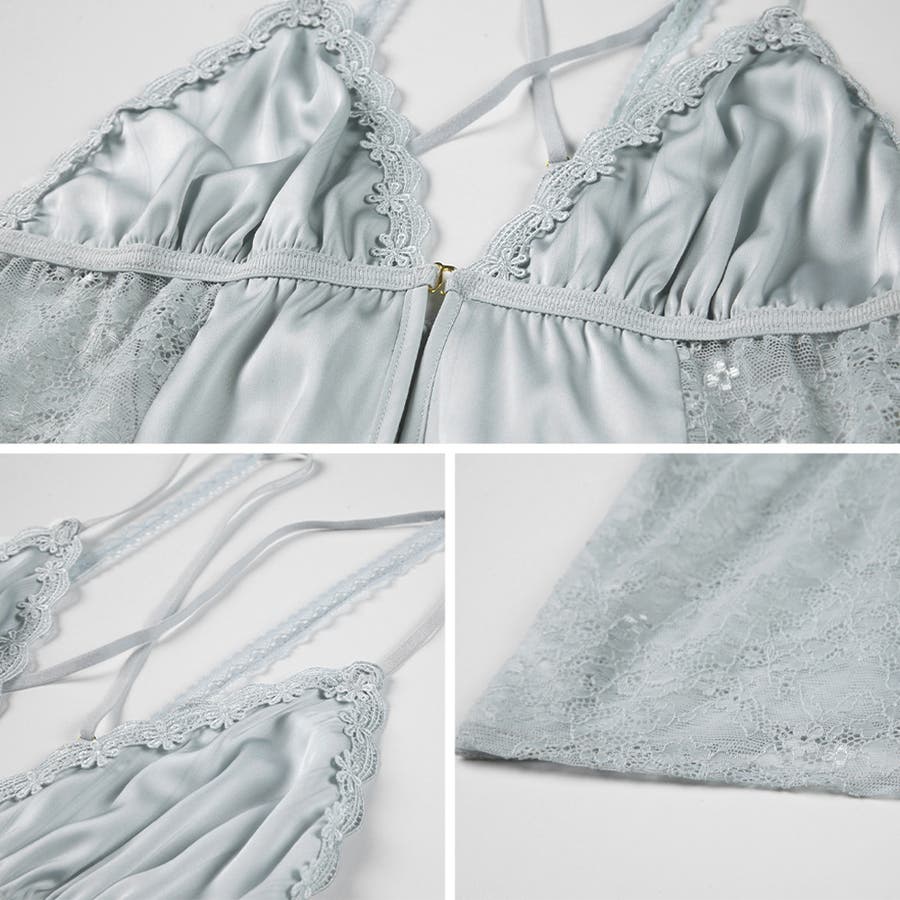 絹のようなサテン生地とレース切り替えがセクシーなキャミワンピースルームウェア