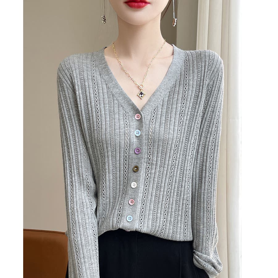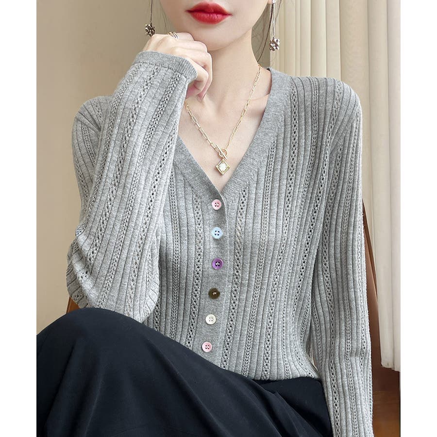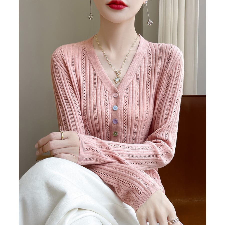 Vネックカーデ長袖 透け感ニット着回し 針抜きニット韓国風