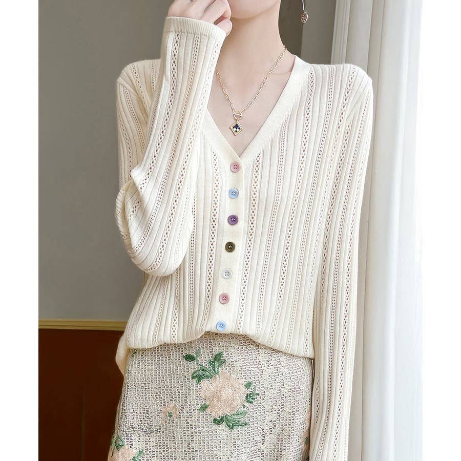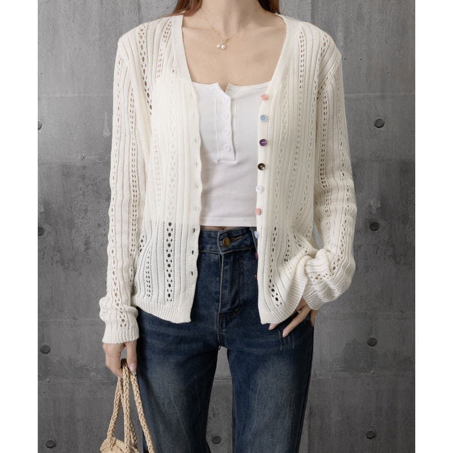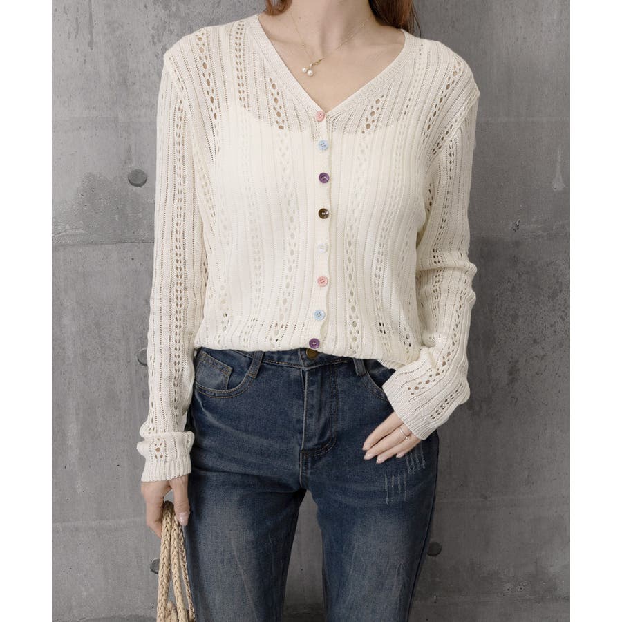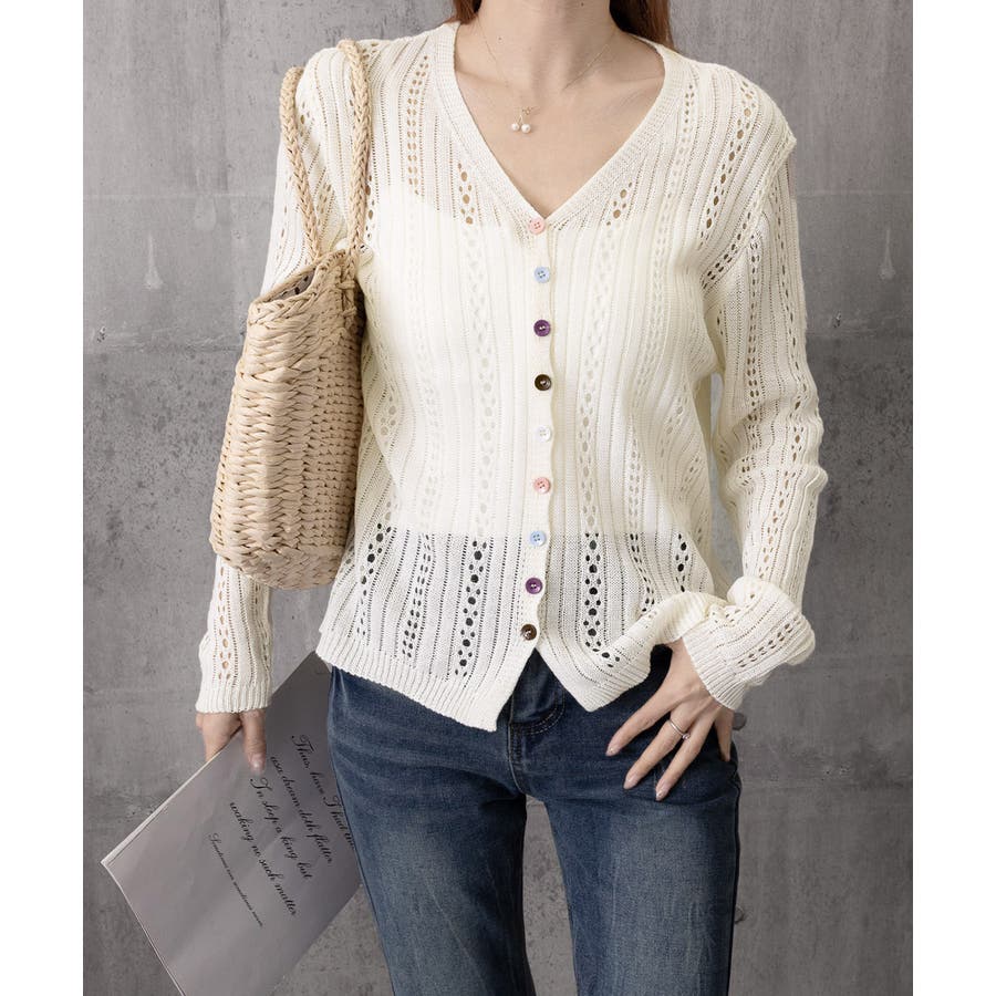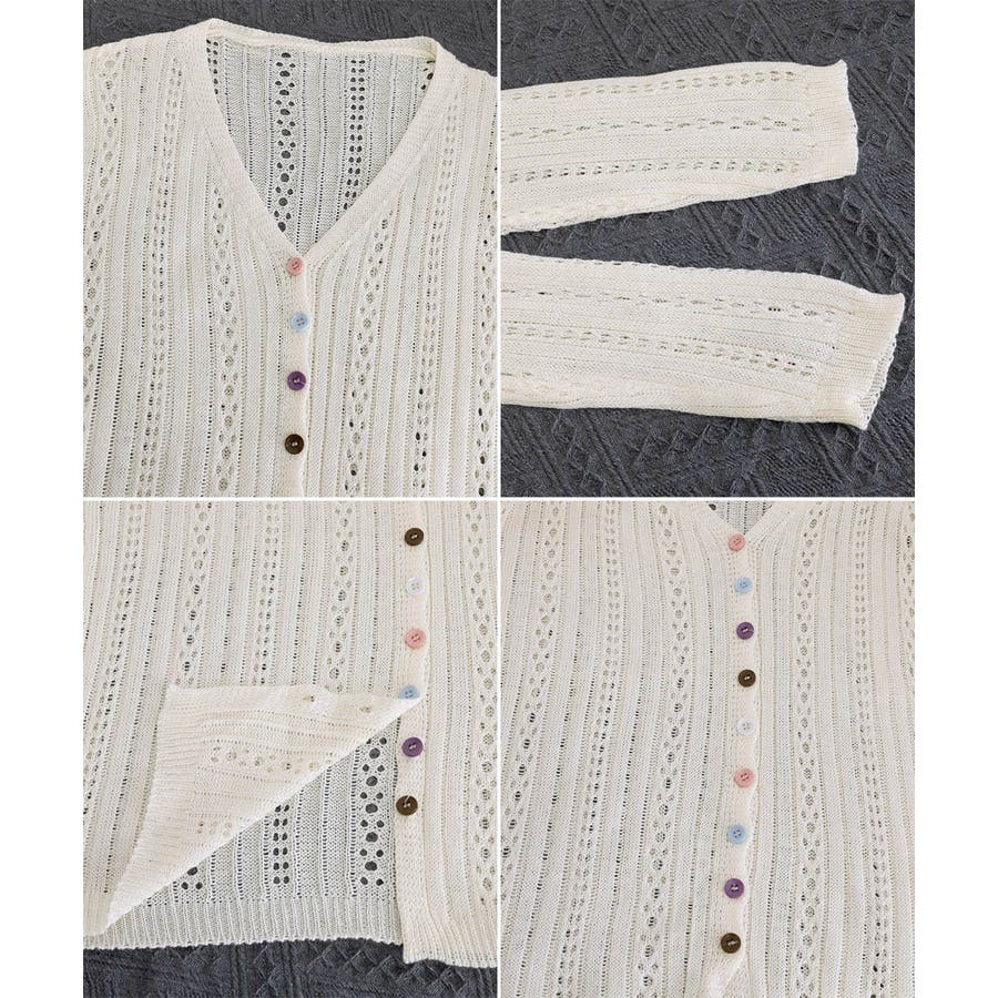 レディース カラーボタンパンチングニットカーデ 大人可愛いサマーニット羽織りきれ…