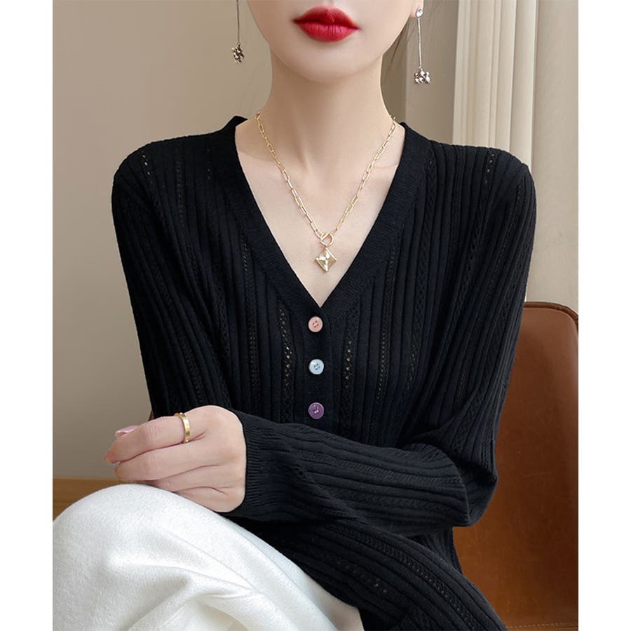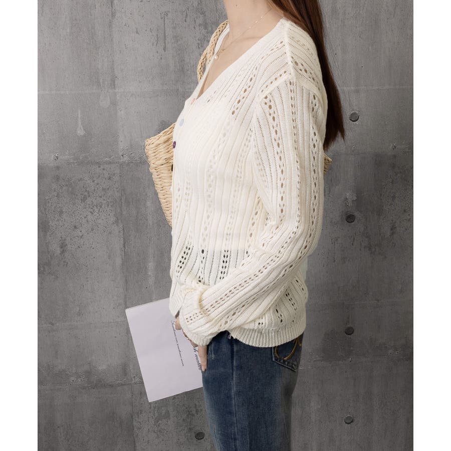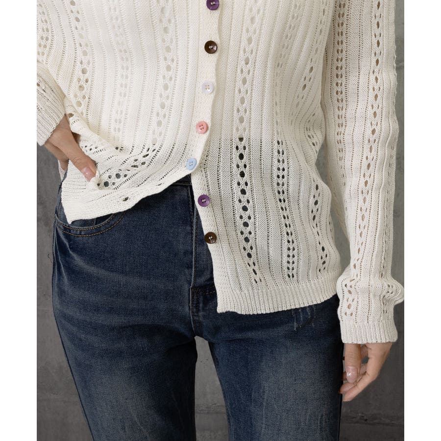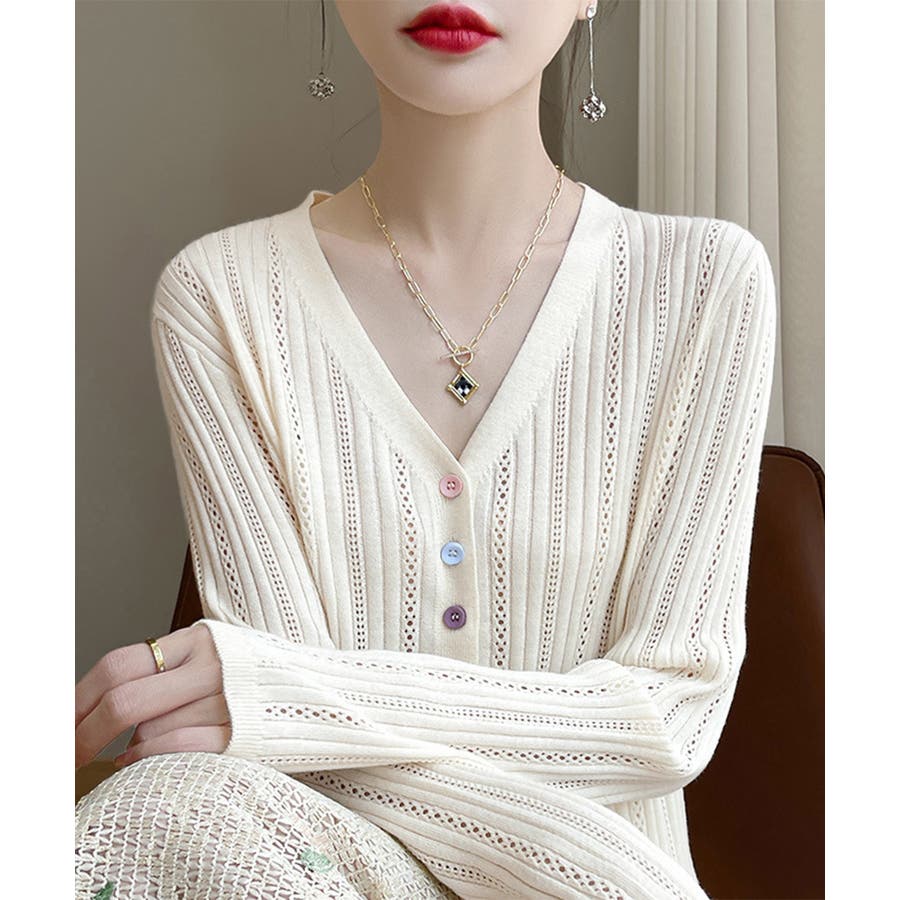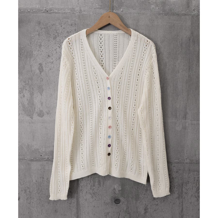 レディース カラーボタンパンチングニットカーデ 大人可愛いサマーニット羽織りきれ…