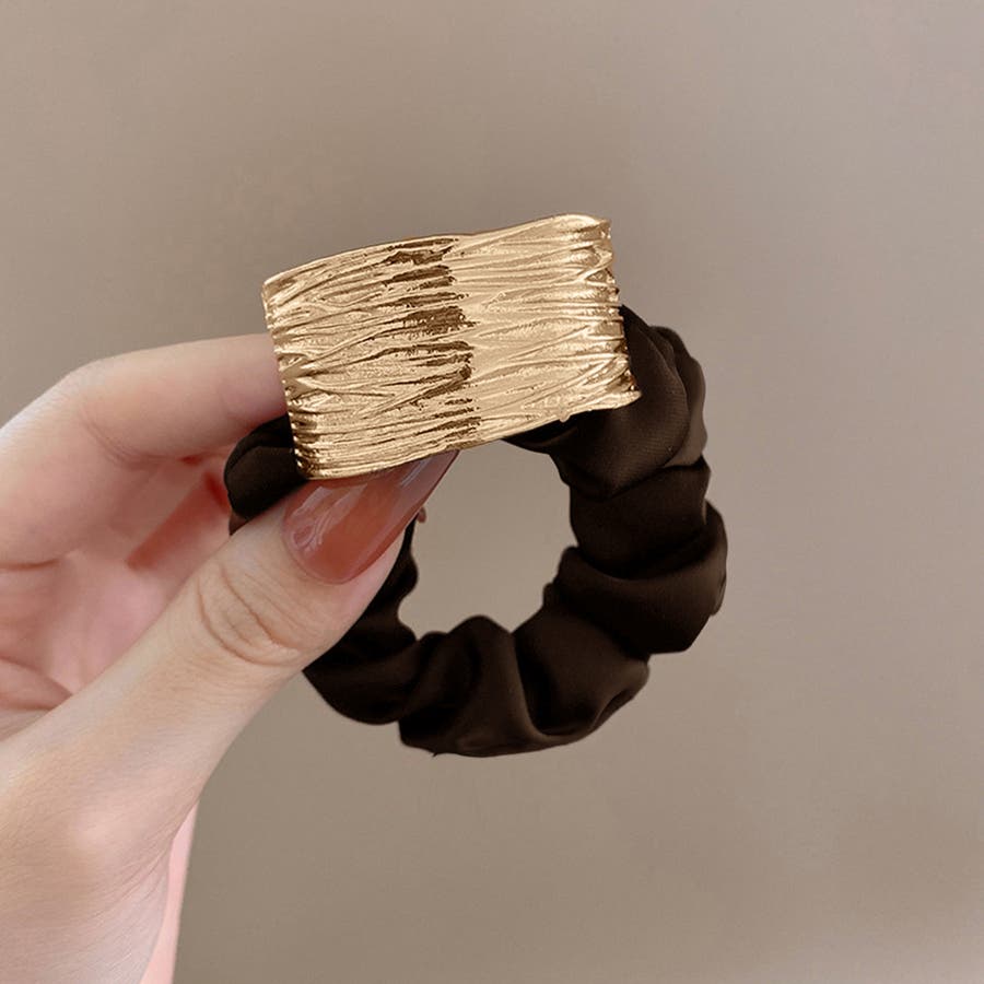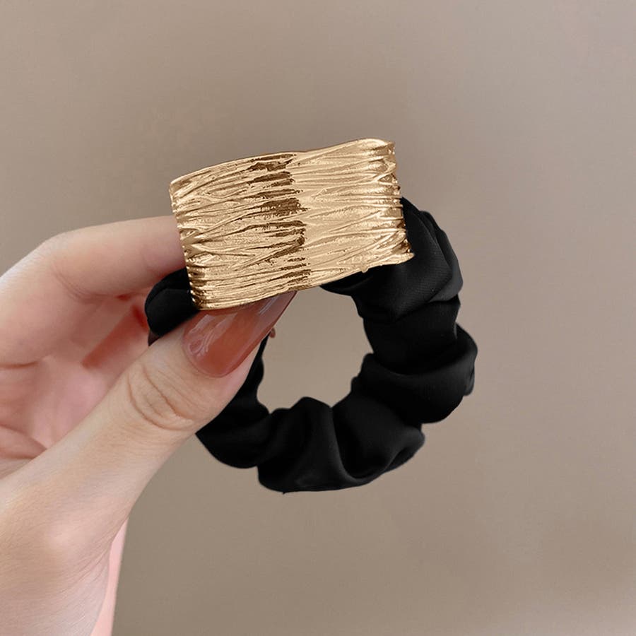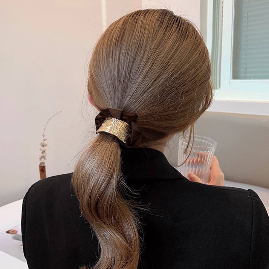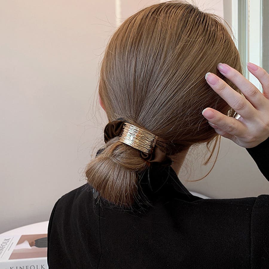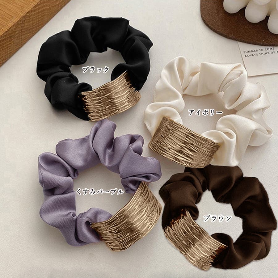 シンプルながらもきちんと感や上品な雰囲気を演出するゴールドプレート付きヘアゴム