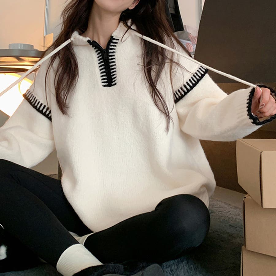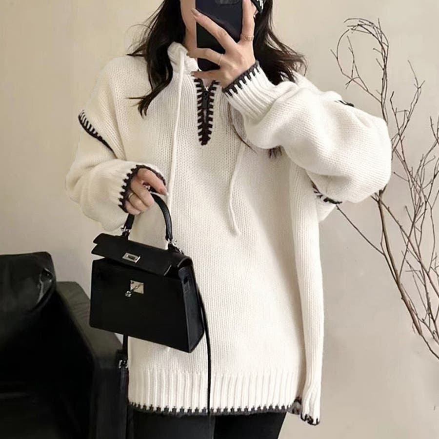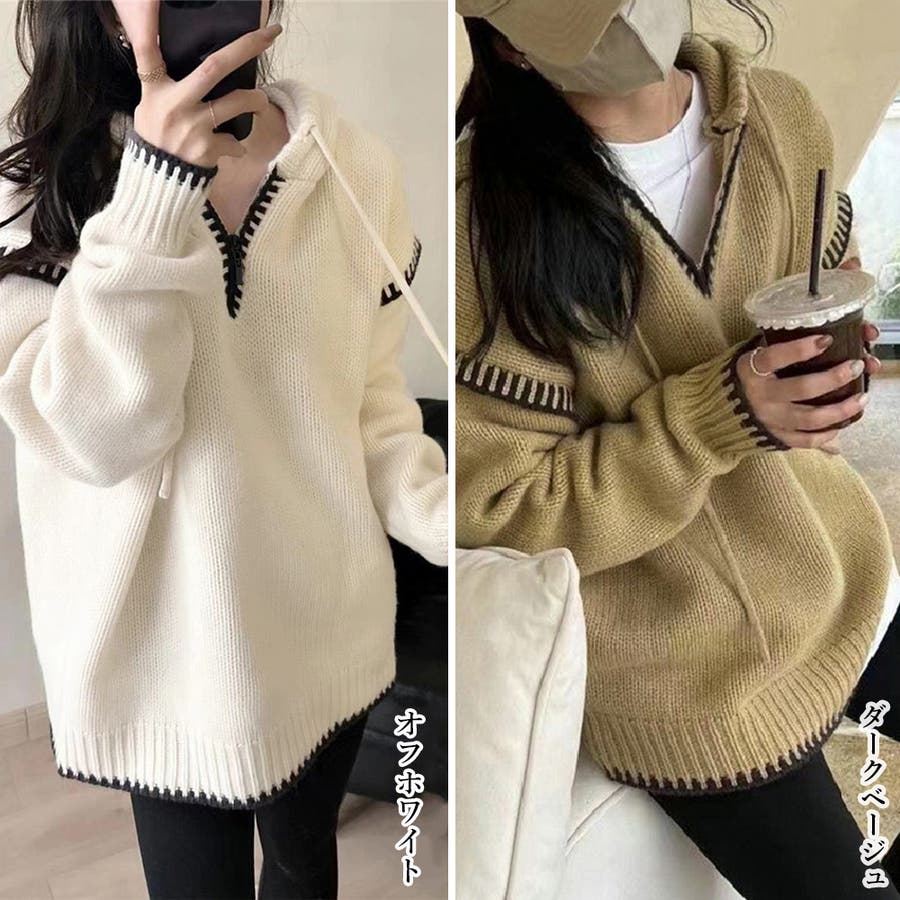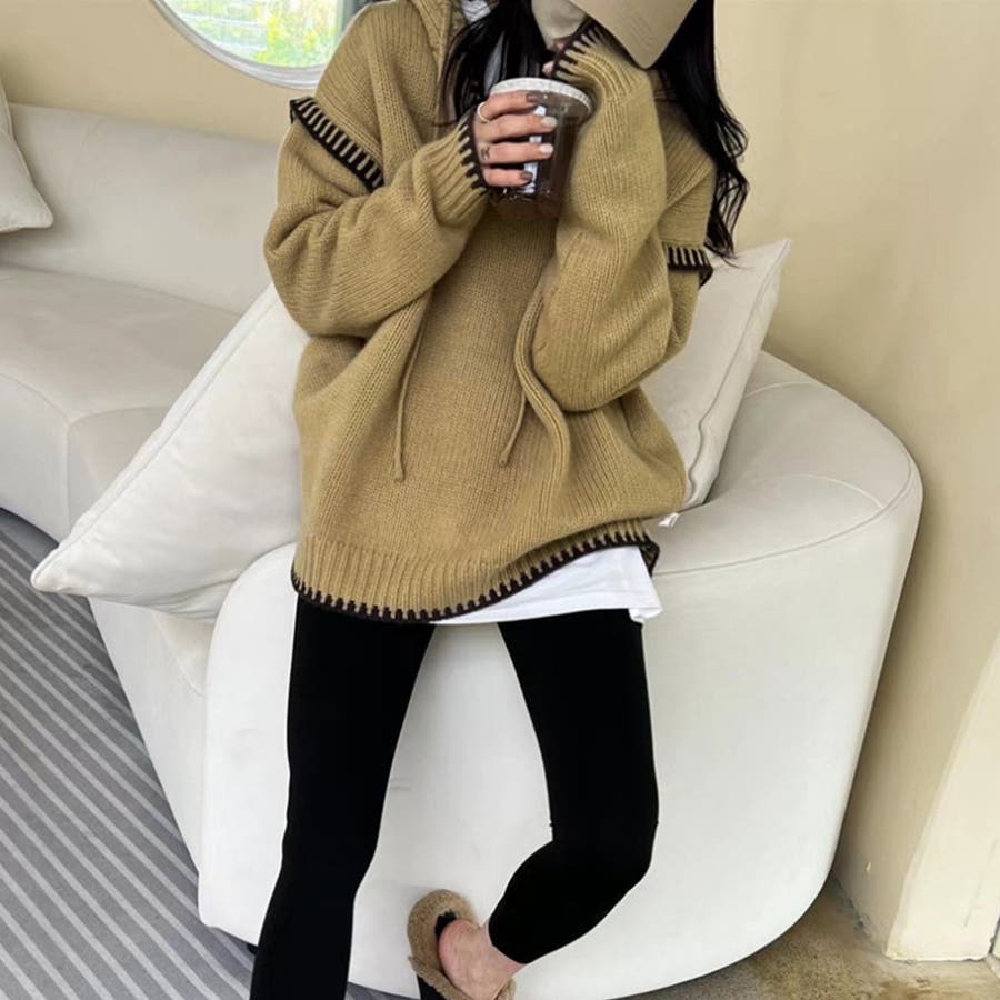 アースカラーで垢抜け間違いなし、ハーフジップが効いたルーズシルエットの韓国DESIGNの新作ニットパーカー